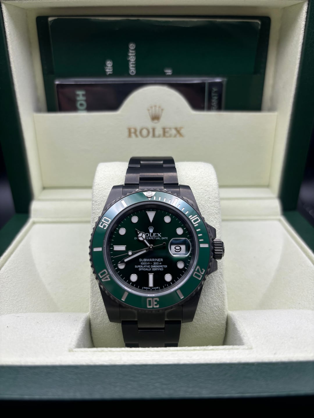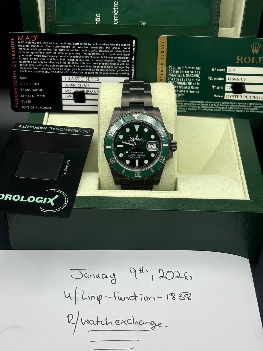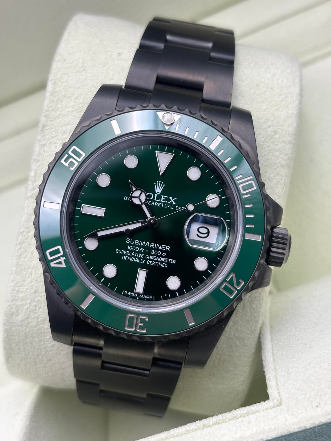 Hello all, Offered for sale is a 2010 Rolex Submariner 116610LV “Hulk”, a full complete set featuring a professionally applied aftermarket PVD coating for a stealth, all-black look. • Reference: 116610LV • Year: 2010 Condition: Great overall condition Dial/Bezel: Original green sunburst dial and green ceramic bezel Case/Bracelet: PVD-coated (aftermarket) – coating presents very well with light, normal wear consistent with careful use Movement: Rolex automatic, running strong with no known issues Set: Full complete set – inner & outer boxes, warranty card, booklets, tags, and all links + pvd coater cards This piece combines the collectability of an early Hulk with a unique, aggressive PVD aesthetic that really sets it apart from standard examples. Perfect for someone who wants a standout Submariner while still retaining the original Hulk DNA. 💰$16,500 USD shipped 📦 Securely packed and fully insured shipping included More than happy to FaceTime you to confirm the timepiece is fully within my hand and to securely complete the transaction! Wire/zelle preferred Thanks