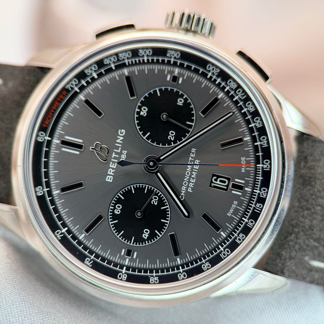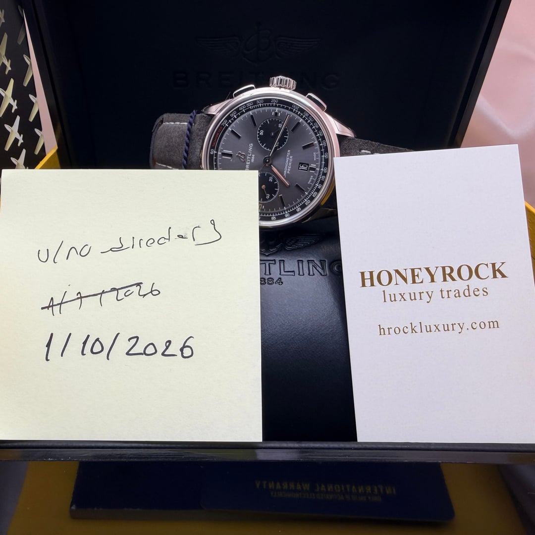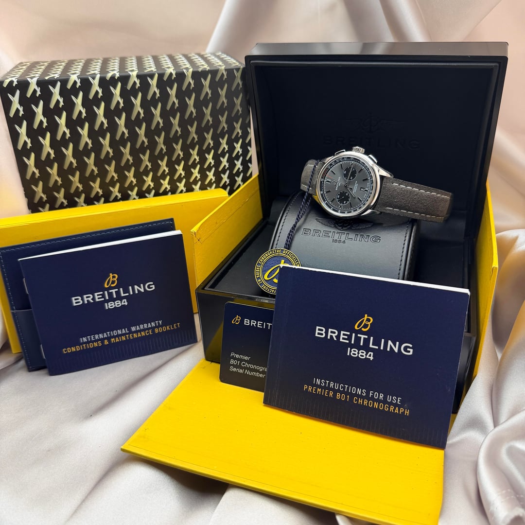 Breitling Premier B01 Chronograph 42 Ref. AB0118221B1X1 | Full Set | New / Unworn | Active Factory Warranty Original MSRP: $9,100 USD + tax Here for only $6950 + ship Offered for sale is the timeless Breitling Premier B01 Chronograph 42, a modern icon that combines refined vintage-inspired aesthetics with one of the finest in-house chronograph movements produced today. This example is presented in brand-new, unworn condition, with original factory protective stickers still intact, and is offered as a complete full set, exactly as delivered by Breitling. The 42mm stainless steel case features elegant pump chronograph pushers and a beautifully balanced anthracite/grey dial with contrasting black sub-dials, applied hour markers, and a discreet date at 6 o’clock. The design is both versatile and sophisticated, making it equally suitable for formal wear or daily use. Powering the watch is the Breitling Manufacture Caliber B01, a COSC-certified automatic chronograph movement with column wheel and vertical clutch architecture, offering exceptional precision and a 70-hour power reserve. The movement is visible through the sapphire exhibition case back. Year: 2022 Factory Warranty ✅ Breitling International Warranty valid until August 12, 2027, providing multiple years of factory coverage and complete peace of mind. Condition • New / unworn • Factory stickers intact • No marks, scratches, or signs of wear Set Includes • Breitling Premier B01 Chronograph 42 watch • Original Breitling inner & outer boxes • International warranty booklet • Instruction manual • COSC chronometer tag • All original accessories An outstanding opportunity to acquire a brand-new Breitling Premier B01 at a compelling value, complete with years of active factory warranty remaining.