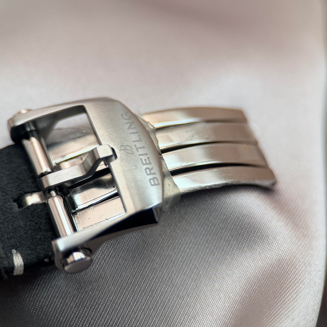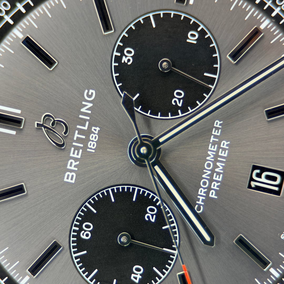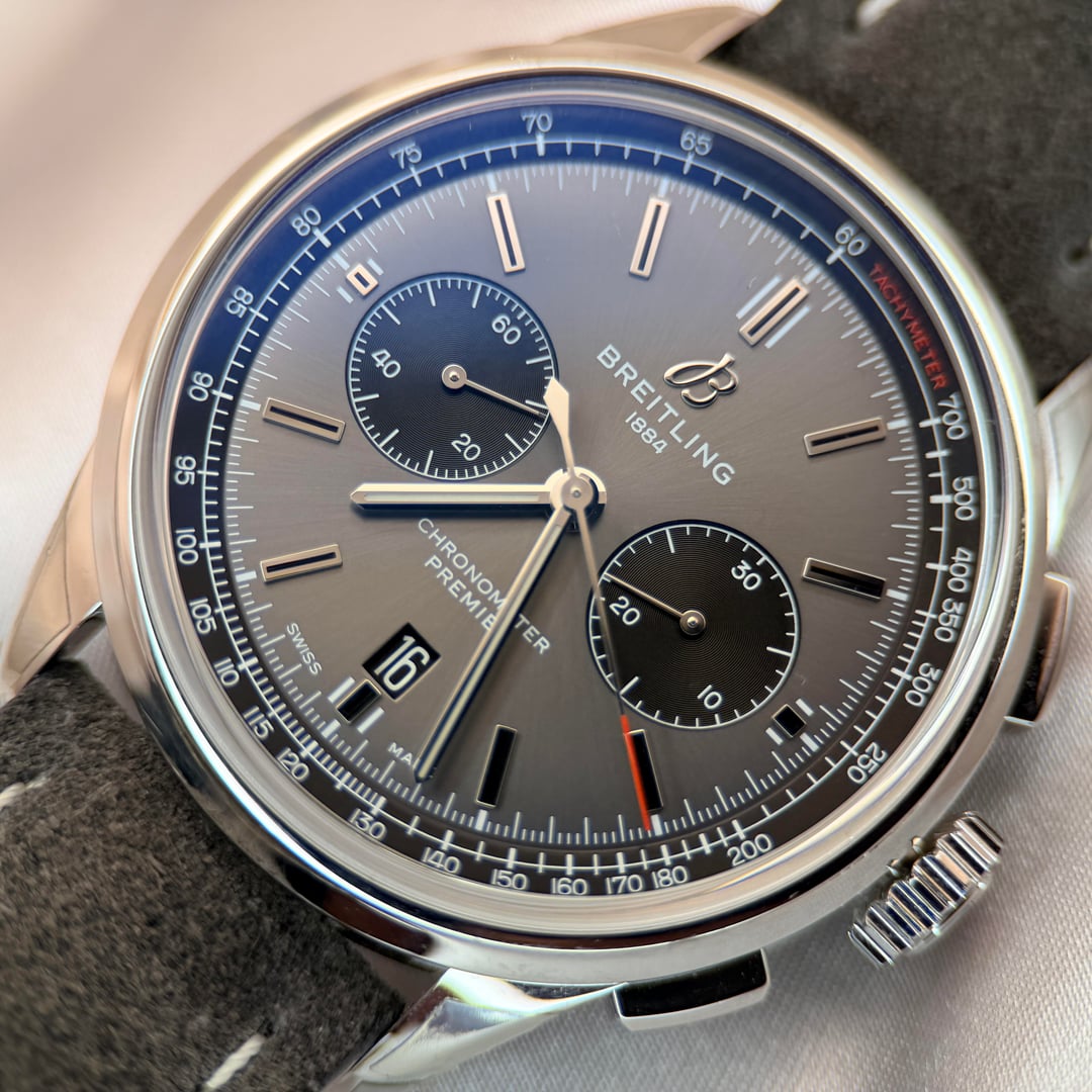 Breitling Premier B01 Chronograph 42 Ref. AB0118221B1X1 | Full Set | New / Unworn | Active Factory Warranty Original MSRP: $9,100 USD + tax Here for only $6950 + ship Offered for sale is the timeless Breitling Premier B01 Chronograph 42, a modern icon that combines refined vintage-inspired aesthetics with one of the finest in-house chronograph movements produced today. This example is presented in brand-new, unworn condition, with original factory protective stickers still intact, and is offered as a complete full set, exactly as delivered by Breitling. The 42mm stainless steel case features elegant pump chronograph pushers and a beautifully balanced anthracite/grey dial with contrasting black sub-dials, applied hour markers, and a discreet date at 6 o’clock. The design is both versatile and sophisticated, making it equally suitable for formal wear or daily use. Powering the watch is the Breitling Manufacture Caliber B01, a COSC-certified automatic chronograph movement with column wheel and vertical clutch architecture, offering exceptional precision and a 70-hour power reserve. The movement is visible through the sapphire exhibition case back. Year: 2022 Factory Warranty ✅ Breitling International Warranty valid until August 12, 2027, providing multiple years of factory coverage and complete peace of mind. Condition • New / unworn • Factory stickers intact • No marks, scratches, or signs of wear Set Includes • Breitling Premier B01 Chronograph 42 watch • Original Breitling inner & outer boxes • International warranty booklet • Instruction manual • COSC chronometer tag • All original accessories An outstanding opportunity to acquire a brand-new Breitling Premier B01 at a compelling value, complete with years of active factory warranty remaining.