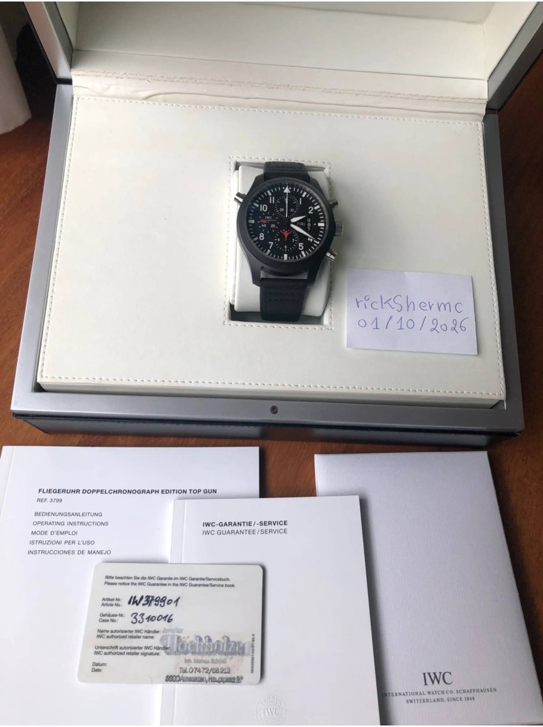IWC Pilot's Watch Double Chronograph Edition TOP GUN, with original box and papers, excellent condition Ref. No. 379901, Case No. 3310016 Runs perfectly. Price: $4,200 Shipped