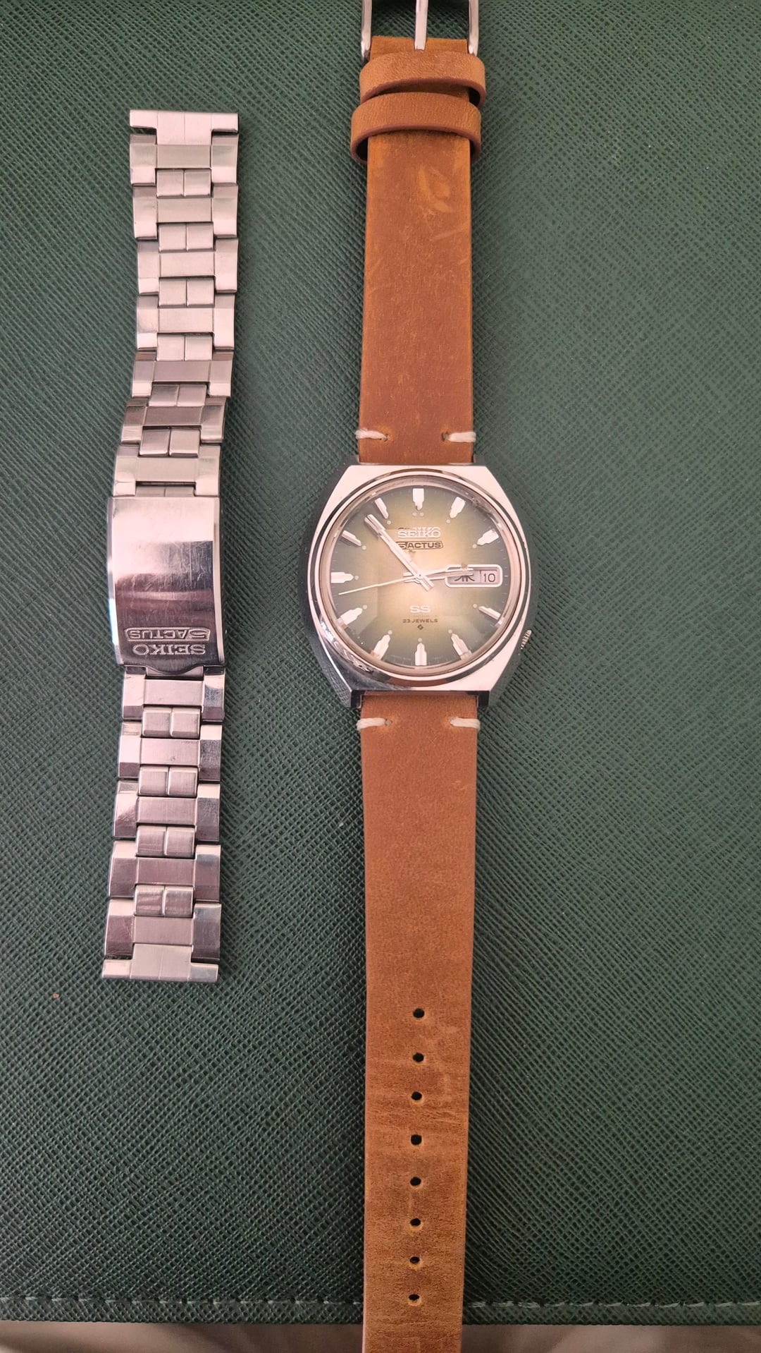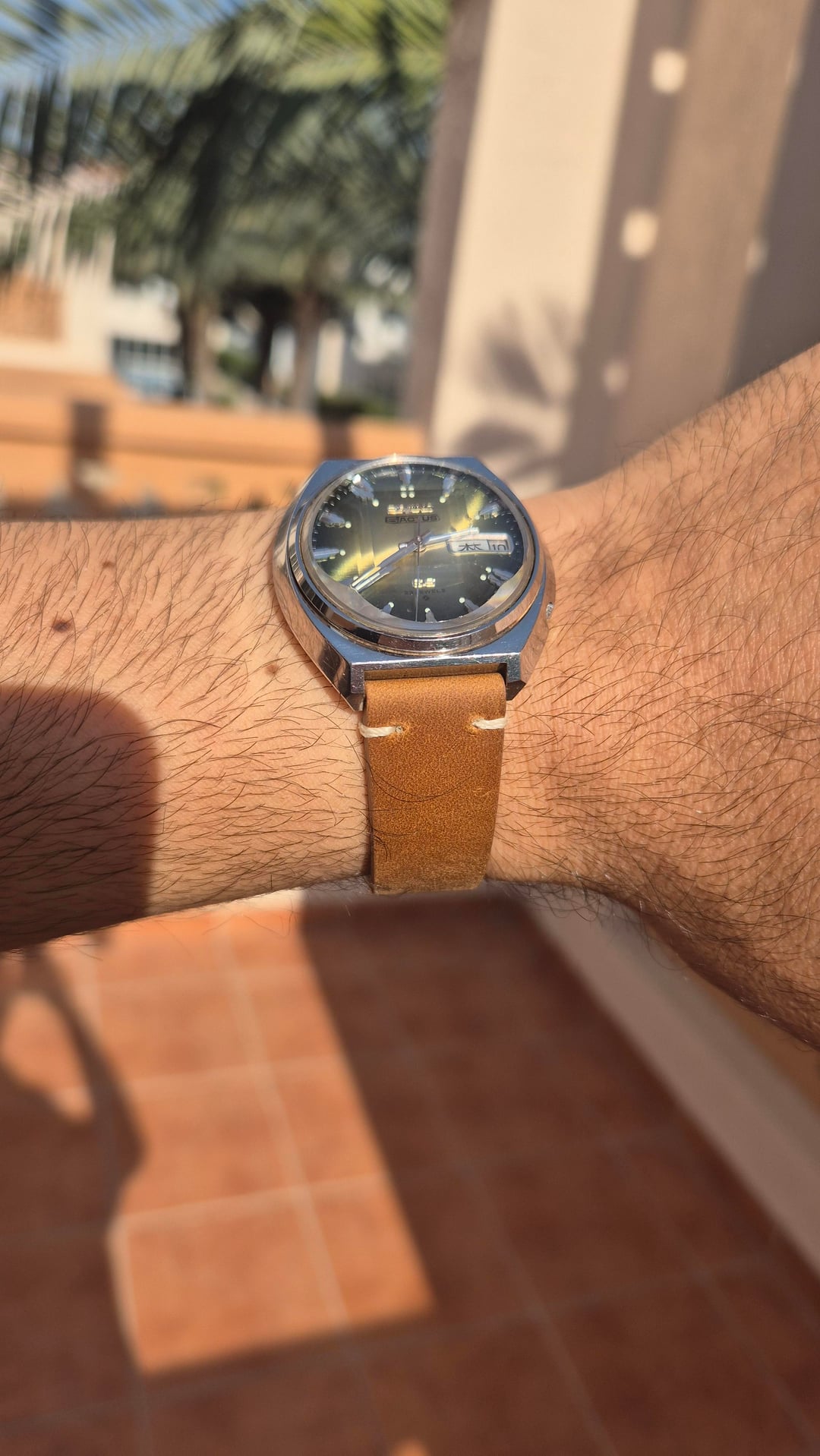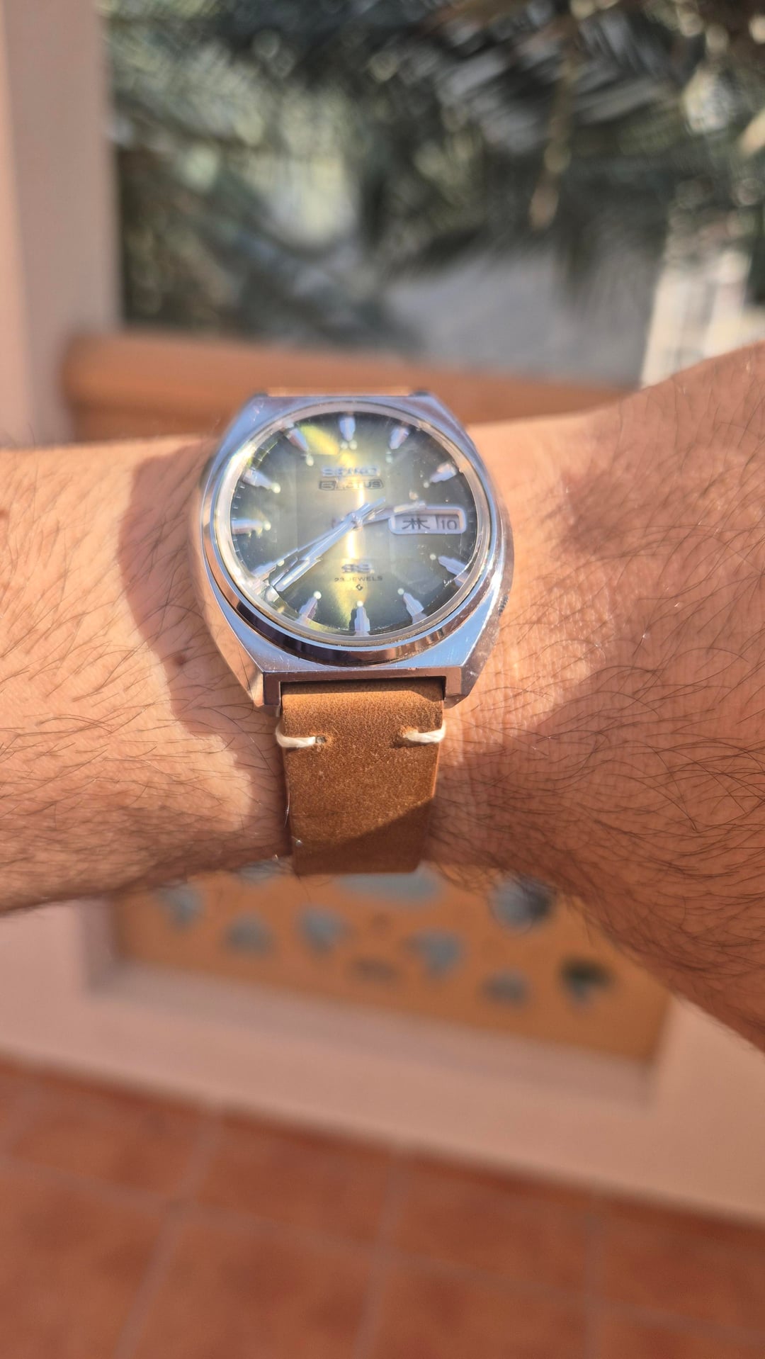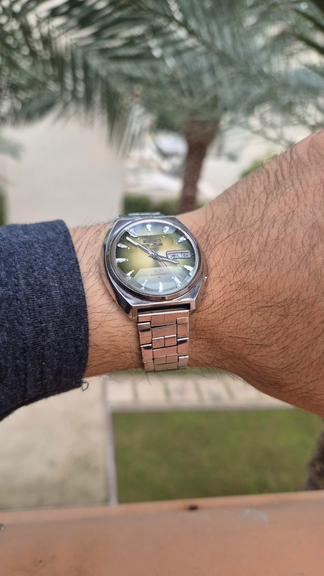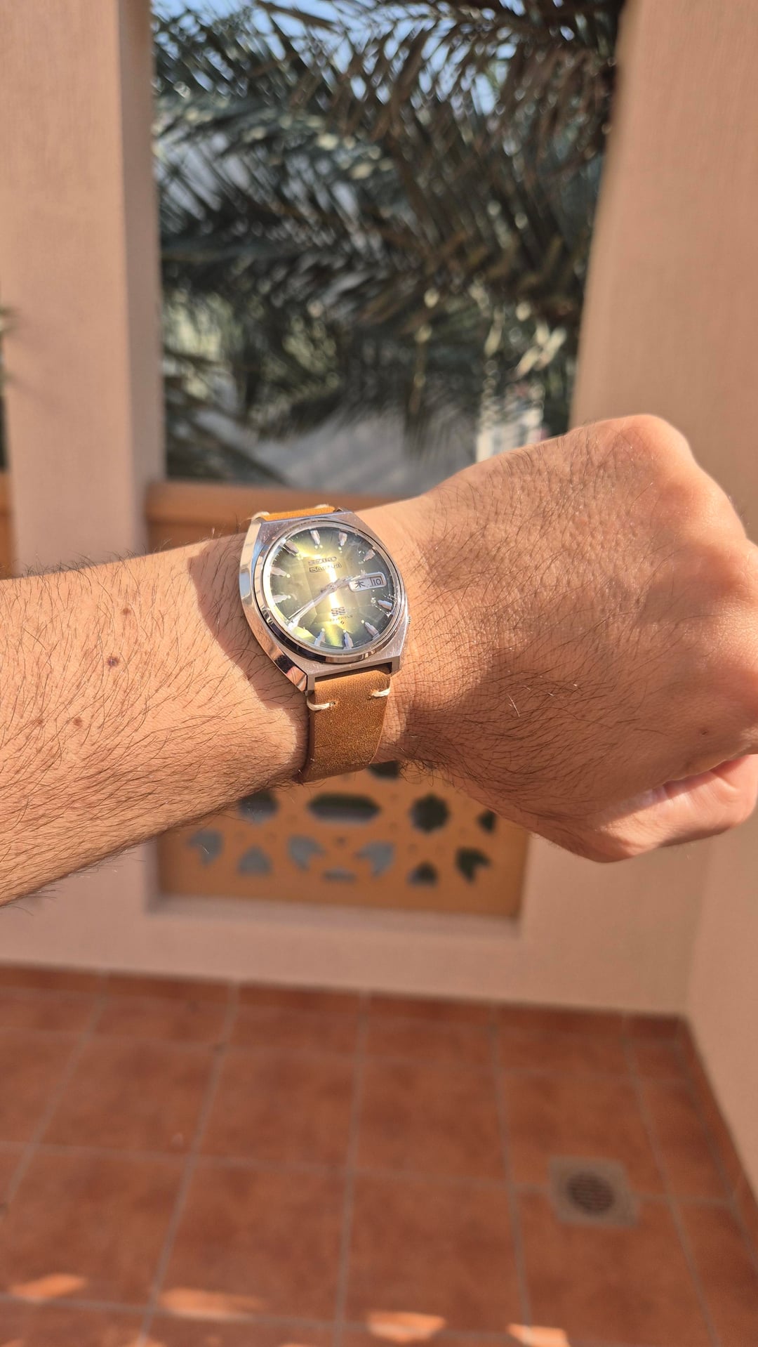 A nice example of 70s Seiko coolness with the sunburst green dial and faceted crystal. The crystal has 2 minor chips on the center as can be seen on the photos and 2 minor scratches on 2 o'clock. Keeping these crystals scratch free is very difficult- still they are very cool especially under the sun. Case is 38mm wide and lug to lug is 40mm. Overall very clean case It comes with the original steel bracelet and clasp as you can cross check from the 1974 seiko catalogue in final picture. It is very clean and comfortable, supports upto 17.5 cm wrists (6.9 inches). I also alternate with the vintage leather strap which is brand new. I will send that along as well. I do not know the service history (I bought this a year ago from Japan) and exact accuracy but works perfectly for me on daily basis, keeps time well enough (less than 1m deviation on daily as i observed) as I alternate in the collection. The quick set for day and date works fine. It has Kanji and English for days. Asking 200$ + shipment($35). Custom duties per location not included. Shipping from Dubai, will send worldwide. Accepting paypal. Thanks for checking it!