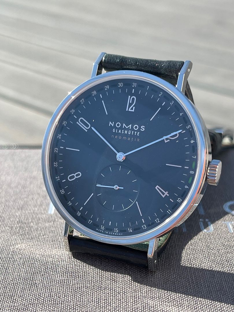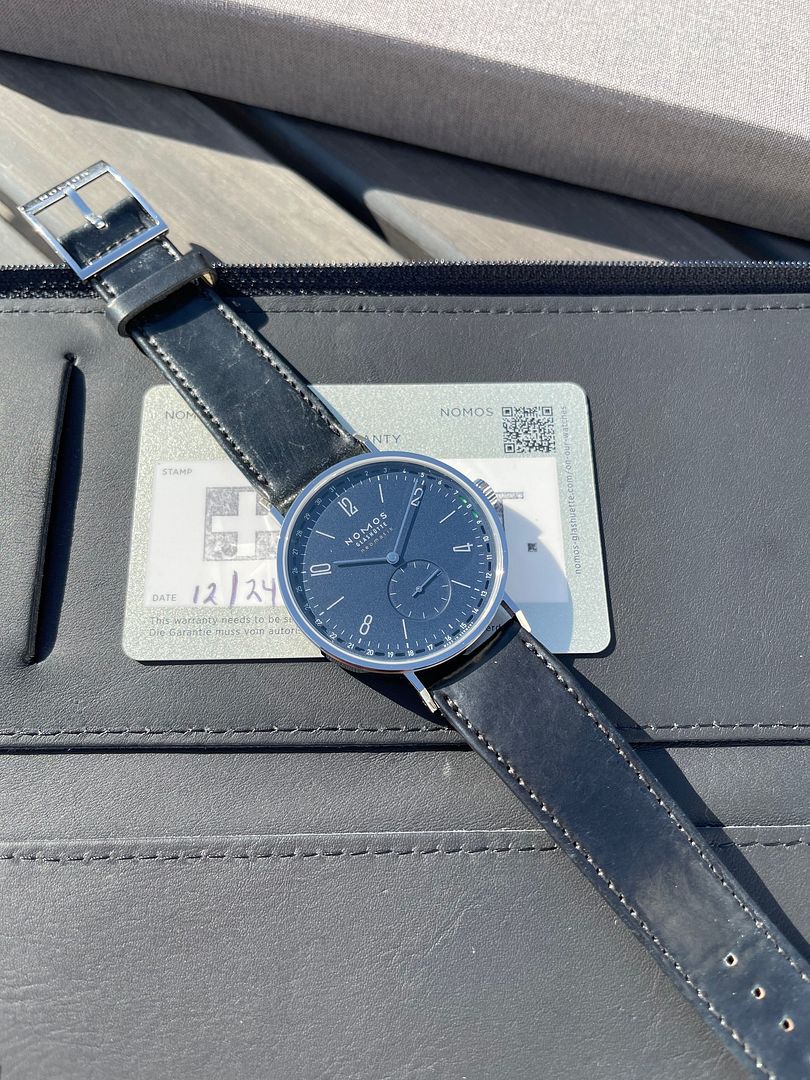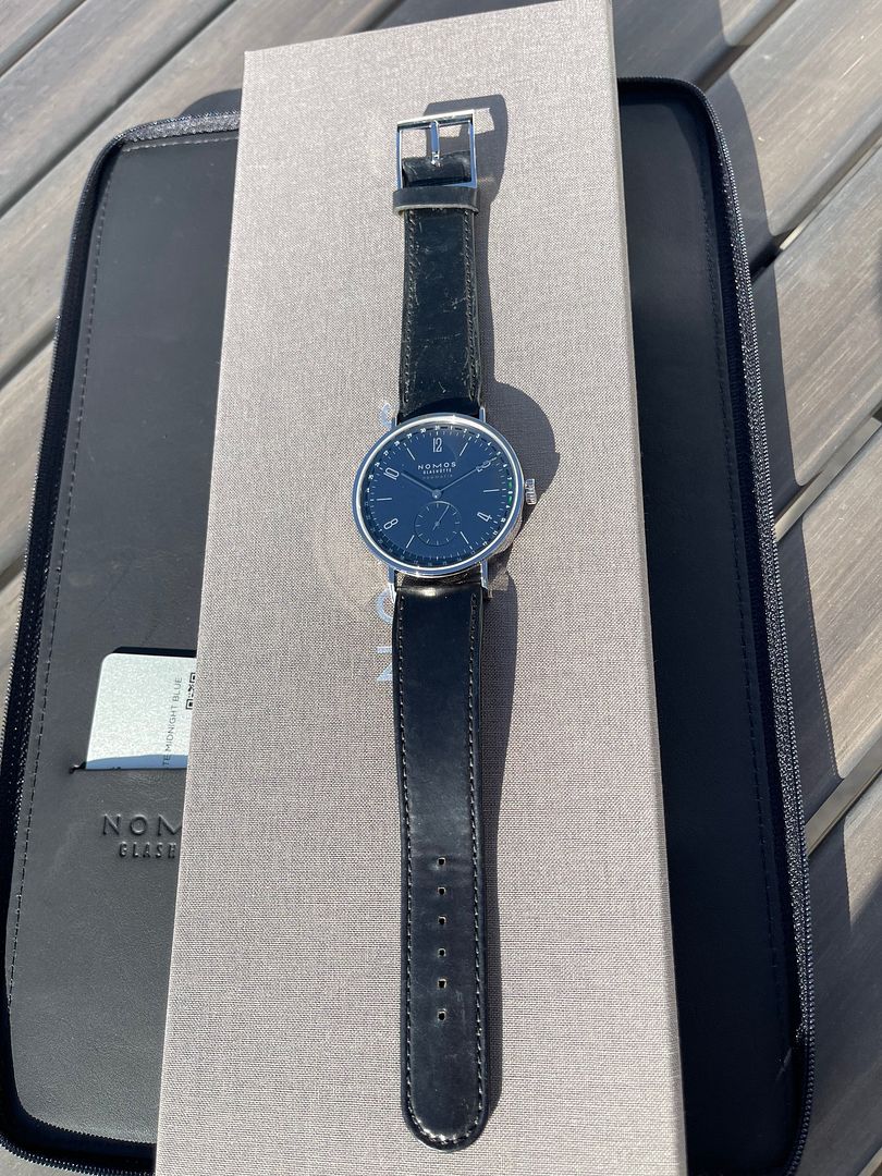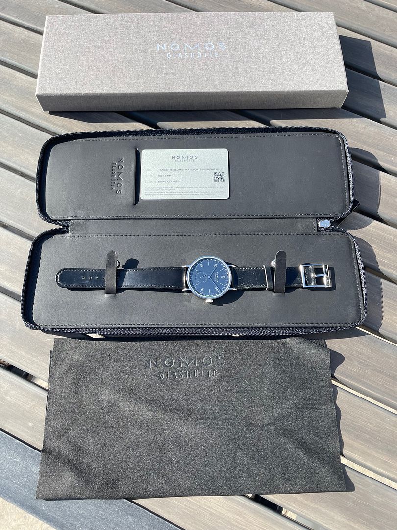 Up for sale is my Near Mint (95% TZ) Nomos Neomatic Tangente Neomatic Midnight Blue 40.5mm Automatic watch on black horween leather with tang buckle. Watch was purchase new from an AD 12/2024, warranty card stamped and dated, included is everything seen in pics. Watch is in superb condition, running apot on and was only worn indoors once a few times, please refer to pictures for true accurate representation. Refs on all of the forums under dpj17 except WUS where I was locked out of my account due to an error and had to re-register under dpj1978.