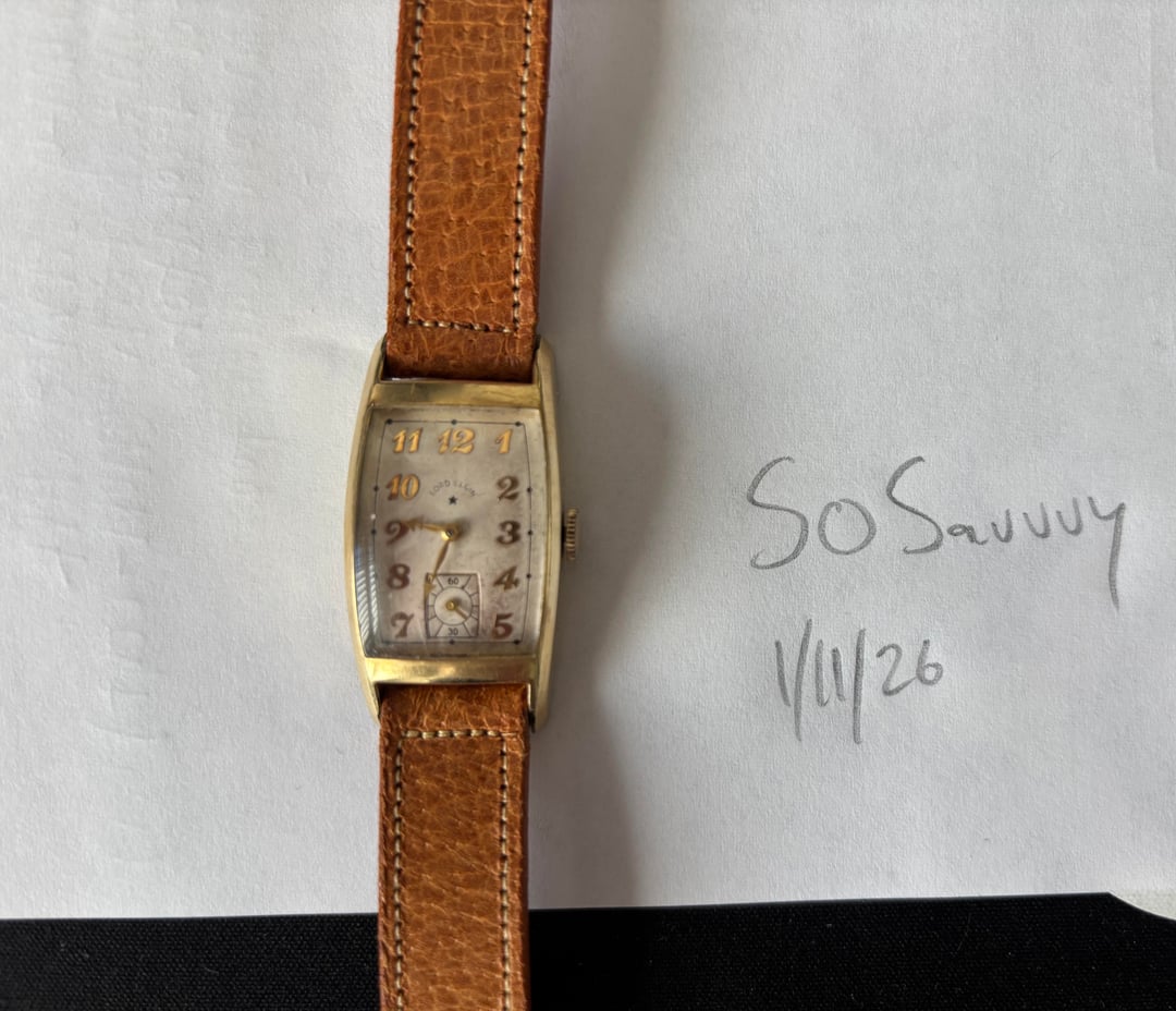 For sale is a vintage Lord Elgin rectangular dress watch, a beautiful example of American watchmaking from the late 1930s–1940s. This piece features a classic Art Deco–inspired case with stepped lugs and a timeless rectangular profile that wears elegantly on the wrist. The watch is powered by a manual-wind Elgin mechanical movement and features a small seconds subdial at 6 o’clock, applied Arabic numerals, and blued steel seconds hand. The dial displays attractive, even patina consistent with age and has not been refinished. Case appears to be gold-filled, which was standard for Lord Elgin models of this era. Condition is good vintage condition. The case shows honest wear and brassing consistent with age. Dial has visible patina and spotting, which adds to the vintage character. Acrylic crystal shows light wear but remains clear. The watch is currently running (no timing guarantees given age). Comes fitted on a modern brown leather strap. Asking $200 shipped CONUS, OBO