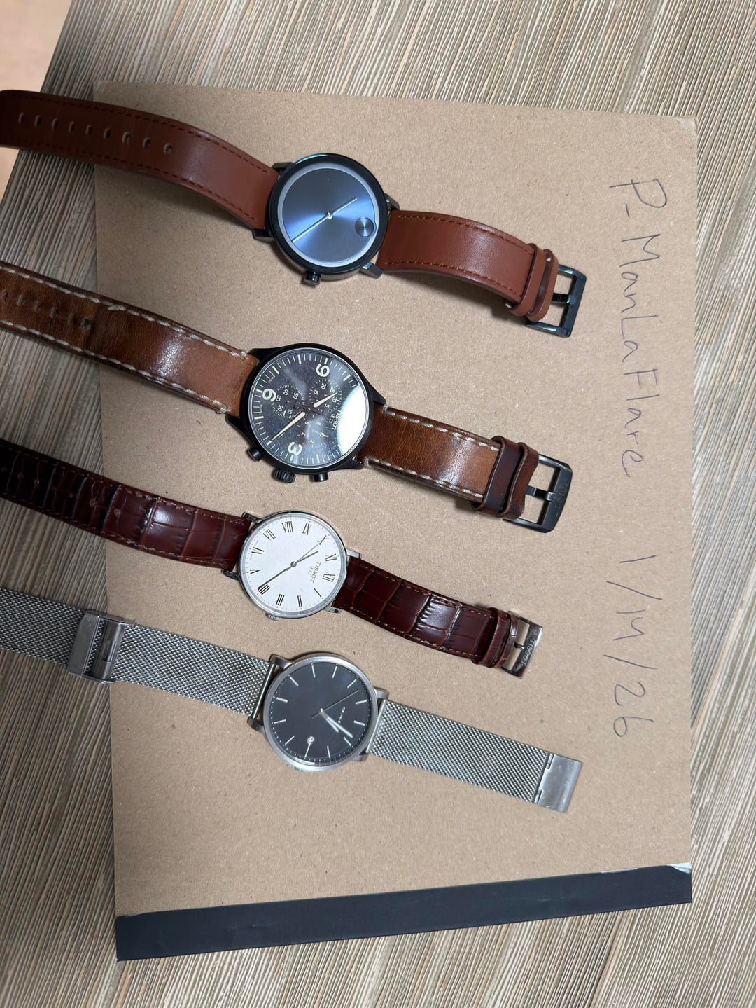 Selling a few old affordable pieces as my collection is evolving to a good home! Let me know if you have any questions at all. From left to right in the first picture: Movado Bold Evolution (reference MB.01.1.34.6476) in excellent condition. I have barely worn this one and the band is in good shape as is the case, quartz movement is running well with no issues right now. Asking $230 Skagen Hagen Steel Mesh (reference SKW6314) with quartz movement. Battery needs to be replaced on this one but it’s in decent shape otherwise, has an adjustable mesh bracelet. Asking $65 Tissot Chrono XL (reference T1166173605700) with a quartz movement. Battery is running and keeping good time, the band shows a good amount of wear and there are some scratches and chips on the case. Asking $150 Tissot Everytime 38mm (reference T1094101603300) dress watch in great shape! Haven’t worn this one a bunch either but definitely some wear on the strap, quartz movement running well now. Asking $175 Please inspect photos and message me if you want any more, all sales final as is. Thanks a ton!
