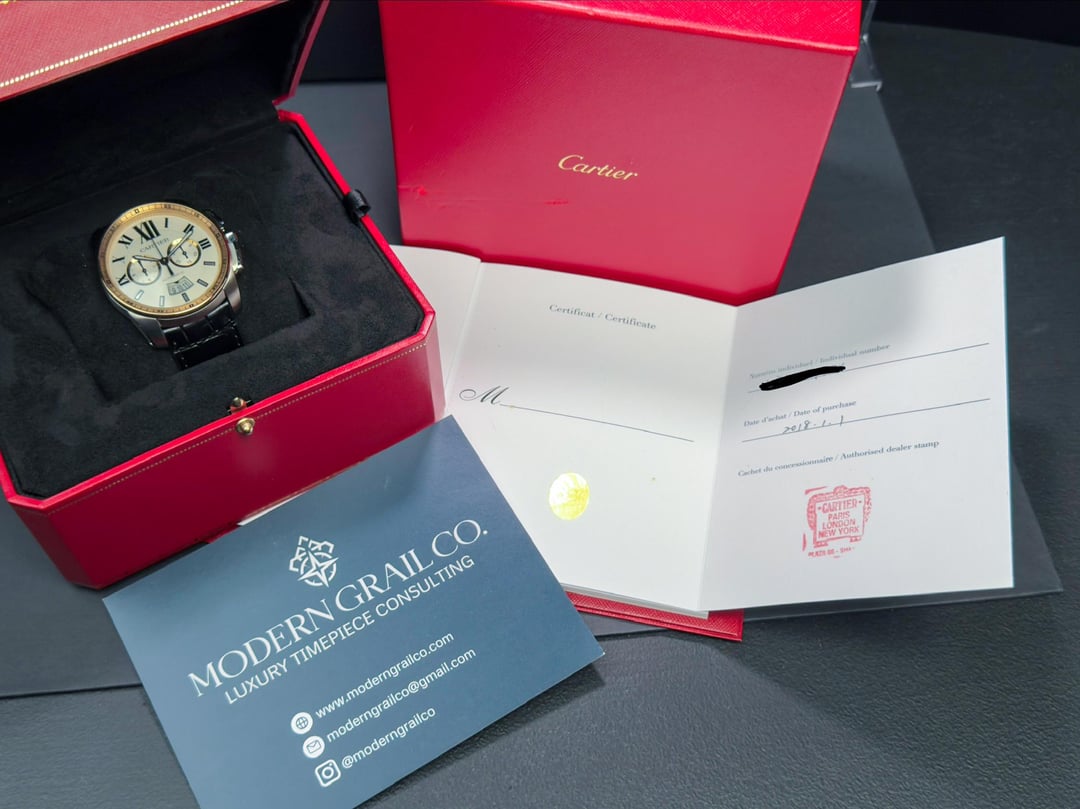 This is Cartier doing sport luxury the right way. The **Calibre de Cartier Chronograph** has real wrist presence, but still carries that Cartier elegance. The white dial pops against the rose gold accents, and the in-house chronograph gives it substance beyond the looks. It feels confident, refined, and versatile. The kind of watch that works well with a blazer as it does casually. Full set, well cared for, and one of those pieces that quietly elevates everything you wear. **Reference #: W710043** **Presented as a full set - includes outer and inner box, and papers.** **Condition:** The case shows light, superficial surface marks consistent with careful wear. No deep scratches, dents, or damage. Bezel and rose gold components remain sharp and well-defined. Crystal is clean with no chips or cracks. Dial and hands are excellent with no discoloration. Chronograph functions properly and resets as intended. Alligator strap like new. **Asking - $7600 plus shipping within the CONUS** **Timestamp**: [https://imgur.com/a/baE7TO7](https://imgur.com/a/baE7TO7) Watches are **shipped fully insured with FedEx Priority Overnight.** To protect your purchase, all watches will be shipped to the nearest FedEx shipping location and will require a signature on pick-up. **Wire or Zelle preferred.** I’m new to selling on Reddit and happy to do a FaceTime to show you the watch and answer any questions! Follow us on Instagram u/moderngrailco or visit our website at [www.moderngrailco.com](http://www.moderngrailco.com/)