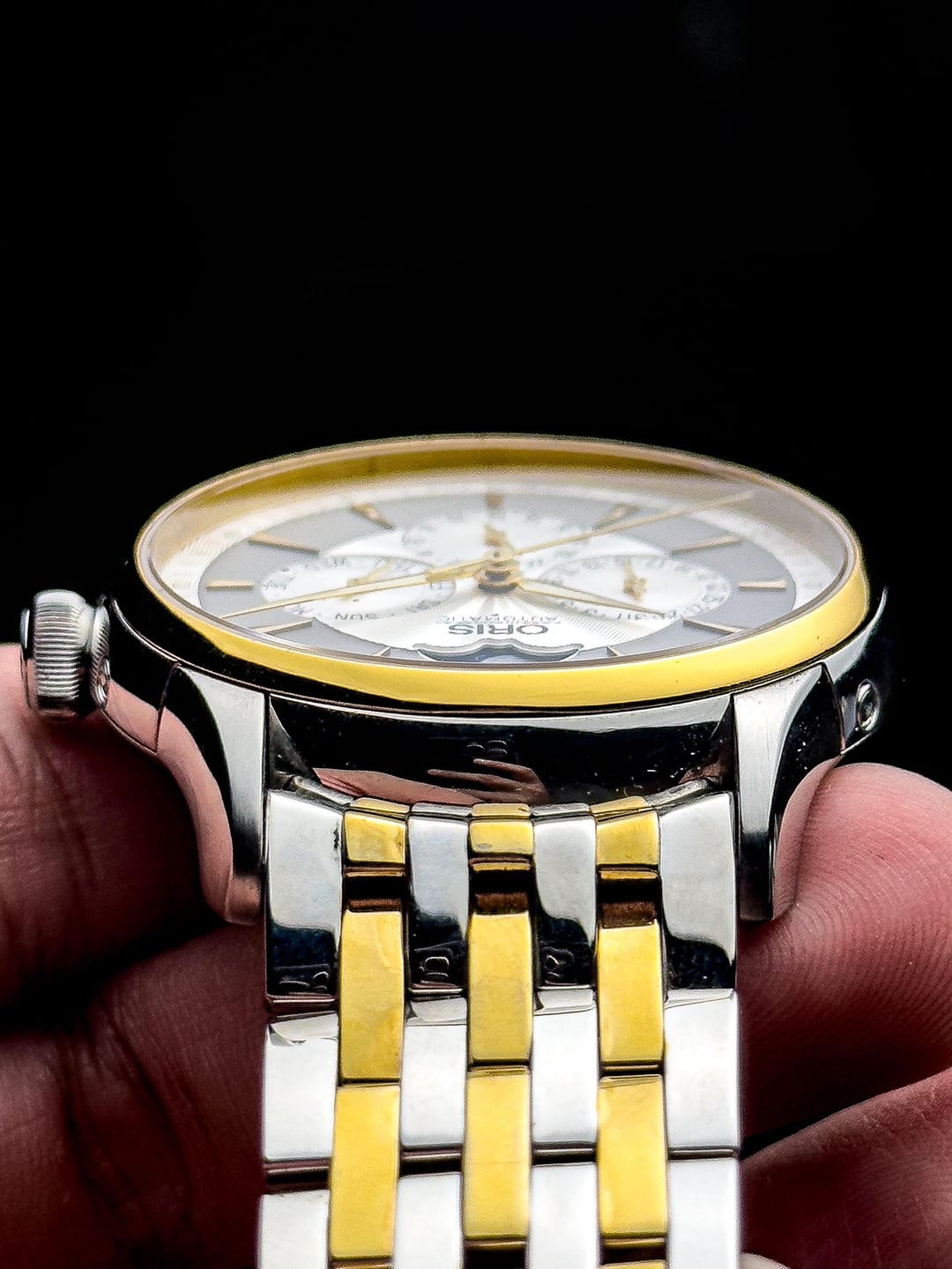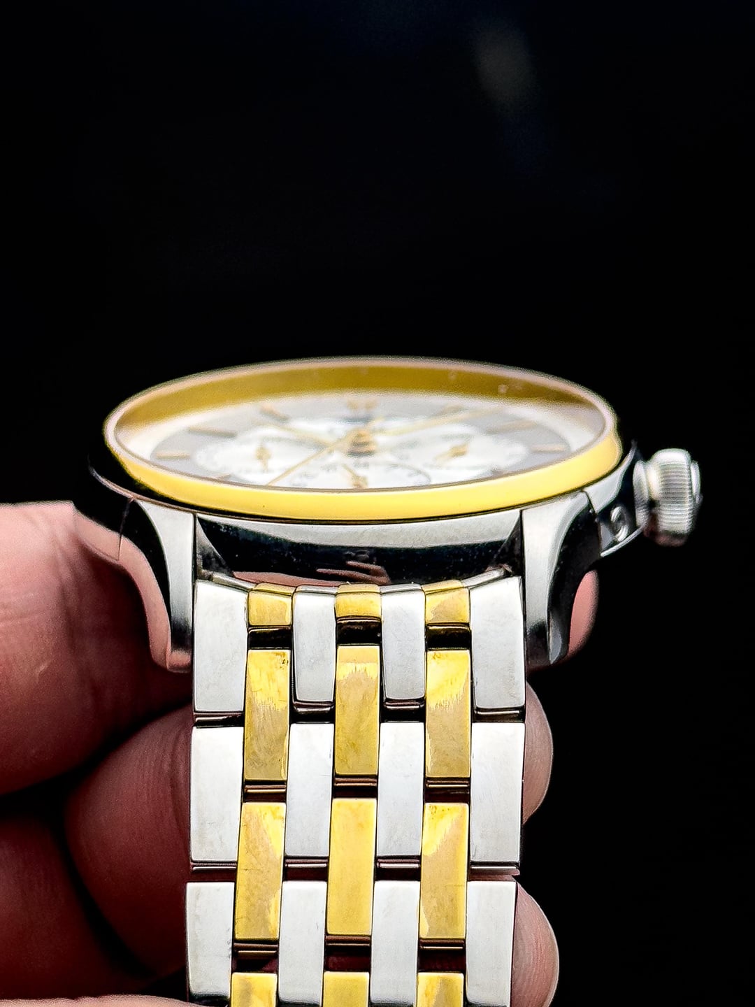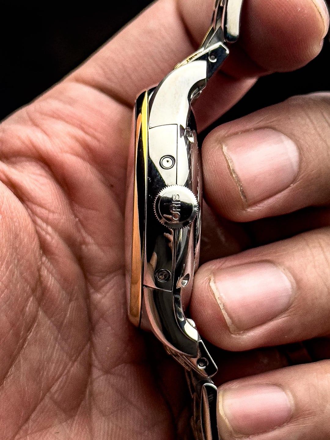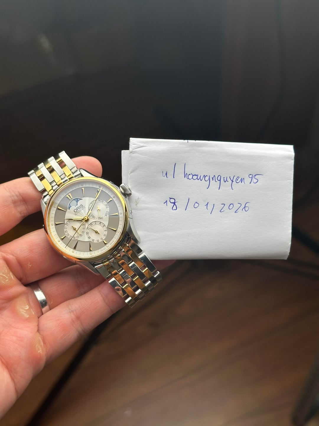 Up for sale is the Discontinued Demi Gold Oris Artelier Complication Moonphase 7592 40mm in excellent condition. Photos: https://drive.google.com/drive/folders/1ooWIcEsTvmlOGux0imVqAH_niIfBjlca Video: https://drive.google.com/file/d/1hS41UMt7sHl8-V8LJgI2XpMbHyU0lWn0/view?usp=drivesdk Timestamp: https://drive.google.com/file/d/1v_n3K8DSmoCXWLvf6tjY5YAxxm7ZmV6E/view?usp=drivesdk The Oris Artelier Complication Ref. 01 582 7592 4351-07 5 21 70FC is a discontinued piece that manages to pack in some of the most useful complications without ever feeling cluttered. At 40mm, the case wears beautifully, slim enough to slide under a cuff, yet with enough presence to feel substantial. The yellow gold PVD bezel against the silver dial gives it a touch of warmth that balances the otherwise clean, modern design. On the dial you’ll find subdials for day, date, a second 24-hour time zone, and a moonphase at 12 o’clock , practical information presented in a layout that stays symmetrical and easy to read. Powering it is the Oris Calibre 582 automatic movement, offering a 38-hour reserve and visible through the caseback. The watch is in excellent condition showing minor hairline scratches on the case and the caseback. The crystal is flawless, with clean bezel, clean dial and case. Watch comes fitted on OEM bracelet that has full links which fits up to 22-23cm (8.5 inches). The watch has been serviced, so it’s keeping excellent time and it’s currently running at +/-5s a day. Although it doesn’t come with original box and papers, a standard watch box will be provided upon purchase. Price: $1075 + $60 flat shipping (via DHL/ UPS express with tariffs/duty fee covered). Payment via PayPal F&F or G&S (+4.6% fee paid by the buyer). Not accepting trades. Feel free to message me with any questions or if you’re interested. Have a great day! Check out my other watches on Instagram: @jasonswatchcorner