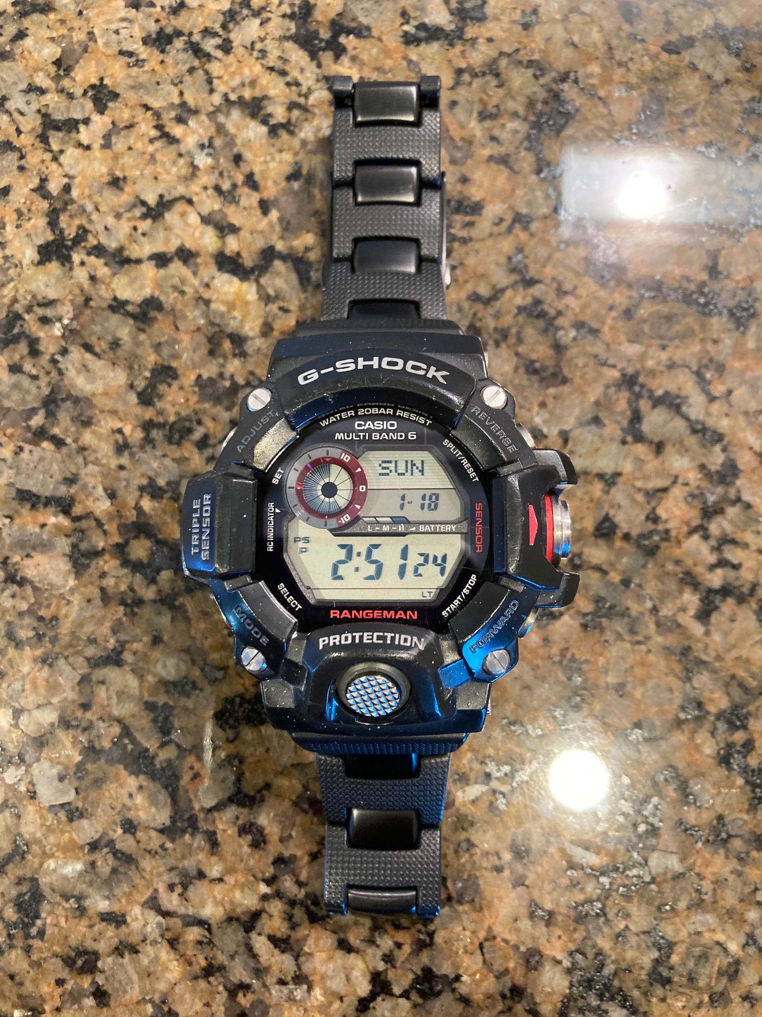 \[WTS\] Casio G-Shock Rangeman on Combi Bracelet - $185 Casio G-Shock GW-9400 Rangeman on a V1 Combi Bracelet. Includes original Rangeman strap also. Very unique G-Shock. If you have ever wanted a Rangeman, but are concerned that it might wear a little big, then this is the watch for you! This Rangeman wears incredibly well on a Combi Bracelet. The V1 Combi Bracelet and original Rangeman strap are Casio OEM authentic. Watch lugs are lightly filed to accommodate the combi bracelet. Includes all links. Atomic MultiBand 6. Triple sensor – altimeter, barometer, thermometer. No box or tin. The watch was regularly worn for several months, but not abused with some minor marks on the bezel and metal band keeper (see photo) which is typical. $195 PayPal Friends+Family is FIRM and includes FREE shipping to CONUS only. This is an incredible value at this price – Rangeman and Combi Bracelet can be sold separately for significantly more. Thanks. Timestamp and Photo Album: [https://imgur.com/a/z0TU0vZ](https://imgur.com/a/z0TU0vZ)