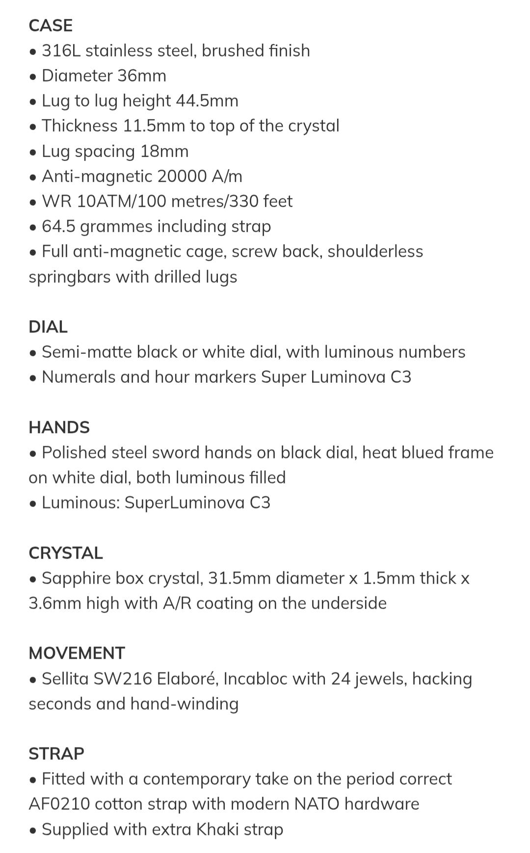 This is a catch-and-release for me. It is a Smiths PRS-59 Dirty Dozen homage in white. It is in excellent shape with virtually no wear and comes with all the OEM straps (two green, two sand), plus a blue RAF strap and two MN straps (CNS brand). Specs in pics. It will ship in the Smiths two-watch travel case. $650 shipped (PayPal F&F or Venmo). Feel free to reach out with questions!