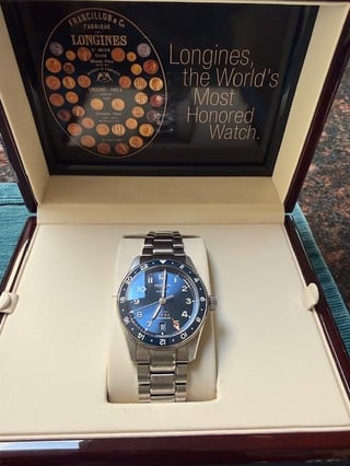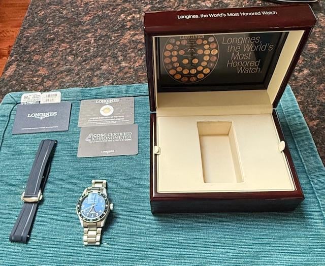Up for sale is my Longines Zulu Time 39mm with blue dial reference l3.802.4.93.6 Watch case is in great condition. The bracelet clasp shows some signs of use. Comes with a LONGINES blue rubber strap (L682170682) that I bought for $185 off the website and fits PERFECTLY with this watch. Can send pics of that as well if requested. (The clasp is from Straphabit). $2100 shipped CONUS. Payment via Paypal or Zelle. Happy to jump on a video call and/or answer any questions as well.