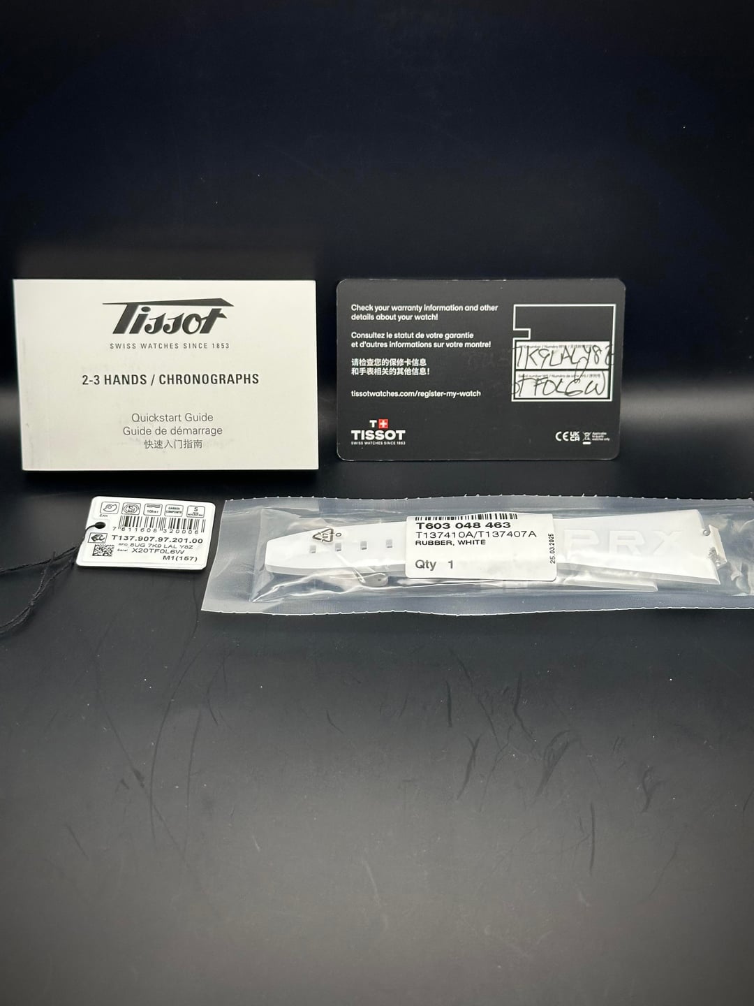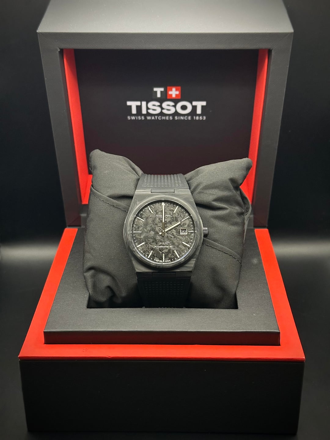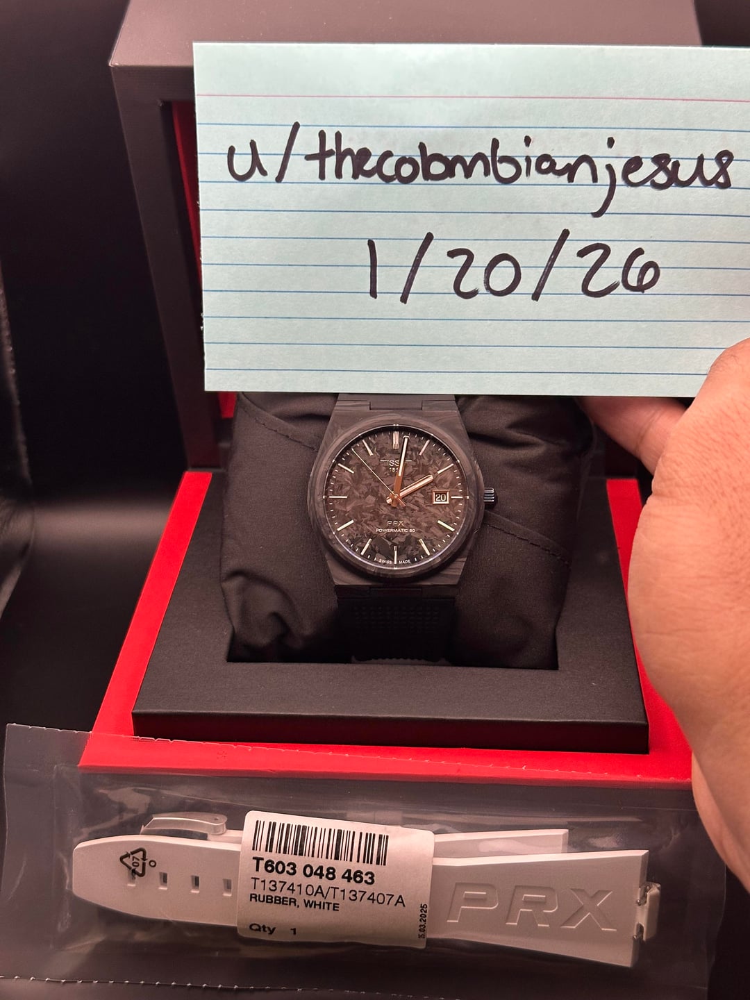 Up for sale is a Tissot PRX 40mm in Forged Carbon (Ref. T137.907.97.201.00). The PRX has become one of Tissot’s most successful modern releases thanks to its sharp integrated design, excellent wearability, and strong value for money. This forged carbon version takes that familiar PRX formula and gives it an extremely lightweight feel, with each case having its own unique carbon pattern. It wears incredibly comfortably on the wrist due to the light weight in combination with the black rubber strap. A nice bonus with this one is the included OEM white rubber strap, which really makes the watch pop and gives you an easy way to change up the look. This example is in mint condition and is less than two months old. It was originally purchased from Trifecta Watches in November 2025 and includes the original receipt. There are no signs of wear or damage anywhere on the case, bezel, or crystal. Both the black and white OEM rubber straps are in excellent condition, and the buckles are unworn since the watch was worn on an aftermarket deployant clasp during ownership. **Condition:** * Overall: Mint condition * Case: No marks or wear * Bezel: Clean, no scratches * Crystal: Perfect * Straps: Both OEM rubber straps in mint condition * Buckles: Unworn **What’s Included:** * Tissot box * Tissot warranty card * Tissot hang tag * Instruction manual * OEM Tissot black rubber strap * OEM Tissot white rubber strap * Original receipt from Trifecta Watches **Specifications:** * Model: Tissot PRX Forged Carbon * Reference: T137.907.97.201.00 * Case size: 40.5mm * Case material: Forged carbon * Weight: 75g * Crystal: Sapphire * Movement: Tissot Powermatic 80 automatic * Power reserve: 80 hours * Water resistance: 100m * Strap: OEM Tissot rubber straps with pin buckles **Price & Payment:** * **Price: $800 shipped** within CONUS via USPS Priority Mail, fully insured * Payment accepted via Zelle, Venmo F&F, or PayPal F&F * Not interested in trades at this time * Watch is located in Orlando, FL so no additional tariffs or import duties [Timestamp](https://preview.redd.it/wts-tissot-prx-40mm-forged-carbon-powermatic-80-oem-white-v0-jxgofh641keg1.jpg?width=1080&crop=smart&auto=webp&s=0cc7ee5cba6ad29af28da1b514c78d145fa9af60) [WatchCharts Feedback](https://watchcharts.com/repcheck/reddit/thecolombianjesus/feedback) Feel free to message me with any questions or if you’d like additional photos.