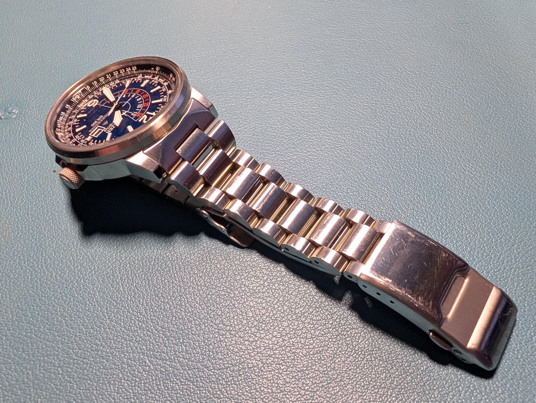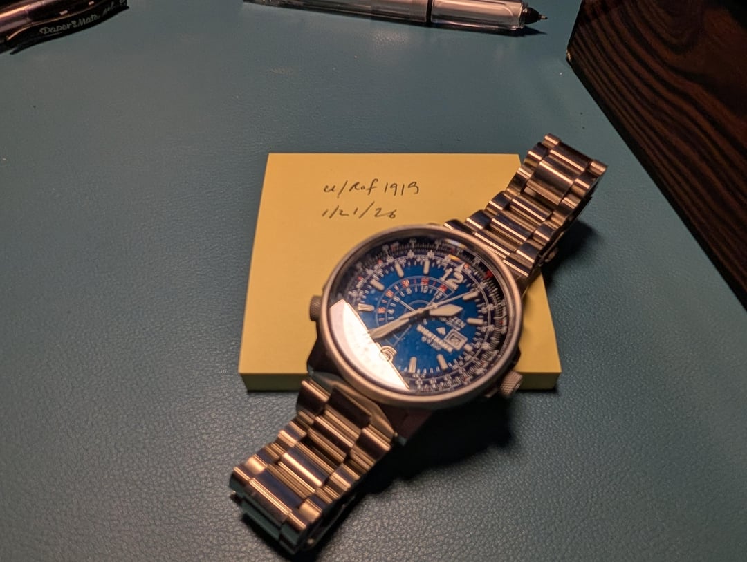 **Details:** Up for sale is my **Citizen Nighthawk BJ7000-52L**. This is the rare blue dial variant which has been discontinued for some time. It is much harder to find than the standard black dial version. * **Condition:** Great but worn. There are visible signs of wear on the case and bracelet (desk diving marks), but no deep damage or gouges. The Eco-Drive movement works perfectly and holds a full charge. * **Crystal:** \[Mention if it is the original Mineral or if you upgraded to Sapphire\]. * **Fit:** Currently sized for a 7” wrist (fits loosely). Includes one (1) extra link. * **Inclusions:** Watch and bracelet only. No box or papers. The blue dial has a beautiful sunray effect that really pops in the light compared to the flat black version. The internal slide rule bezel rotates smoothly and the GMT hand aligns as it should. **Price:** $350 OBO Shipped **Payment:** PayPal F&F or Venmo F&F **Shipping:** USPS Priority Mail included (CONUS) Please leave a comment on this post before sending a Chat or PM. Thanks for looking!
