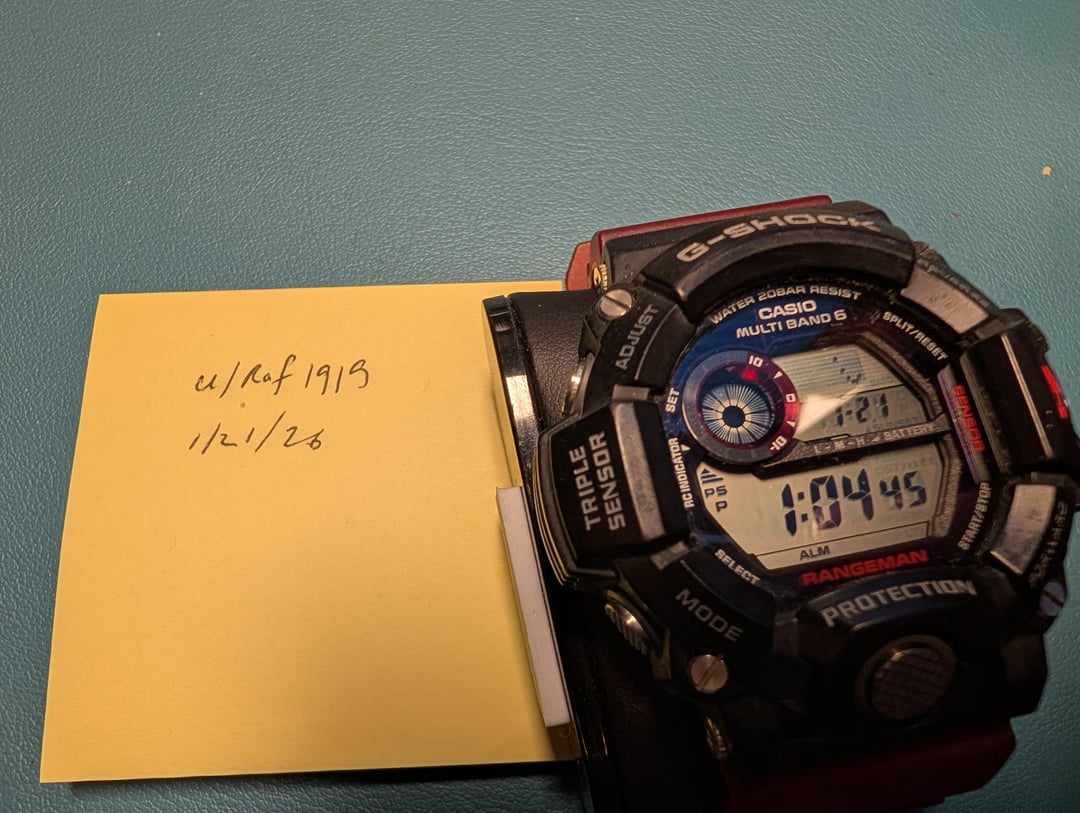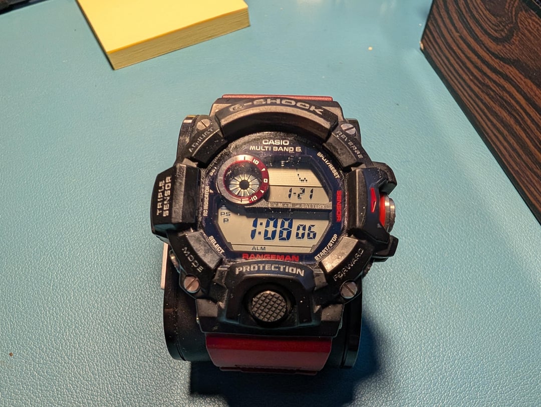 **Price:** $150 OBO Shipped **Payment:** PayPal F&F, Venmo F&F, or Zelle **Shipping:** USPS Priority Mail included (CONUS) **Details:** Up for sale is the classic **G-Shock GW-9400-1 Rangeman**. I picked this up on r/WatchExchange about 8 months ago, but it hasn't seen any wrist time as I’m currently trimming down a large collection. * **Condition:** The watch is in great working condition. The solar battery holds a high charge and all sensors (ABC) function as they should. * **Crystal:** There are some scuffs and "dot-like" marks on the crystal. I have tried to capture these as clearly as possible in the photos. This is how I received the watch, and they don't affect legibility during use, but I wanted to be transparent. * **Included:** Watch comes on the original black resin strap, plus the **extra red strap** shown in the photos. * **Box/Papers:** Selling as watch-only. If I find the original tin before shipping, I’ll include it, but please expect watch-only. This is a fantastic "beater" or outdoor watch that is built to take a hit. Please leave a comment on this post before sending a Chat or PM. Thanks!