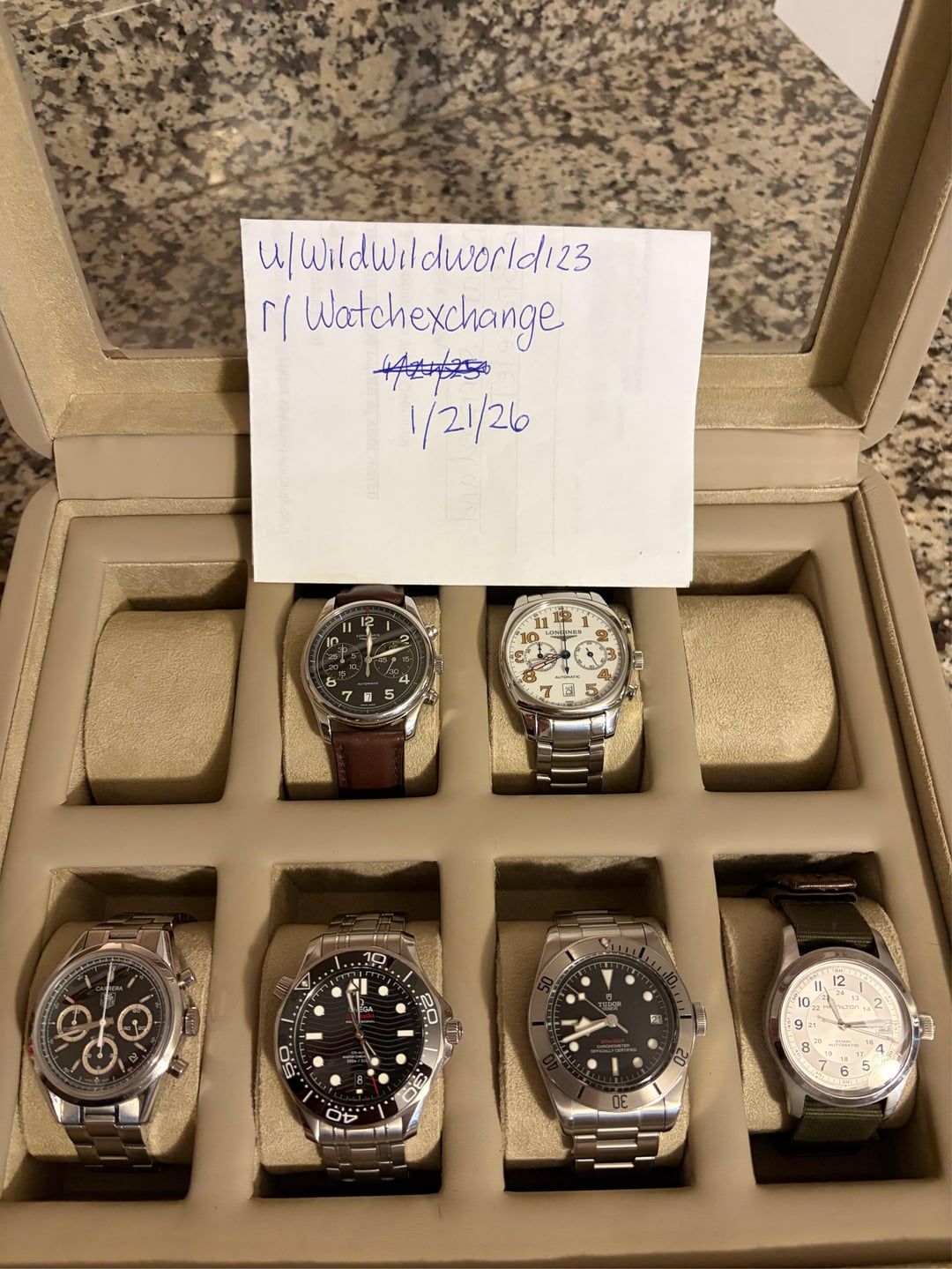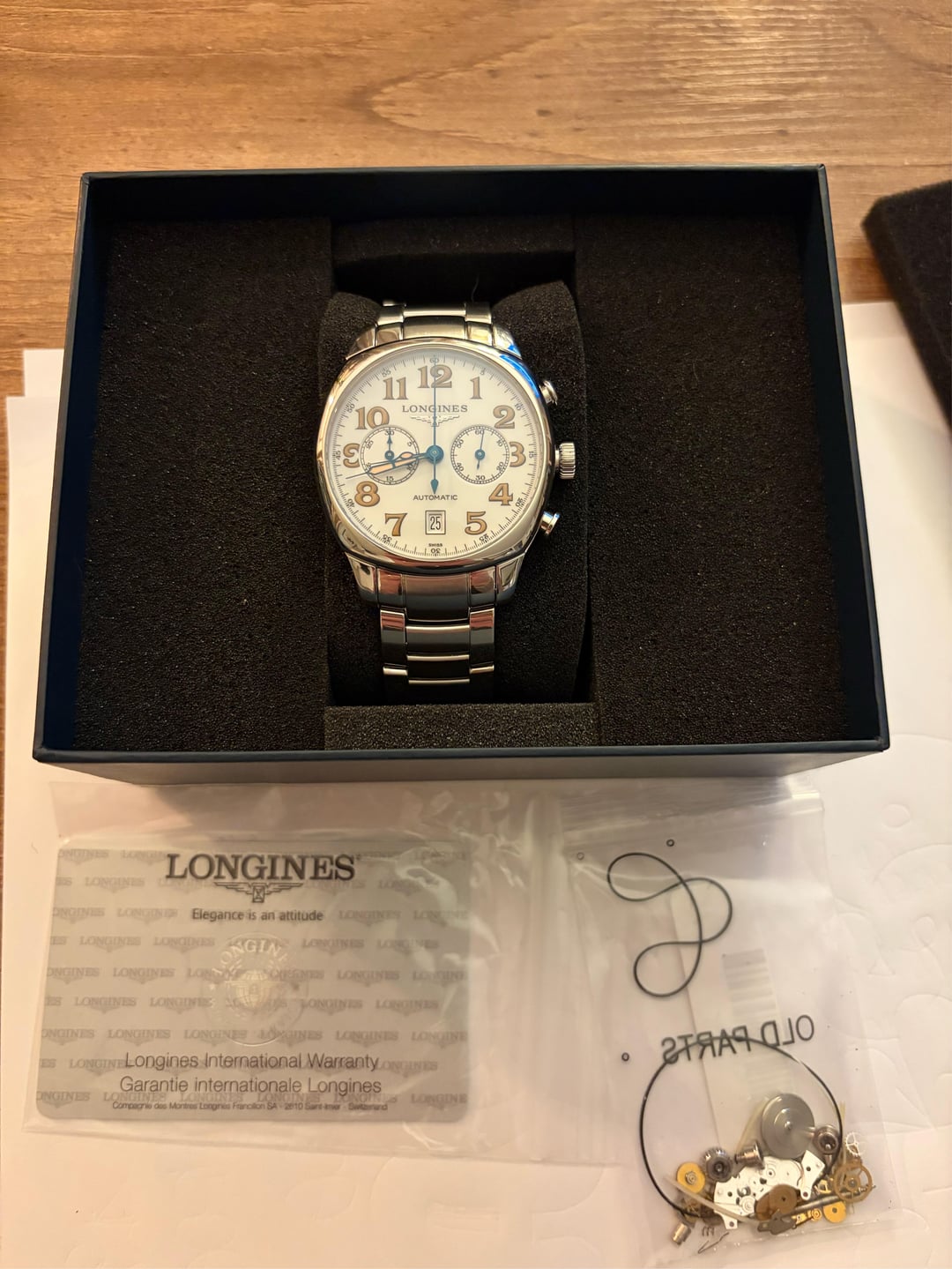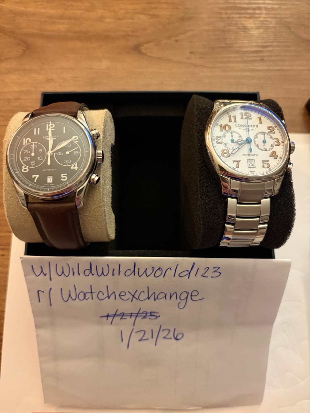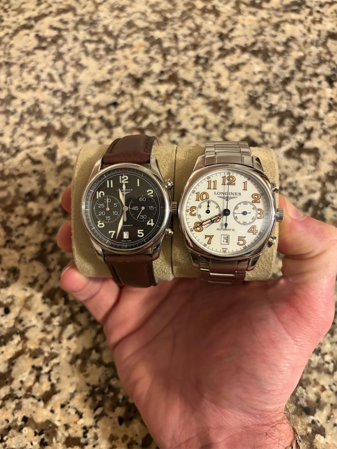 2 Longines Chronographs for sale. The 40mm white dial reference L2054236 just received a complete maintenance service from Longines which cost $558. I just got the watch back today and it comes with the spare parts, service box, extra links and warranty card. (Box and papers) It’s in amazing shape for a neo-vintage and comes with enough links to fit an 8 inch wrist. $1500 +shipping The 40mm black dial reference L26294 is running strong and keeping great time. I was told it was serviced not long before I bought it last year. It comes with an OEM leather strap and a master collection steel bracelet I bought directly from swatch group for $400. I have the receipt for that as well. This watch will fit an 8 inch wrist on leather or steel and comes as “watch only” $1400 +shipping I have some experience buying, selling and shipping watches. My account is newer, so I’m willing to do a FaceTime or whatever it takes to make buyer comfortable. I will ship FedEx “hold at location” and will require a picture of your ID. I will also share a picture of mine. I accept Zelle, cash app, PayPal F&F and G&S(+4.5%) If you’d like to meet in person I’m located in southern CT.
