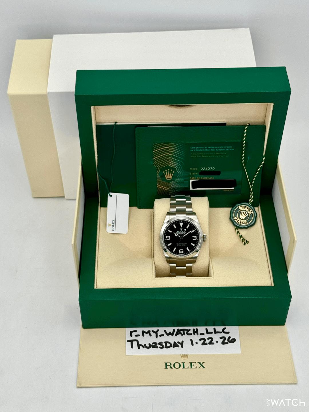 🔵**2024 Rolex Explorer 40mm 224270 Oystersteel Oyster Bracelet Black Dial with a Chromolight Display** 🔵**TRADE or SELL us your luxury watch, all brands considered. Message me details.** **Includes the following:** **✔️Original Rolex Double Boxed** **✔️Box and Papers - Yes** **✔️Warranty card dated March 2024** **✔️5 year manufacturer warranty** **✔️Manual and Warranty booklets** **✔️Green and White Hang Tags included** **✔️Size: 7.75inch wrist (Full Links)** **✔️Watch is in excellent overall condition. Please see photos for details.** **✔️Trades welcome** Business Name: **My Watch LLC** LOCATION: Oak Park, Michigan ✔️[MyWatchLLC.com](http://mywatchllc.com/) for current inventory ✔️Google Business Listing [https://g.co/kgs/Cmd6FPW](https://g.co/kgs/Cmd6FPW) ✔️Business Hours M-F 9-6 ✔️Facetime/Video chat/calls welcome to view the watch interested. ✔️Contact: 248-422-0909 via text or call for quickest response. 🟢TERMS: Visit [MyWatchLLC.Com](http://mywatchllc.com/) for payments accepted 🟢REFERENCES/REVIEWS: We are well reviewed on all platforms from google, trust pilot, rolexforums, additionally we have 300+ reference in multiple FaceBook watch groups, reference checks welcome. 🟢SHIPPING: If you are not local, we offer Fully Insured FedEx overnight shipping in the USA for a fee. International shipping available. [https://mywatchllc.com/products/2024-rolex-explorer-40mm-224270-black-dial-1](https://mywatchllc.com/products/2024-rolex-explorer-40mm-224270-black-dial-1)