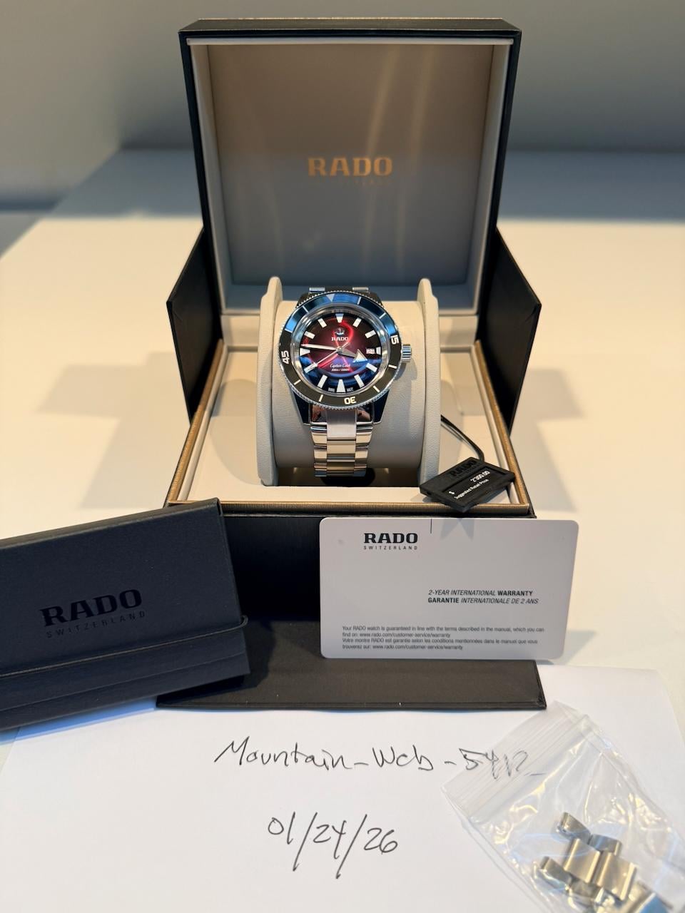 **Description:** Up for sale is the Rado Captain Cook Automatic (Ref. R32105353). This is the 42mm stainless steel model featuring a beautiful dark red-to-black gradient dial and a high-tech black ceramic bezel insert. It strikes a great balance between vintage charm (with the domed sapphire crystal and anchor logo) and modern durability. I purchased this watch new in **June 2025**. **Condition:** The watch is **lightly used**. The crystal and ceramic bezel are flawless. The case is clean, though the polished stainless steel bracelet does show some light scratches/scuffs consistent with normal wear (mostly "desk diving" marks on the clasp and lower links). The movement is running strong and keeping good time. **Includes:** **Full Kit:** Original box, outer packaging, user manual, extra links, and the warranty card (dated 06/2025). **Specs:** * **Reference:** R32105353 * **Case Size:** 42mm * **Material:** Stainless Steel case & bracelet / Ceramic bezel insert * **Dial:** Dark Red / Burgundy Gradient * **Crystal:** Domed Sapphire with anti-reflective coating * **Movement:** Rado Calibre R763 (80-hour power reserve) * **Water Resistance:** 300m (30 bar) **Price & Shipping:** I am asking **$1,600** shipped. * **Payment:** Zelle * **Shipping:** Insured shipping included to CONUS.