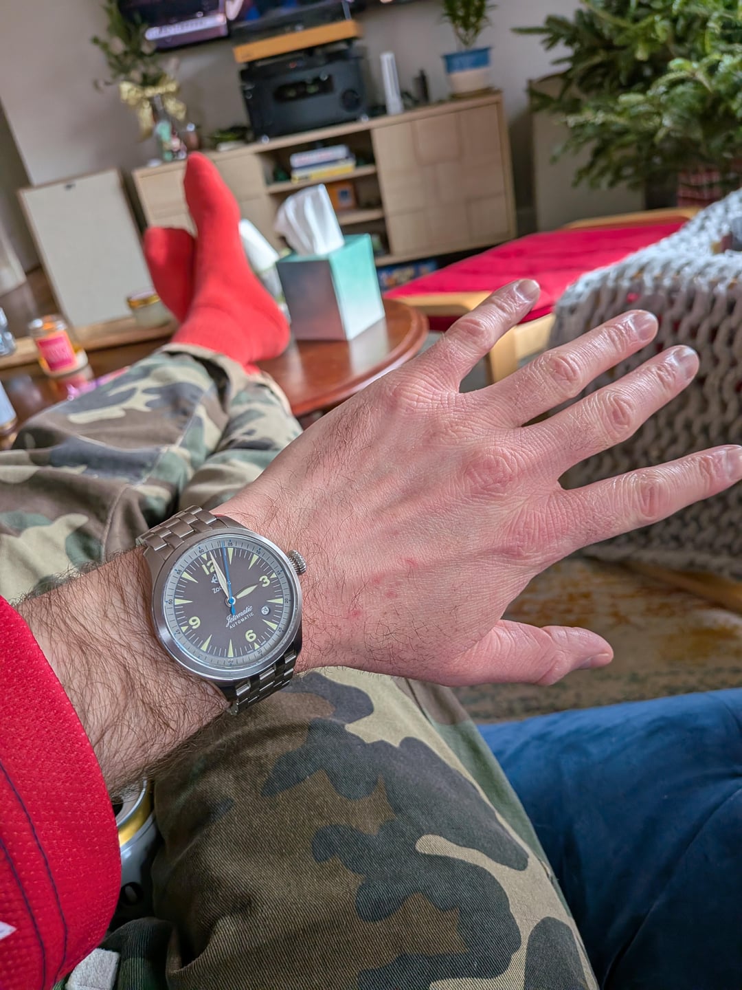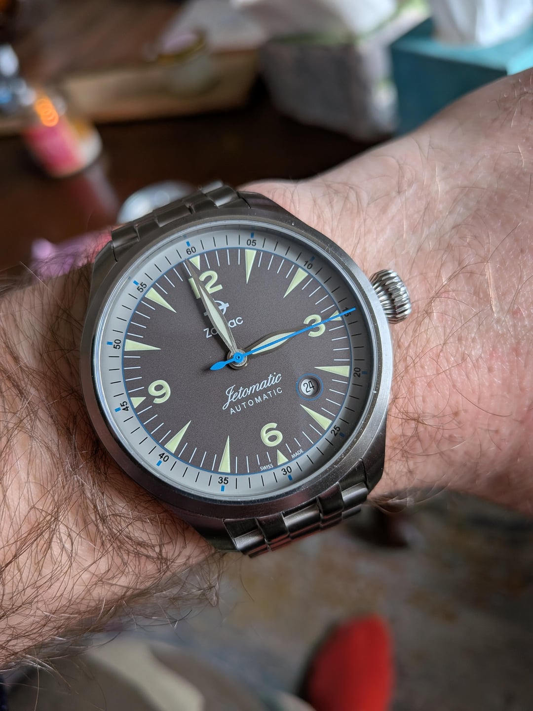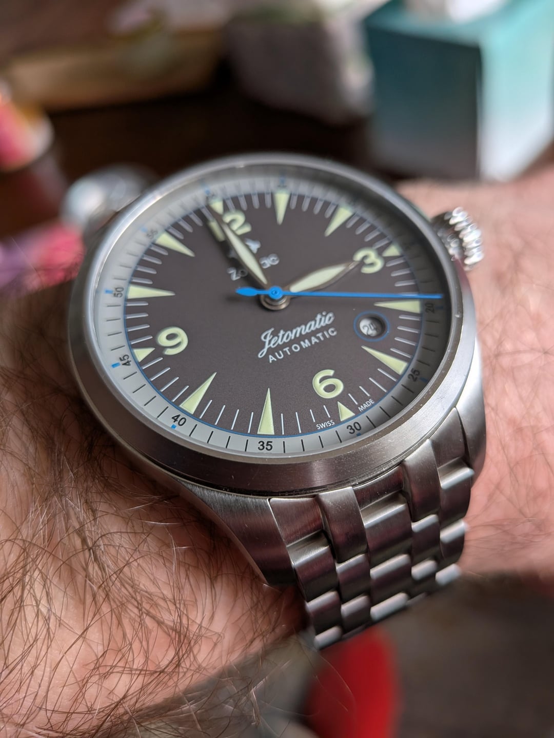 Hi all! Listing a catch-and-release this evening—a super cool Zodiac Jetomatic pilot watch. Bought secondhand on eBay and I love the way it looks, it's just that the 42mm case is a touch too large for my liking. Came to me very lightly used; has a couple small scuffs from normal wear but is in excellent condition overall and keeping good time. No box or papers unfortunately, but will include spare links for ya. **Looking for $395 OBO including tracked and insured CONUS shipping. Would also be open to trading for a Seawolf if it's the right color—feel free to send me a message with offers!**