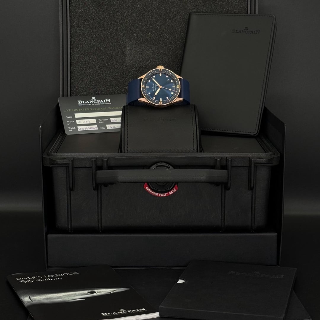 Available is the Blancpain Fifty Fathoms Bathyscaphe Rose Gold Ref: 5000-36S40-NAOA Asking: $17,450 + shipping (add $75 for my label) Local Orlando [Video](https://imgur.com/a/FsQvssy) [Timestamp](https://imgur.com/a/k3cXWAV) [Instagram](https://www.instagram.com/jamesthewatchguy?igsh=a2pxZG16bzhmdHU5&utm_source=qr) This is one of the original and most iconic divers of all time. The 43mm rose gold case has great wrist presence and is incredibly comfortable. The attention to detail in the exhibition caseback is exactly what you’d expect from Blancpain Contents: Full set Triple boxed - outer, inner Pelican Case, an travel roll Papers - 2021 dated warranty card Divers Log Manual/Booklet Condition: Excellent/near mint condition Clean crystal and bezel Running amazing on timegrapher Buyer perks and protections: Open to trades 3rd party escrow and authentication available 12 month trade ins and buy backs Timegrapher testing to make sure your watch is working correctly and not in need of a service Overnight insured shipping anywhere in continental US I’m quick to respond and easy to get a hold of -James The Watch Guy jamesthewatchguy.com