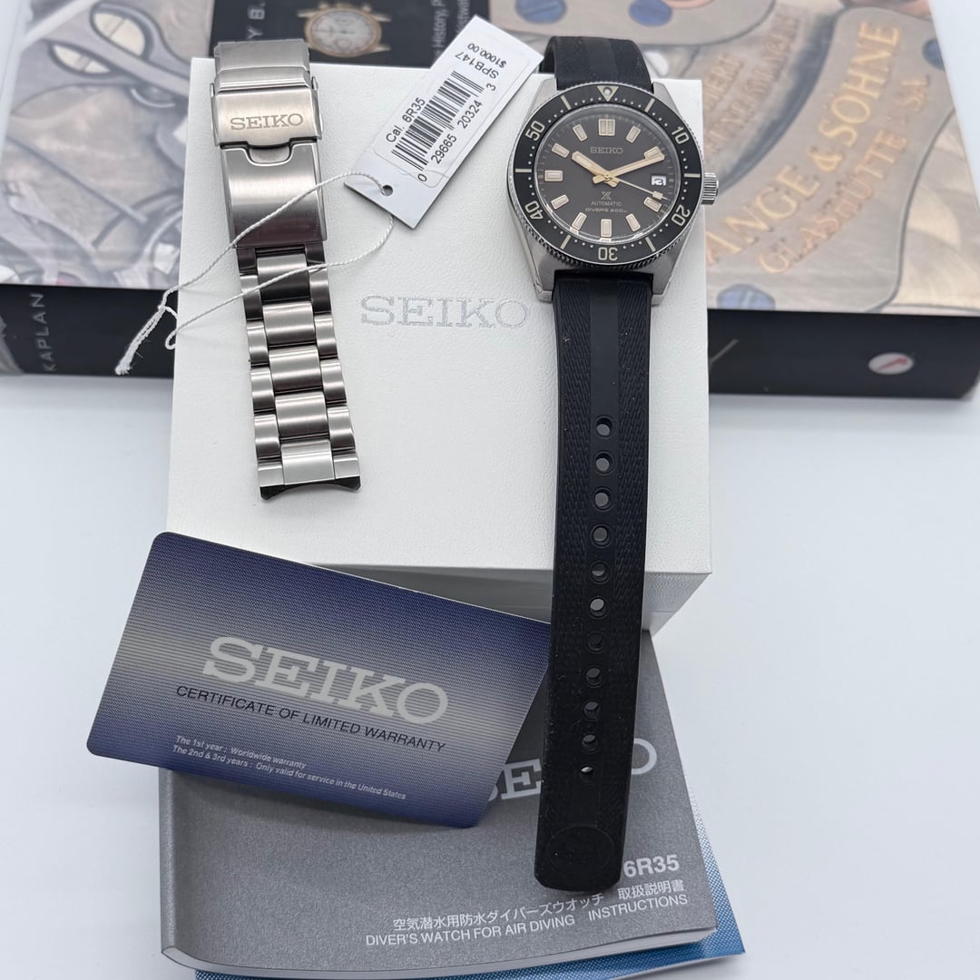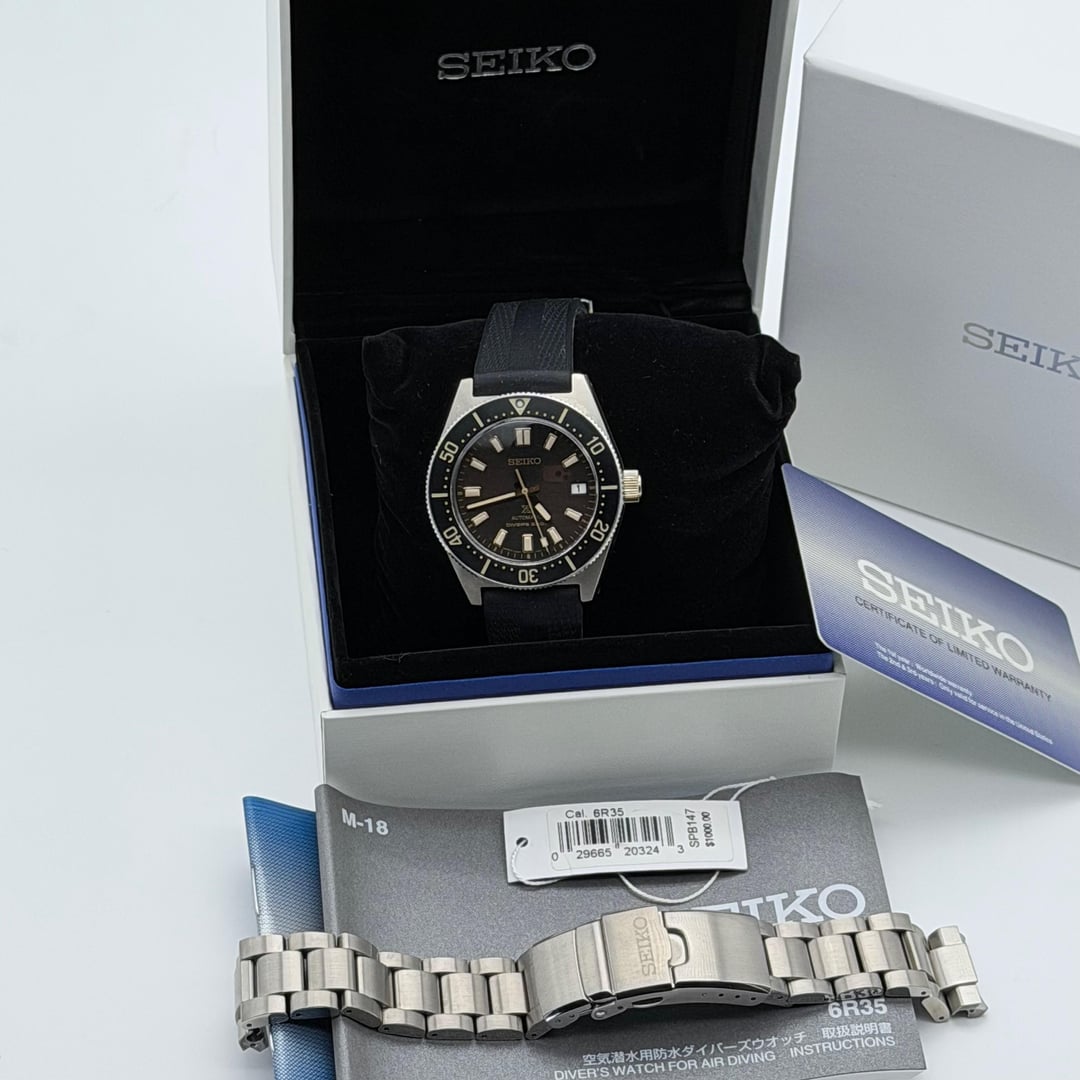 **For Sale:** Seiko Prospex **62MAS Re-Issue SPB147** **Condition:** Excellent light wear consistent with careful use includes both stainless steel bracelet & rubber **Includes:** Full set (inner & outer box, papers, hang tags, factory bracelet) **Price:** $895 USD **Shipping:** USPS Priority, fully insured (CONUS) **Payment:** Zelle or Venmo **Details:** • Model: **SPB147 (62MAS modern re-issue)** • Automatic Seiko 6R35 movement • 40.5mm case, classic tool-watch proportions • Sapphire crystal, 200m water resistance • Bracelet and clasp in excellent condition • Running strong and keeping solid time This piece comes Eight Bells Watch Co. a veteran owned watch business and has been **handled, stored, and inspected professionally**. No functional issues. A great example of one of Seiko’s most respected modern divers. Please reach out to me here or on my website [eightbellswatchco.com](http://eightbellswatchco.com) Thank you.