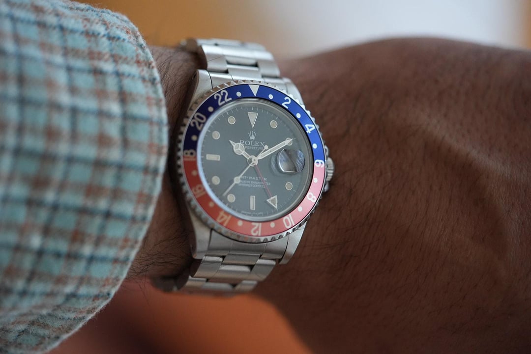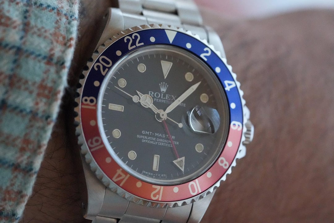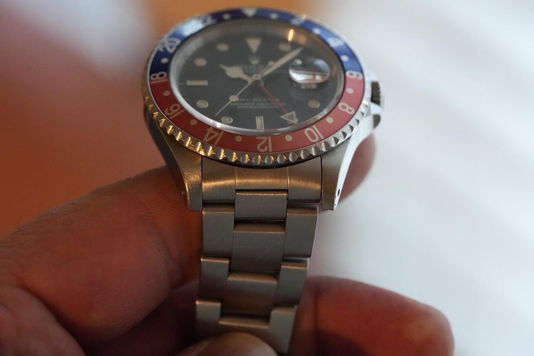 Has a nice patina going on. This was my daily watch for a while, but rarely gets any wrist time now. Note the gmt hand has no lume fill, bezel does not click (missing click spring). Ships from Denver $10,000 + $35 Fedex 2 day shipping in North America. Zelle, PayPal, Venmo f&f to established accounts. From Ai: The **Rolex GMT-Master Reference 16700** is a landmark model in the history of the GMT-Master line. Produced from approximately **1988 to 1999**, it is famously known as the **"Last of the GMT-Masters"** because it was the final reference of the original GMT-Master series (GMT-Master I) before the model was completely replaced by the GMT-Master II. # Key Features & Specifications * **Case Size:** 40mm diameter, crafted exclusively in **904L stainless steel**. * **Movement:** **Caliber 3175**, which introduced a **Quickset date** feature and hacking seconds. * **Timekeeping:** Unlike the GMT-Master II, the 16700 has a **coupled hour hand**, meaning the GMT hand and local hour hand move together. You track a second time zone by rotating the external bezel. * **Crystal:** This was the **first GMT-Master I** to feature a scratch-resistant **sapphire crystal**. * **Water Resistance:** Rated for **100 meters** (330 feet). # Bezel and Dial Variations The 16700 was officially offered with two aluminum bezel insert options: the classic **"Pepsi" (Red/Blue)** and an **All-Black** version. Because the 16700 crossed the late 90s, the luminescence on the dial transitioned during its production: * **1988 – 1997:** Features **Tritium** lume (marked "SWISS T < 25" at the bottom of the dial), which develops a creamy patina over time. * **1998 – 1999:** Features **Luminova** (marked "SWISS"), which does not patina but glows more reliably.