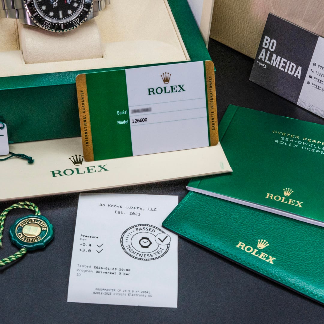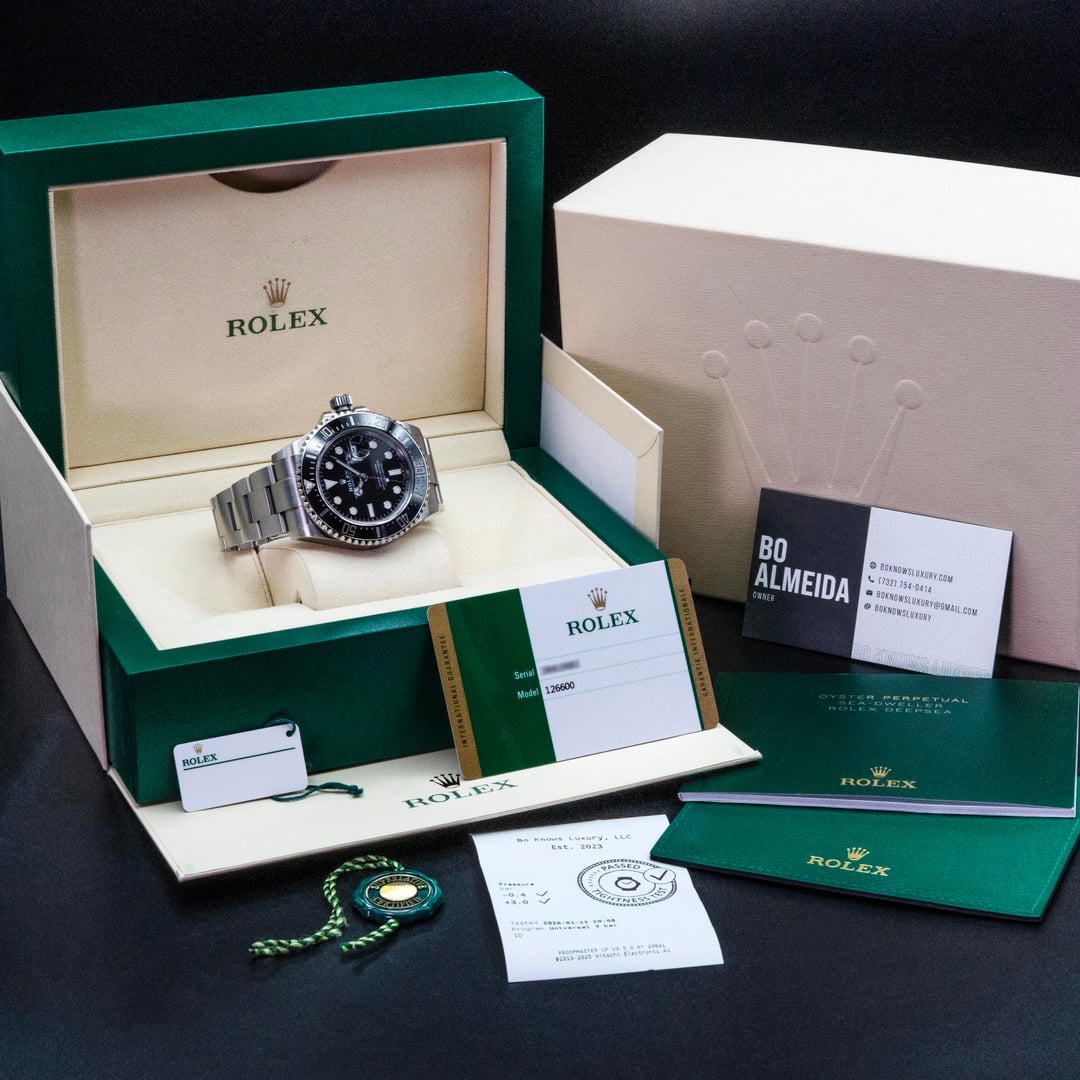 [https://www.dropbox.com/scl/fo/hqyp5r1fyeomzs34k3cxl/AAso9ur8Fboxv35xv4doM0w?rlkey=xllc25nzm86d5hb9x9eh2xryr&st=62bktslw&dl=0](https://www.dropbox.com/scl/fo/hqyp5r1fyeomzs34k3cxl/AAso9ur8Fboxv35xv4doM0w?rlkey=xllc25nzm86d5hb9x9eh2xryr&st=62bktslw&dl=0) **2020 RLX SEA-DWELLER 126600 STAINLESS STEEL BLACK DIAL 43MM - BOX AND PAPERS** **.** * **Reference: 126600** * **43mm stainless steel case** * **Black dial with Chromalight display** * **Calibre 3235, automatic, 70-hour power reserve** * **1,220m water resistance** **.** **Contents:** Watch, double box set, 2020 warranty card, serialized white tag, manuals, and fully linked Oyster bracelet with Glidelock clasp and diving extension. ***One year service warranty is included at no charge via Bo Knows Luxury, LLC, starting from the date of purchase!*** **.** **Condition:** Excellent pre-owned condition with light wear on the case, bezel, and bracelet. The photos in this album were taken using a macro setup to ensure an accurate representation of the watch's condition. This timepiece has been professionally pressure-tested and thoroughly validated to confirm all functions operate within factory specifications. . ***Price: $12,625.*** *Fully insured overnight shipping included in the US. Payment accepted via:* * *Bank Wire* * *Zelle* * *All major credit cards* . Please message me directly to confirm availability before marking sold! USAF veteran owned company with hundreds of successful deals done, and plenty of references available to any interested buyers. Thanks for looking! 🙏