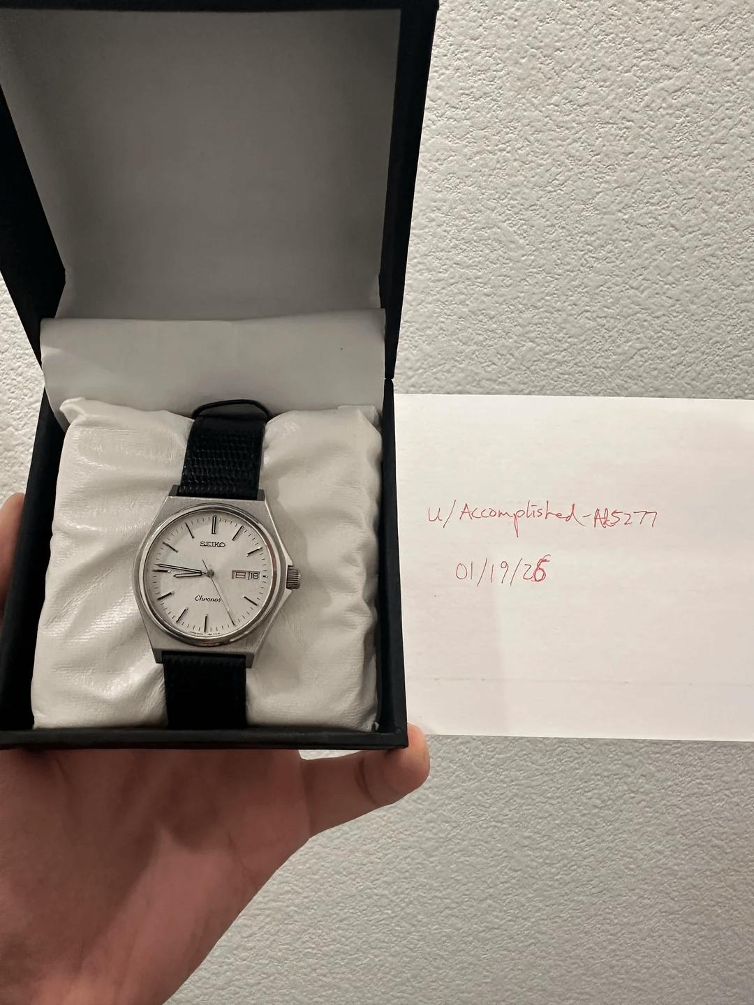 \[WTS\] Seiko Chronos “Snowflake” Frosted Silver Dial (5H23-7060) — $180 shipped — JDM Day-Date (Kanji/English), 100m, Screw-Down Crown Price: $160 shipped CONUS Location: Bay Area, CA Payment: PayPal G&S (buyer adds fee) / PayPal F&F / Venmo / Zelle Trades: No trades Local: Yes — Bay Area face-to-face available (cash / Zelle / Venmo) Timestamp / Album (video + photos + timestamp): [https://imgur.com/a/Xoi9qdf](https://imgur.com/a/Xoi9qdf) The Watch For sale is my Seiko Chronos 5H23-7060 with a gorgeous snowflake/frosted silver dial. In person it has a “fresh snow” shimmer that shifts under light—one of those textured dials that looks far more special than the price suggests. This is a JDM Day-Date with a Kanji/English day wheel, and it wears clean as an everyday vintage piece: understated at a glance, special up close. Condition • Good vintage condition overall (photos are the best description) • Dial is clean and crisp with strong texture • Case/crystal show normal wear consistent with age • No functional issues — time/day/date operate as they should What’s Included • Watch head • Genuine leather strap (pairs perfectly with the dial) Specs • Reference: Seiko Chronos 5H23-7060 • Movement: Seiko 5H23 quartz • Dial: Frosted “snowflake” silver • Complications: Day/Date (Kanji/English) • Water resistance (original rating): 100m / 10 bar (vintage note: WR not guaranteed unless recently pressure-tested) • Crown: Screw-down crown • Case size: Others have measured these at \~35mm (excluding crown). I measured it to be 36mm. Shipping / Local • CONUS shipping: tracked (insured available on request) • Local meetup: Bay Area in a public place; flexible on location Terms • No trades • All sales are final Why I’m Selling Consolidating the collection to make room for a chronograph.