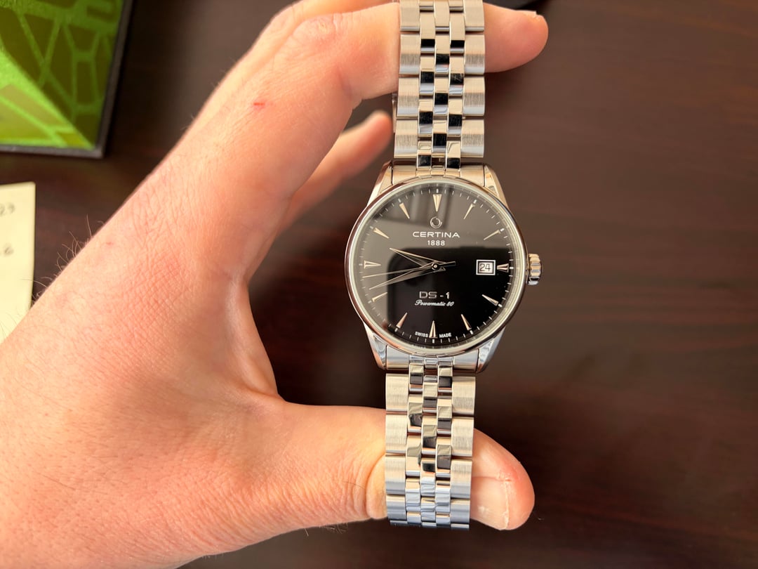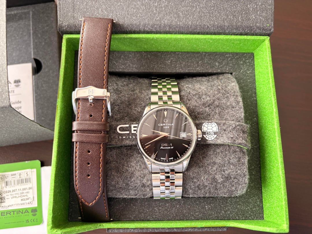 Placing for sale my Certina DS-1 38mm, black dial, automatic watch. 100m of water resistance. Including 19mm dark brown leather Hirsch strap. I am the original owner. Great combination of dressy looks and everyday spec. I’d rate the watch as used-very good. Some scratches on the high polish surfaces but no flea bites and clean crystal. Comes as a full set with box, papers, all links, and warranty card stamped March 2025. Asking $325 net to me of any fees, including shipping. UPDATE: I will cover shipping costs, in case that’s not clear :) Accepting Venmo and PayPal. Shipping to CONUS via USPS priority mail same business day if funded before noon eastern, otherwise next business day.