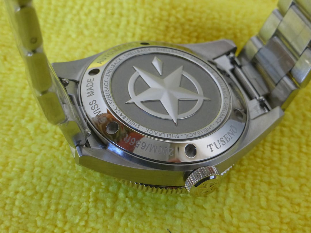 Version 1 Tuseno Shellback. Dark blue dial and bezel which can look black in some light conditions. Metal bracelet has never been worn or sized and still has plastic wrap on it. Bracelet has quick-release springbars. Watch is in excellent condition and includes original box and cork travel case. Works fine keeps great time. Swiss Made. 40mm diameter and 20mm lug width. Asking $500 shipped in the continental US, sorry no trades.