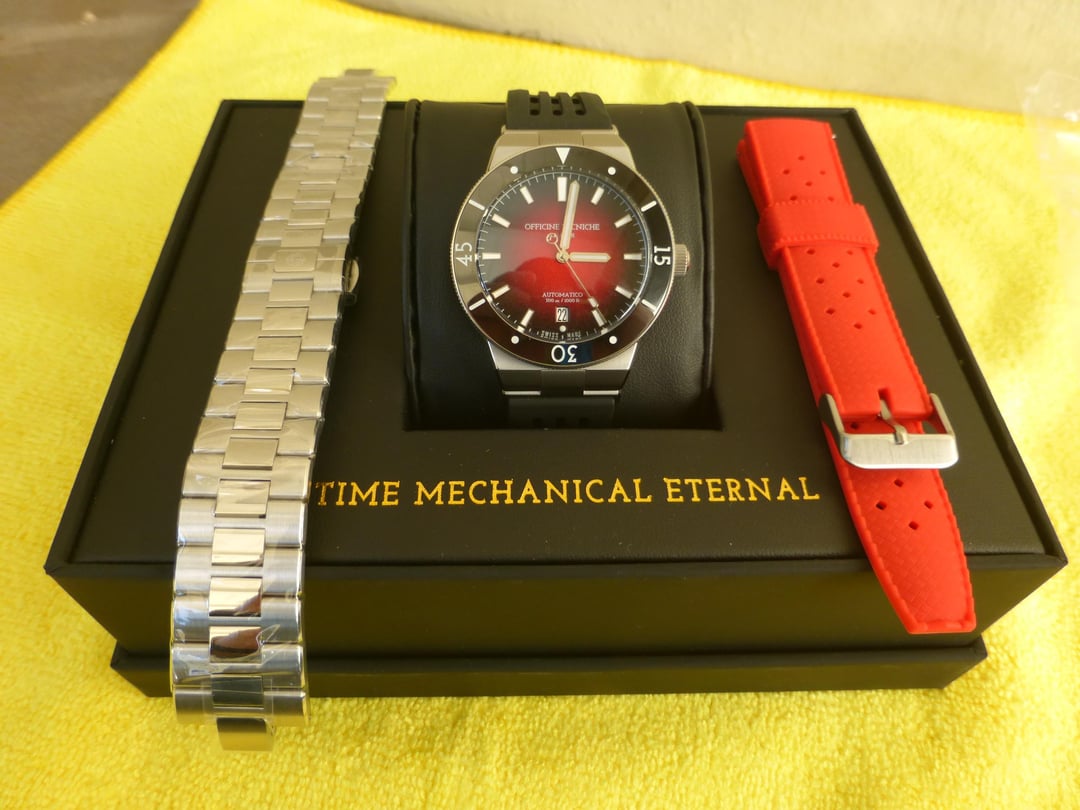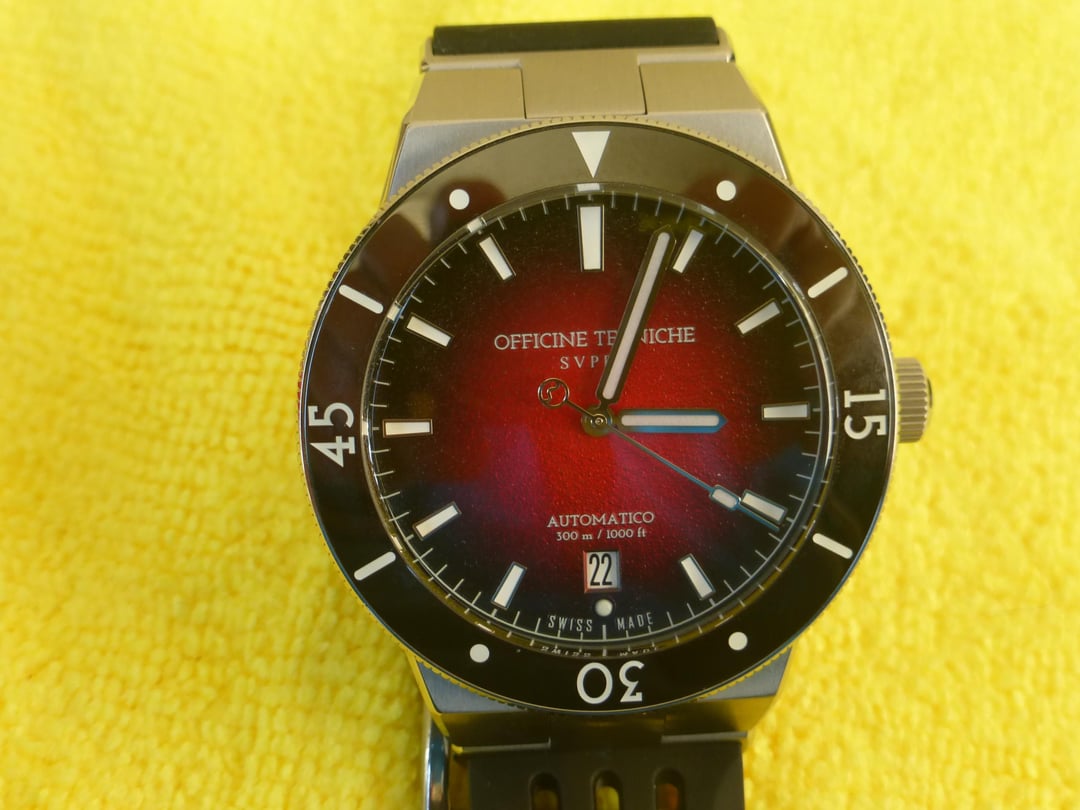 For sale is the Officine Tecniche Svper Dive watch in excellent condition. Full kit box and papers. Ruby red 40mm dial. Comes with black FKM strap, red tropic-style strap and unworn integrated bracelet that still has the plastic on it. Limited edition of 94 pieces,now sold-out. LA JOUX-PERRET LJP-G100 automatic movement with 68 hour power reserve. If you want to install the integrated bracelet you will have to remove the strap adapters, and I suggest having a jeweler or watch person do this as it is a delicate job to remove the tiny screws and you don’t want to damage them. Keeps great time, only worn a handful of times. New retail was $1,150 plus import taxes. Asking $700 shipped in the continental US, sorry no trades. Here are the watch specs: CASE MATERIAL: Stainless Steel 316L, BEZEL INSERT MATERIAL: Ceramic, Polished DIAMETER: 40mm, TICKNESS: 12.2mm, LUG-TO-LUG: 47.5mm DIAL: Ruby Red Degradè, CASEBACK: Screw Down 3D deep stamped CRYSTAL: Sapphire, Curved, 2 Layers AR Coating, LUME: Superluminova BGW9 WATER RESTANT: 300m, CROWN: Screw Down Crown with 3D logo MOVEMENT: LA JOUX-PERRET LJP-G100, FREQUENCY: 28800bph (4hZ), POWER RESERVE: 68 hours