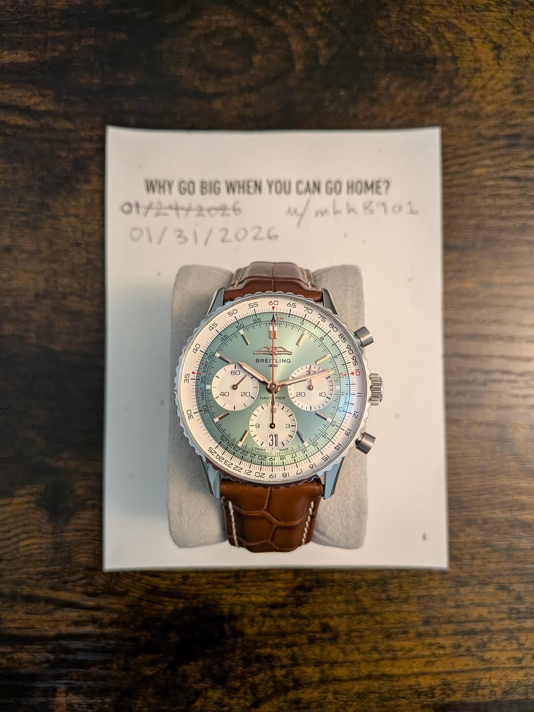 ![Thumbnail [WTS] Breitling Navitimer B01 Chronograph 41 Mint Green AB0139211L1P1, Like New, Warranty Valid until 2030/09/25, $7000 4](https://cdn-cf.watchpatrol.net/120x120/img/full/832fe1dfab0fbc2e2692d7c92662fc43c8fe5d53.jpg)