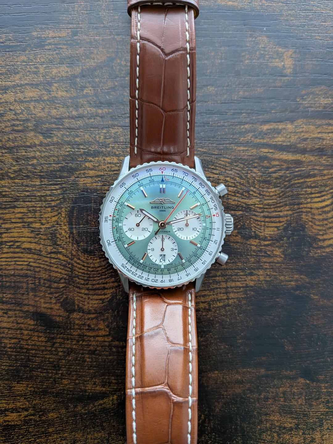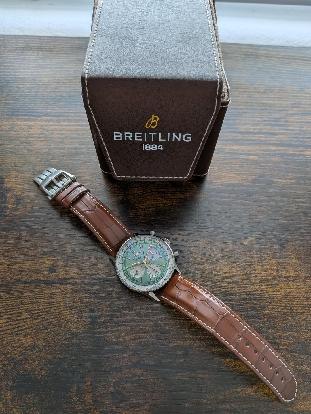 For Sale: **Breitling Navitimer B01 Chronograph 41 Mint Green AB0139211L1P1, Like New, $7000** Includes: Full Set Box and Papers. Purchased September 2025. Warranty Valid until 2030/09/25. Like New 2025 Case Diameter: 41mm Movement: COSC Certified, B01 Chronograph, 4Hz, 70 hrs Power Reserve Height: 13.6mm Lug Width: 22mm Lug to Lug: 47.1mm Water Resistance: 30m Comes with Breitling 22mm Gold Brown Alligator Leather Strap 1059P with Brushed-Polished Stainless Steel Folding Clasp A18DSA.6 Strap SKU: 1059P - Standard Length Buckle SKU: A18DSA.6 - Tang Folding Clasp Material: Alligator Leather Color: Gold brown Lug type: Straight Lug: 22/18 mm Buckle Type: Tang-Type & Folding Clasp Buckle size: 18 mm Modified by AD to add Quick Release Spring Bars **$7000** Shipped (CONUS). Ships from Texas. International Shipping on your label. Accept Zelle, Venmo, PayPal (Buyer pays fees).