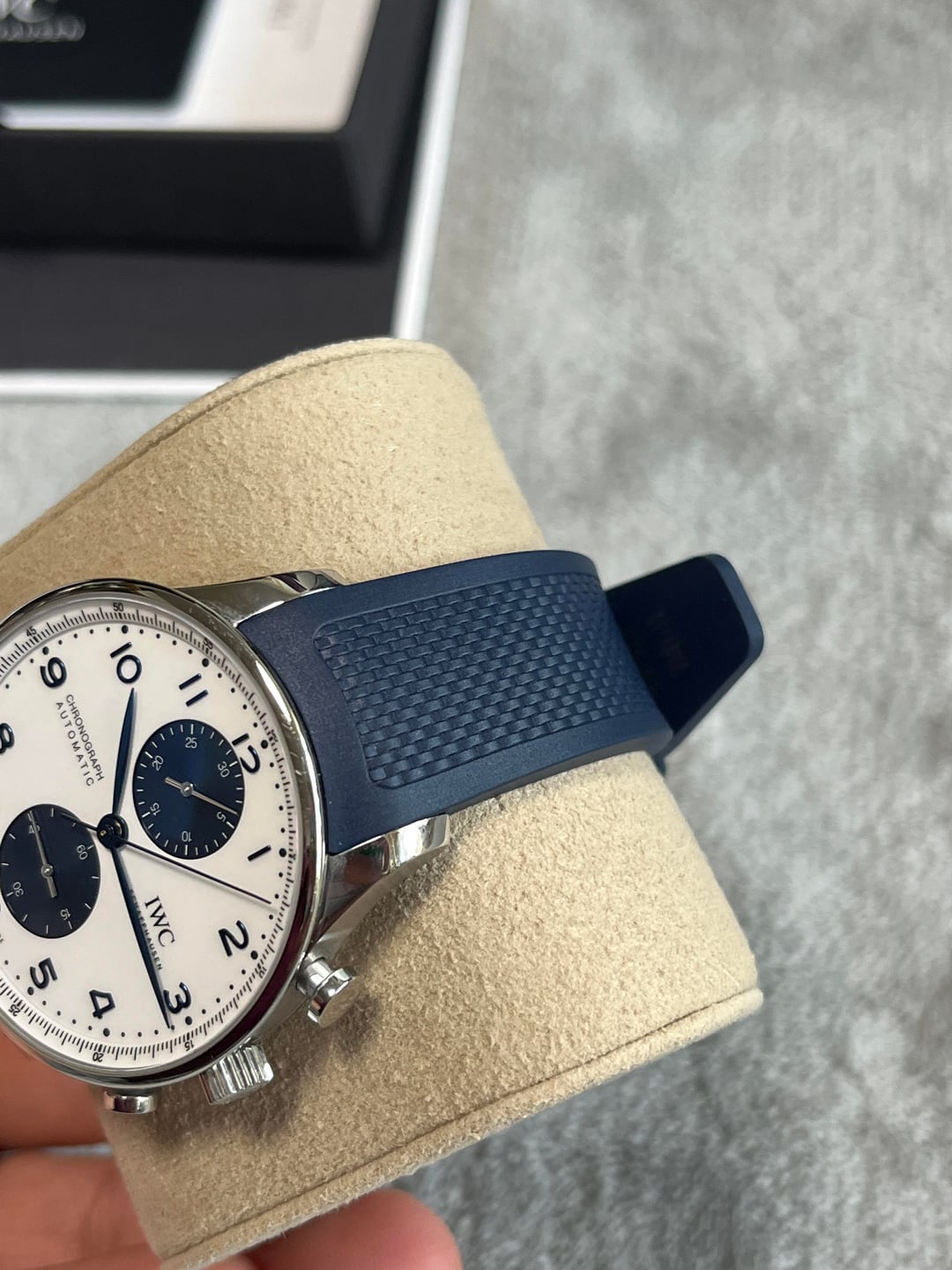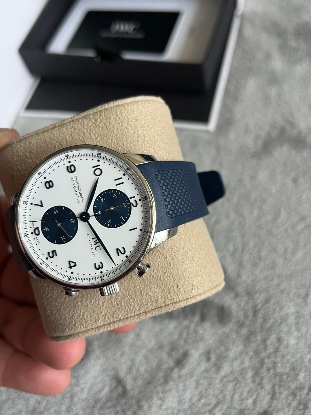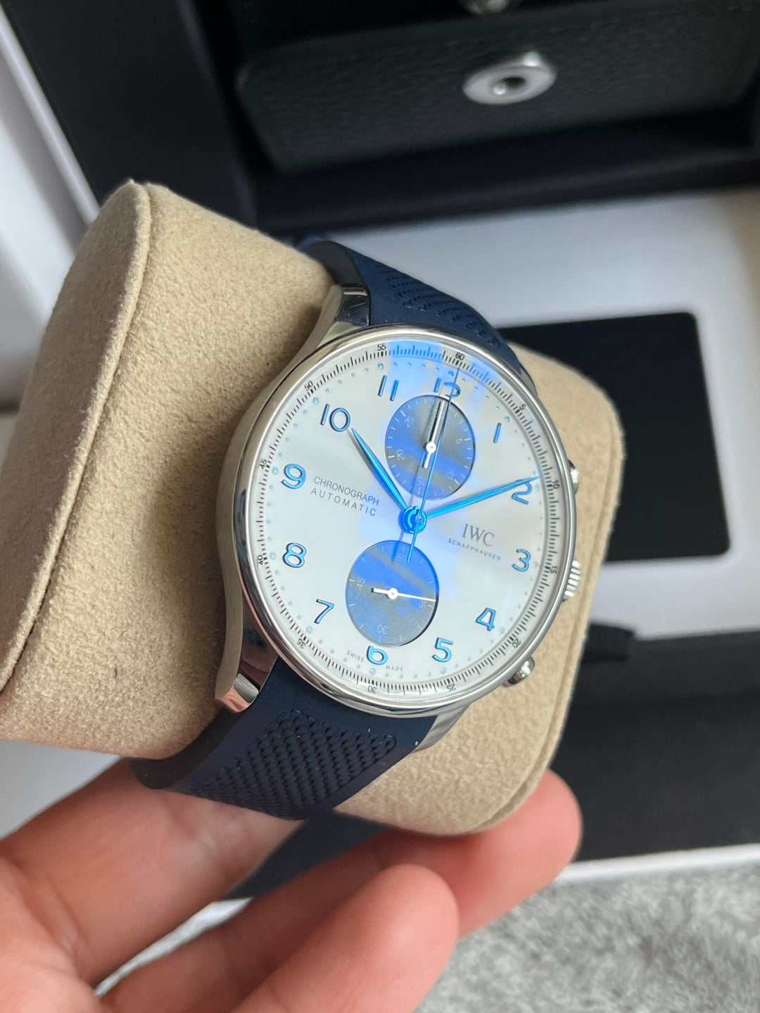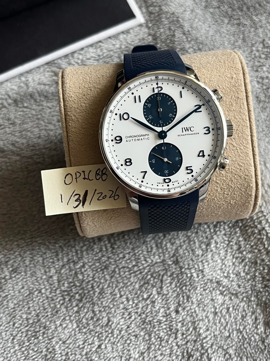For sale - IWC Portugieser Chronograph 41mm IW371620 It features a beautifully finished lacquered white dial with striking blue accents. It looks amazing in person—pictures really don't do it justice. Under warranty until April 2031. The watch is in near mint condition with a few light marks on the mirror-polished area. April 2023 full set- box, leather case, papers, warranty card, microfiber cloth. Priced to sell at $4,950 shipped (**no trades please**). Thanks for looking!
