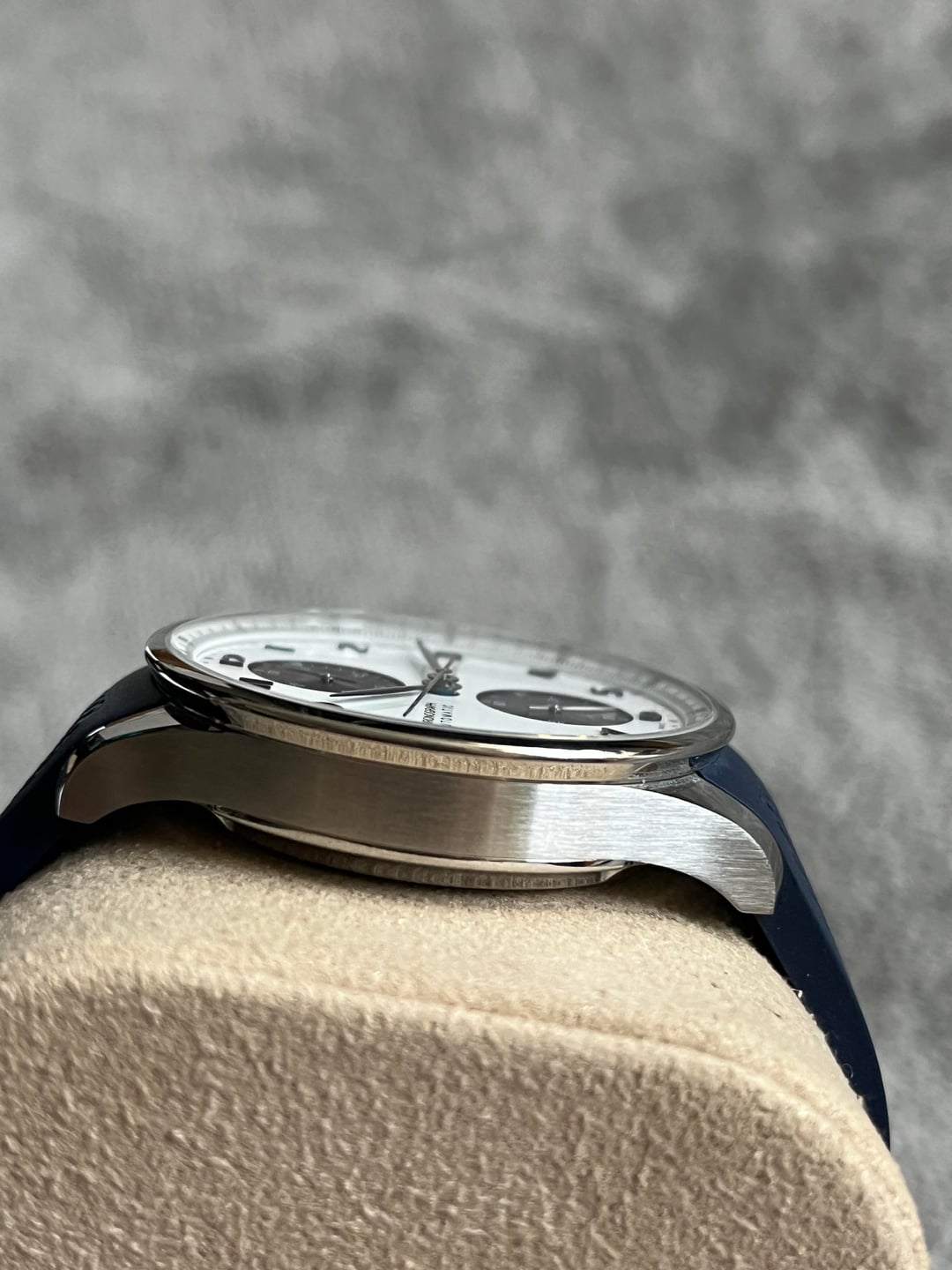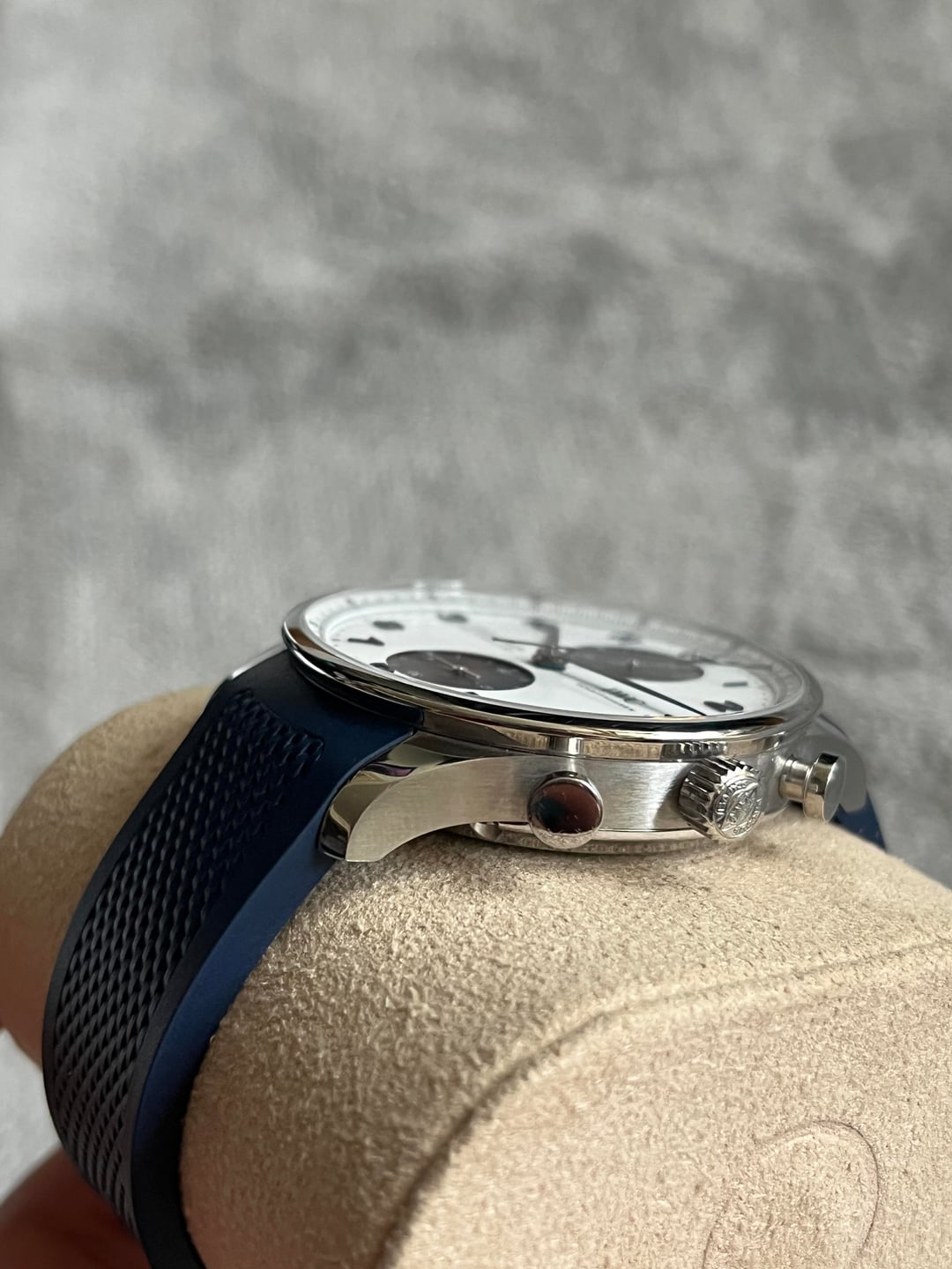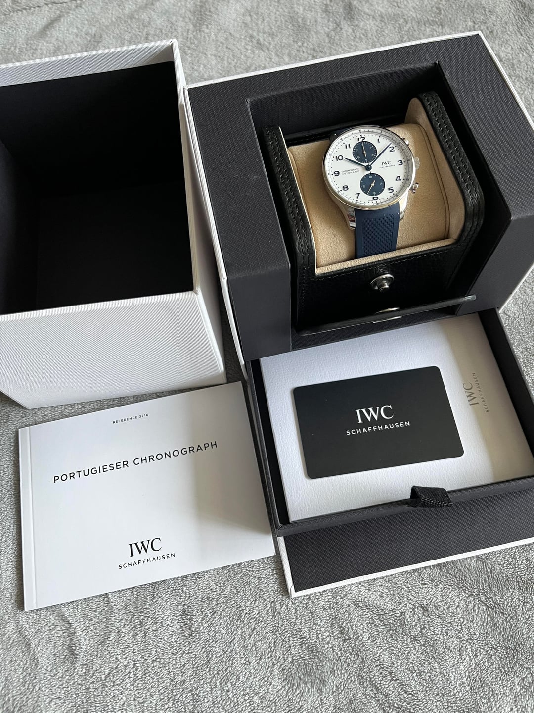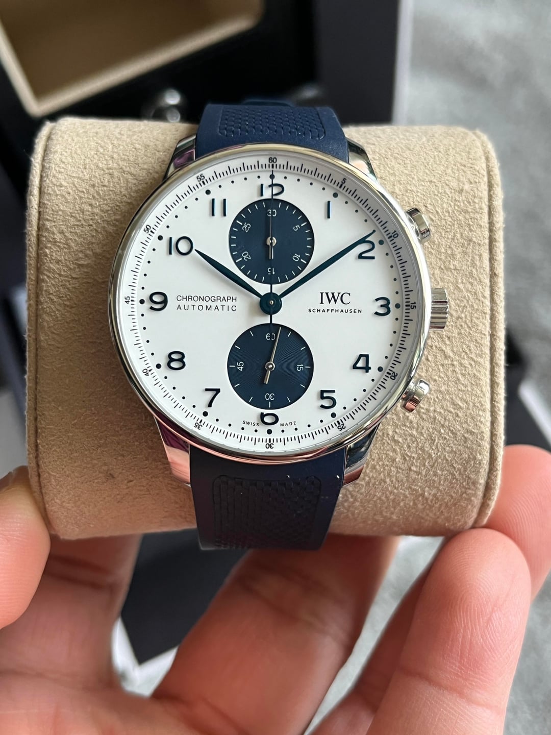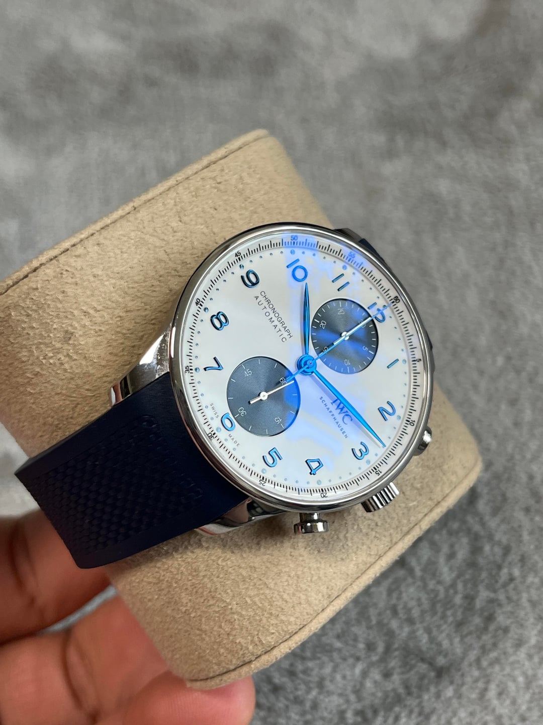 For sale - IWC Portugieser Chronograph 41mm IW371620 It features a beautifully finished lacquered white dial with striking blue accents. It looks amazing in person—pictures really don't do it justice. Under warranty until April 2031. The watch is in near mint condition with a few light marks on the mirror-polished area. April 2023 full set- box, leather case, papers, warranty card, microfiber cloth. Priced to sell at $4,950 shipped (**no trades please**). Thanks for looking!