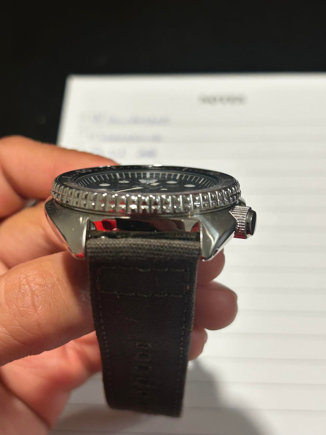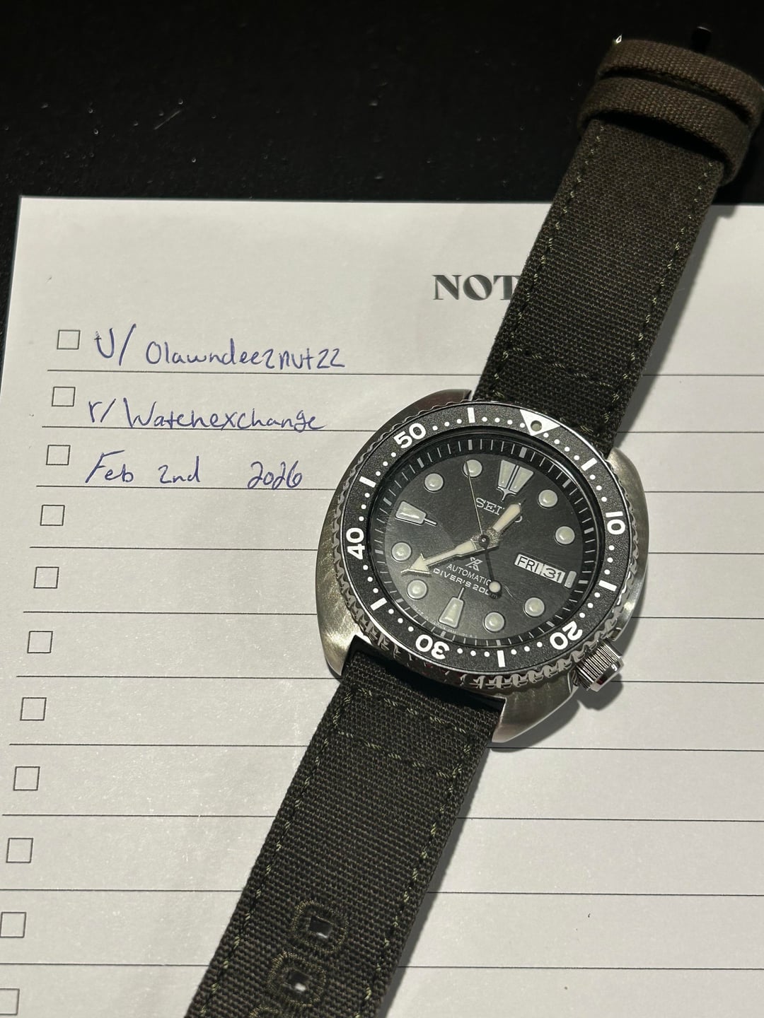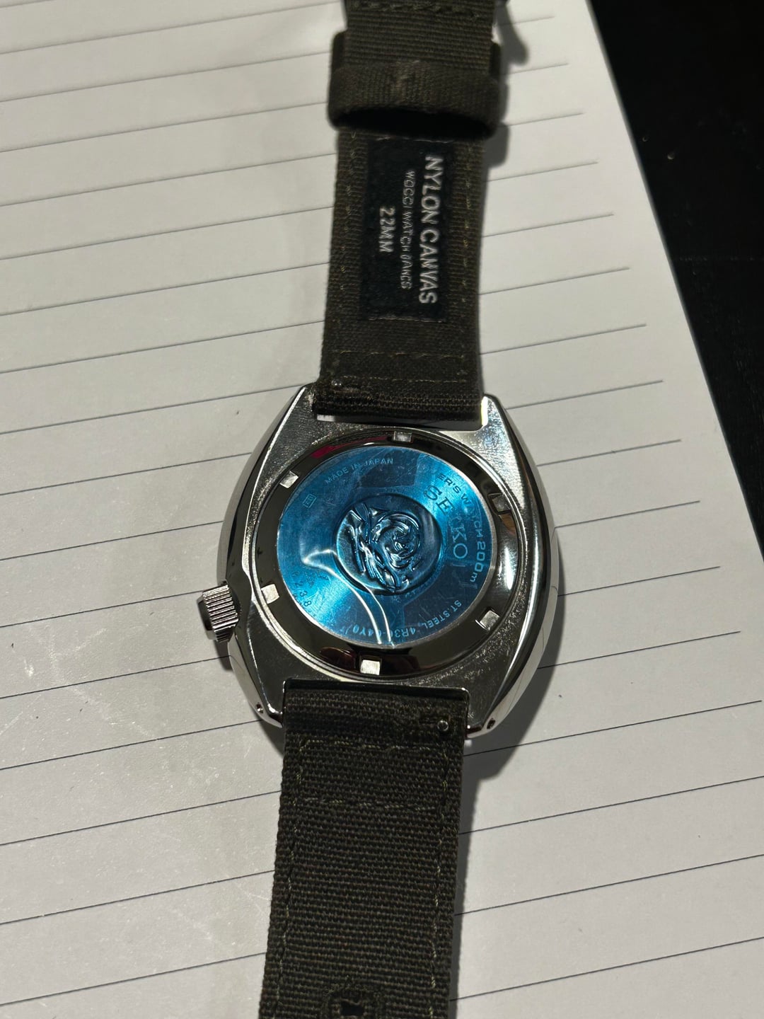 Selling my automatic Seiko turtle on aftermarket canvas strap, purchased a few months ago but only worn a handful of times because of the size. Otherwise it looks great and winds up and runs perfectly. Original rubber strap and box included. PayPal F&F Priority shipping with USPS
