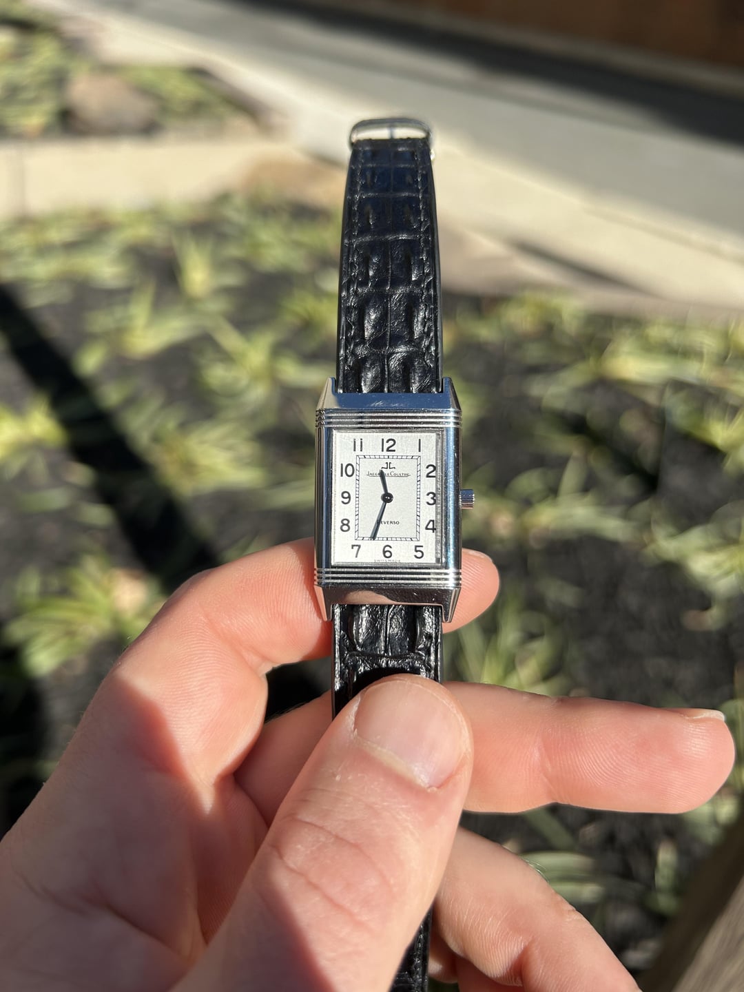 Hi folks! Up for sale today is a beautiful JLC Reverso Classique Reference 250.8.86. I purchased this watch via this sub in hopes that it would be my wedding watch, but I have incurred some unexpected medical costs and have to sell the watch. The dimensions of this watch match the original release of the reverso with case dimensions of 23x38 mm and a thickness of 7 mm. It is a stunning watch and in great condition. There are some minor scratches due to wear that I’ve tried my best to capture in outdoor photos but no deep cuts or dings. I have barely worn it since purchasing. The watch went through a full servicing by JLC (a $736 value to the new owner) is obviously running great. The watch comes with a box given by JLC for the servicing (not original to the watch) and the papers pertaining to the service of the watch, verifying authenticity and the warranty of the service. I am pricing for a quick sale at $3350 which still has me at a loss with the price I purchased it at + service costs. I’ll even cover shipping. Payment preferences are Venmo and Zelle. Happy to meet F2F in the Philadelphia area, send additional photos or video or jump on a FaceTime- I want to buyer to be totally comfortable with their purchase! I have a few buys and sells and have very positive feedback on the sub. Please let me know if you have any questions and thank you for looking!