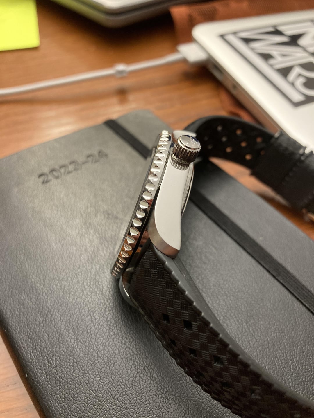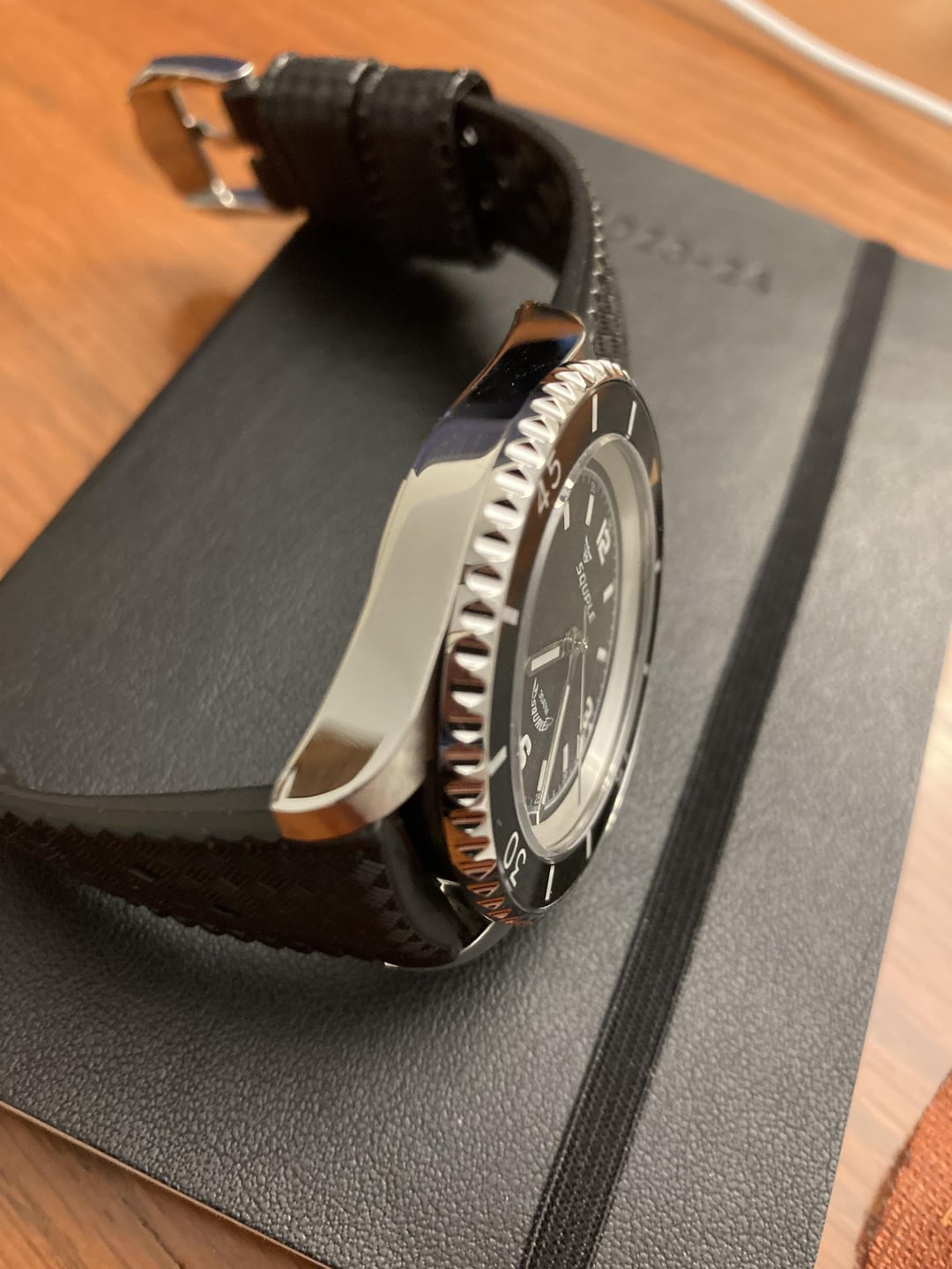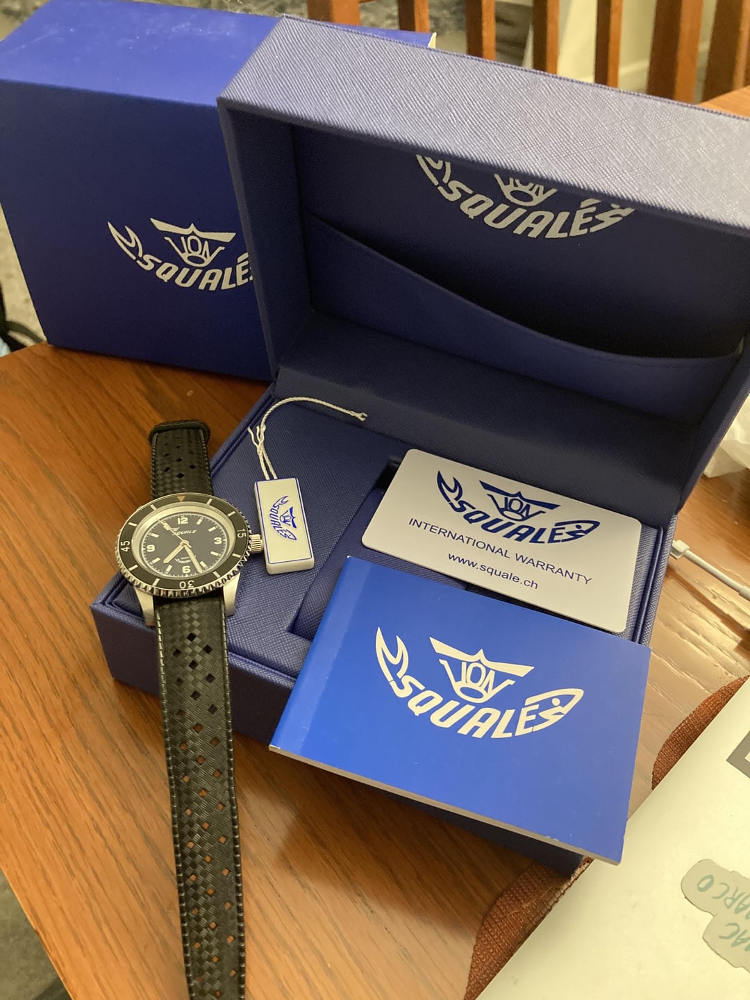 Hate to sell this one because it looks so nice, but I’ve worn it once (for a week) so I can’t justify the ownership. This is the second generation of the Montauk and the best looking in my opinion. Very light barely visible wear marks on the sides of case and back. $420 includes shipping (US) usps Movement: Swiss Sellita SW200-1 Automatic, standard grade Case: Polished and satin finish stainless steel, 38mm x 12mm thick. 46mm tip to tip. Back: Solid screw-in back Crystal: Flat Sapphire Crystal Band:Black rubber, 20mm Water Resistant:300 meters Weight:86 grams Here is a link to where I bought it from From, Long Island watch if you’d like more details. https://longislandwatch.com/squale-montauk-300-meter-swiss-made-automatic-dive-watch-with-black-sand-dial-mtk-11/ Thanks!