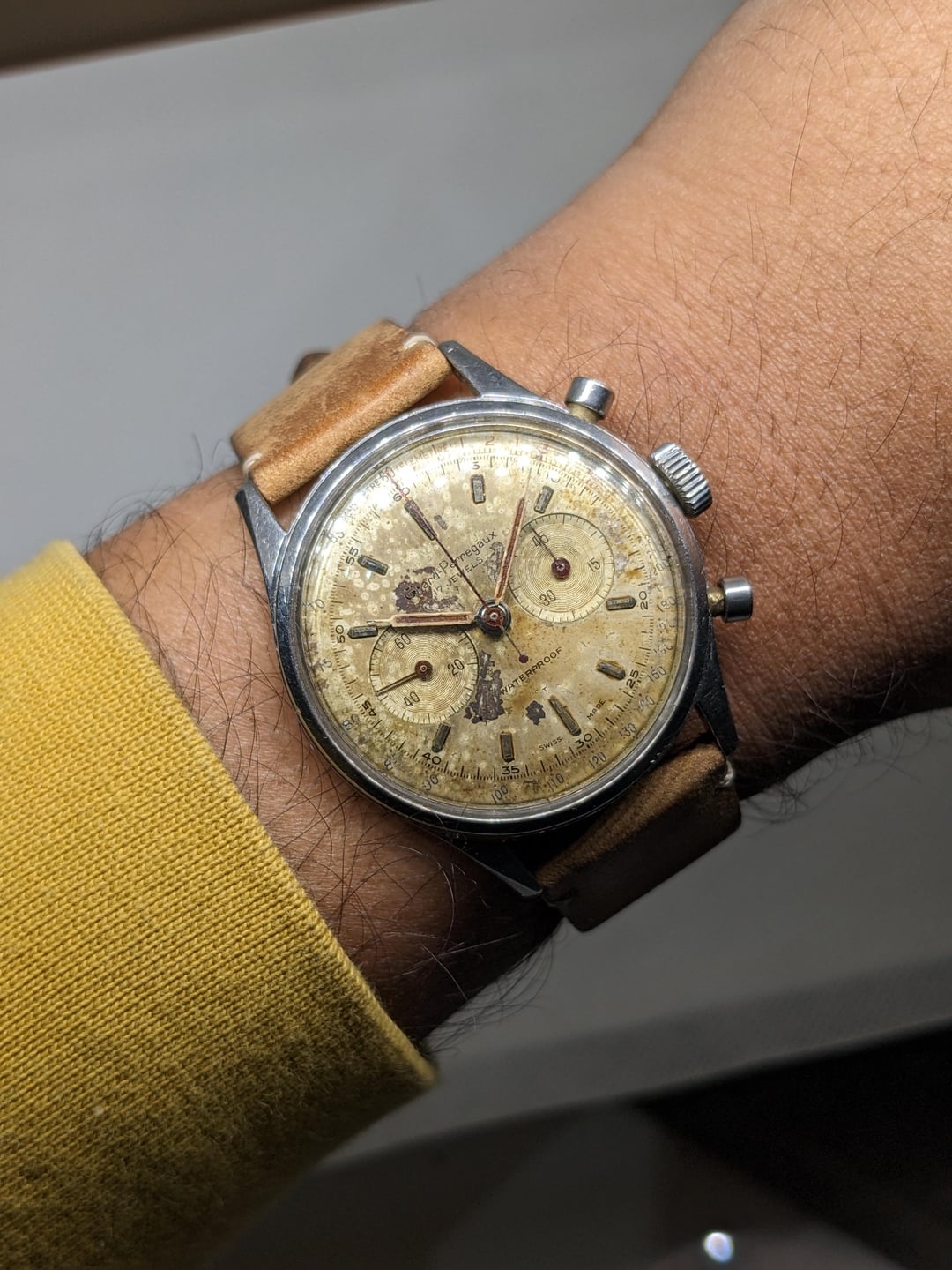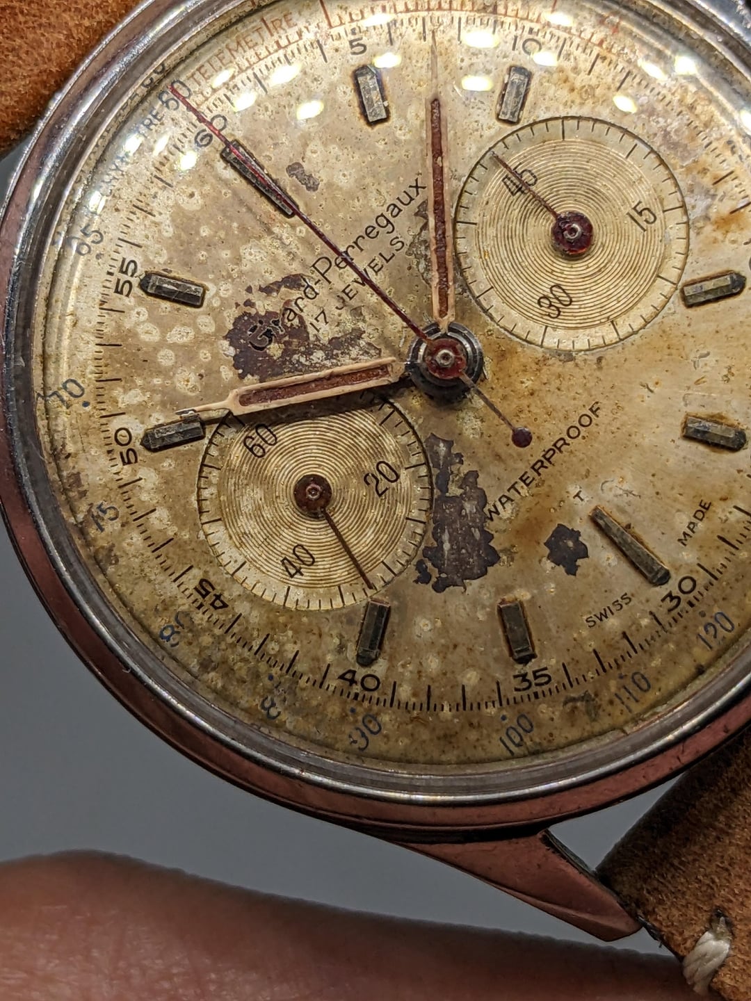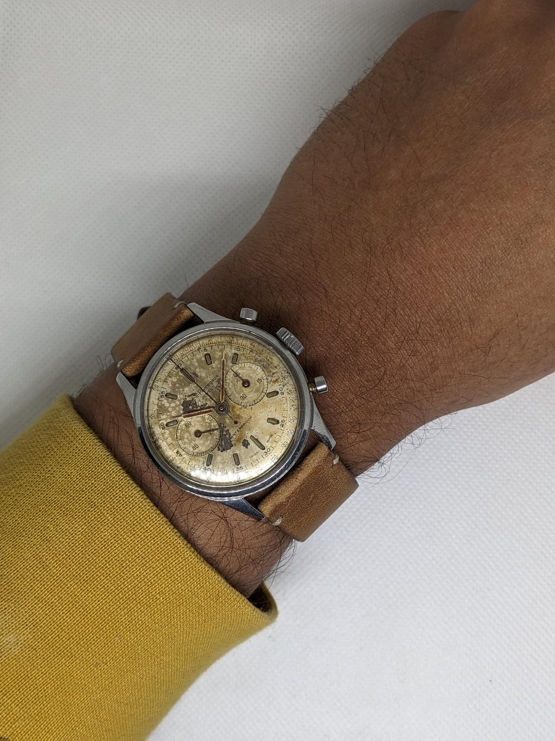 Timestamp in the end. For sale here is a Vintage Girard Perregaux Flyback Chronograph, with an in house caliber 0409 Manual Winding Chronograph movement inside. Case Diameter is 40mm including crown. The movement works very well. A video can be shared upon request. Buyer may wish to restore the dial and elevate it's look and value both as these are pretty expensive when fully ready. Case is unpolished. Priced to sell at $999 shipped via FedEx worldwide. I accept PayPal FF, Zelle, and Crypto. Thank you!