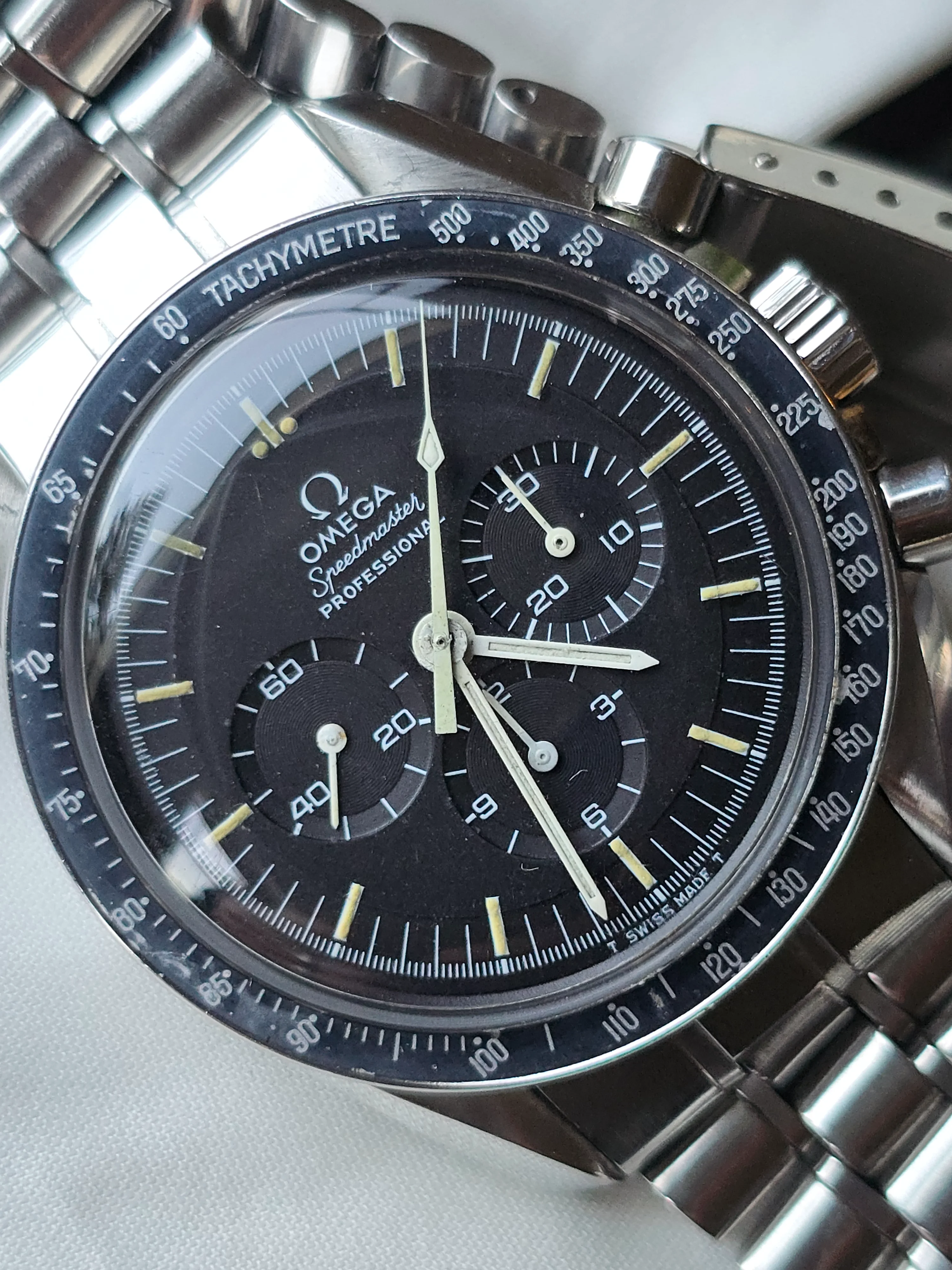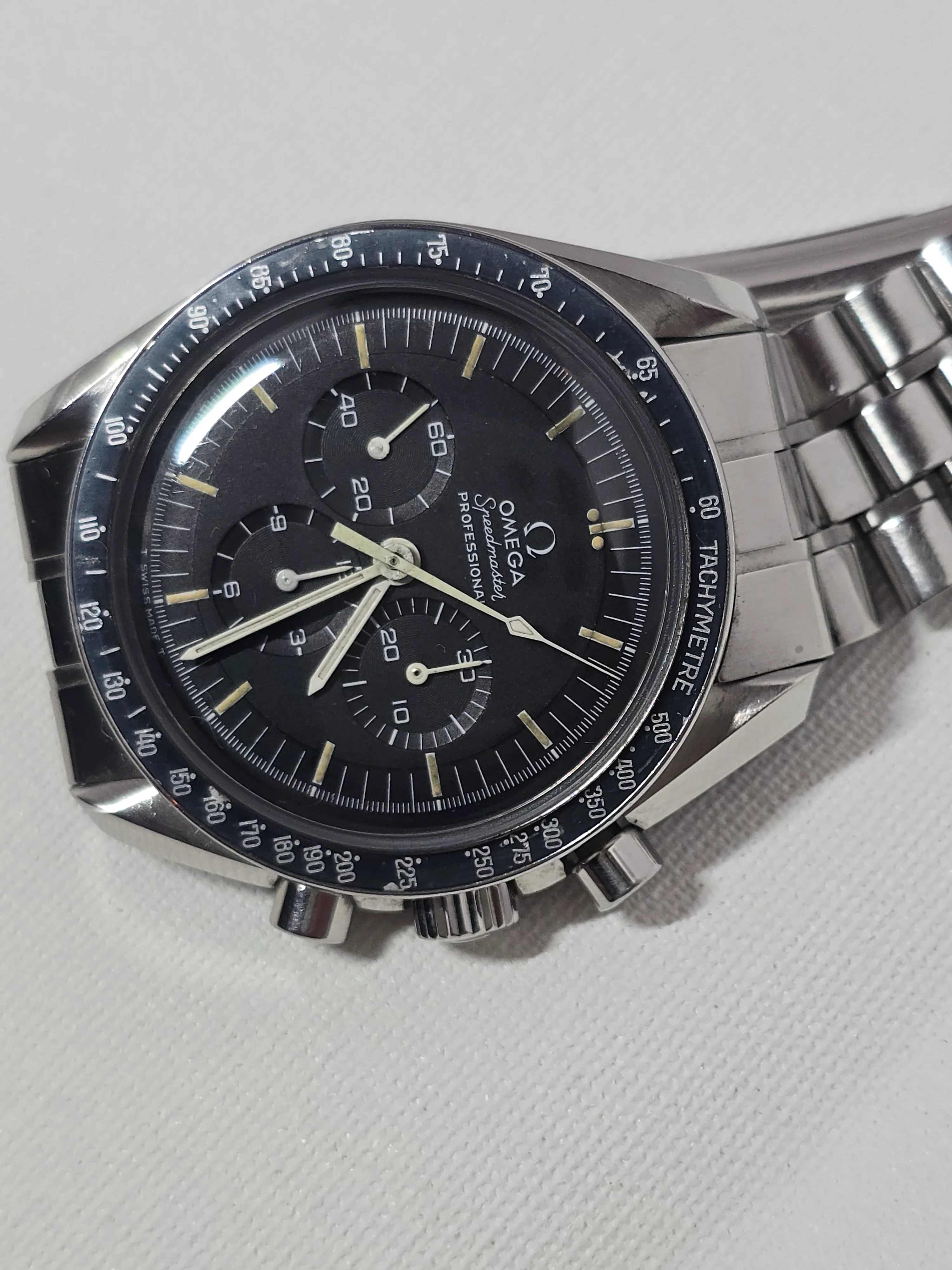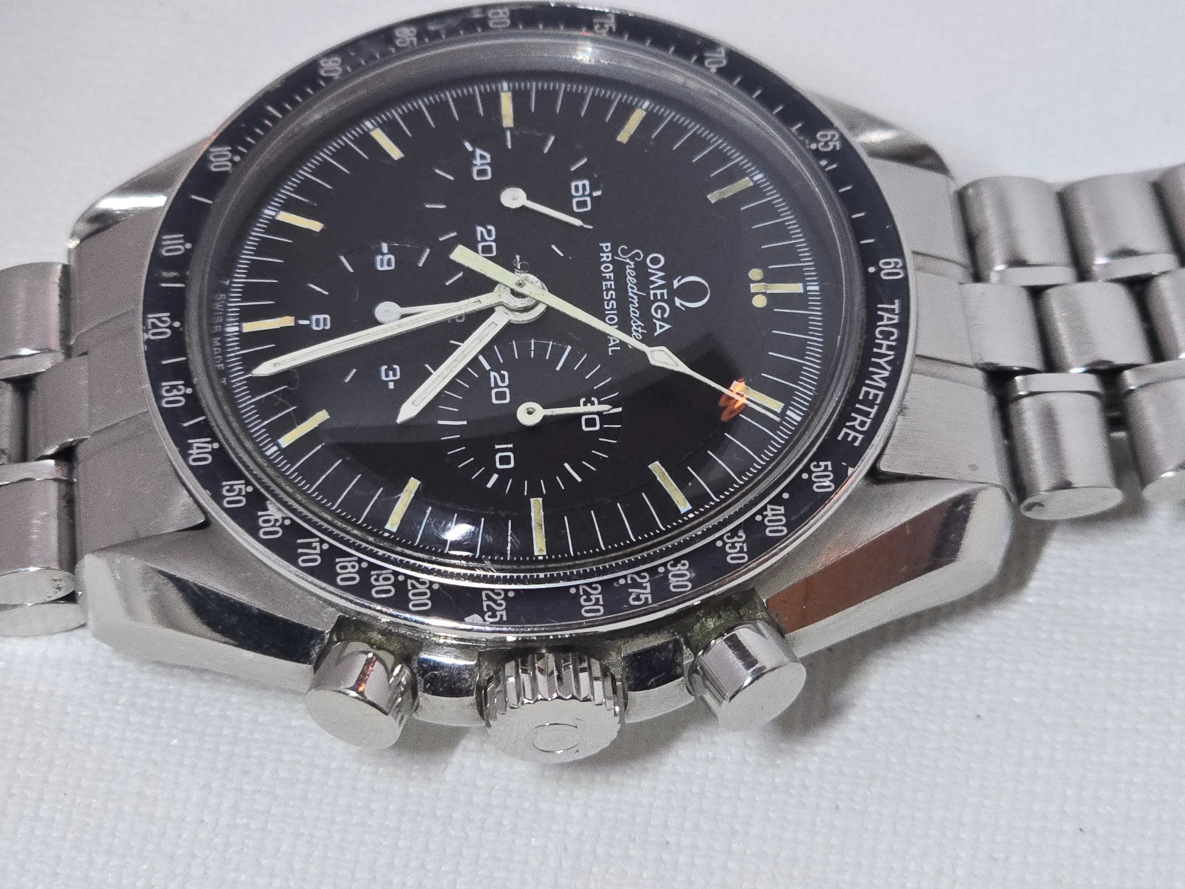 145.022-69 Speedmaster with straight writing Apollo XI caseback. Includes correct 1116 bracelet with endlinks. No accessories. Serviced Nov 2023.