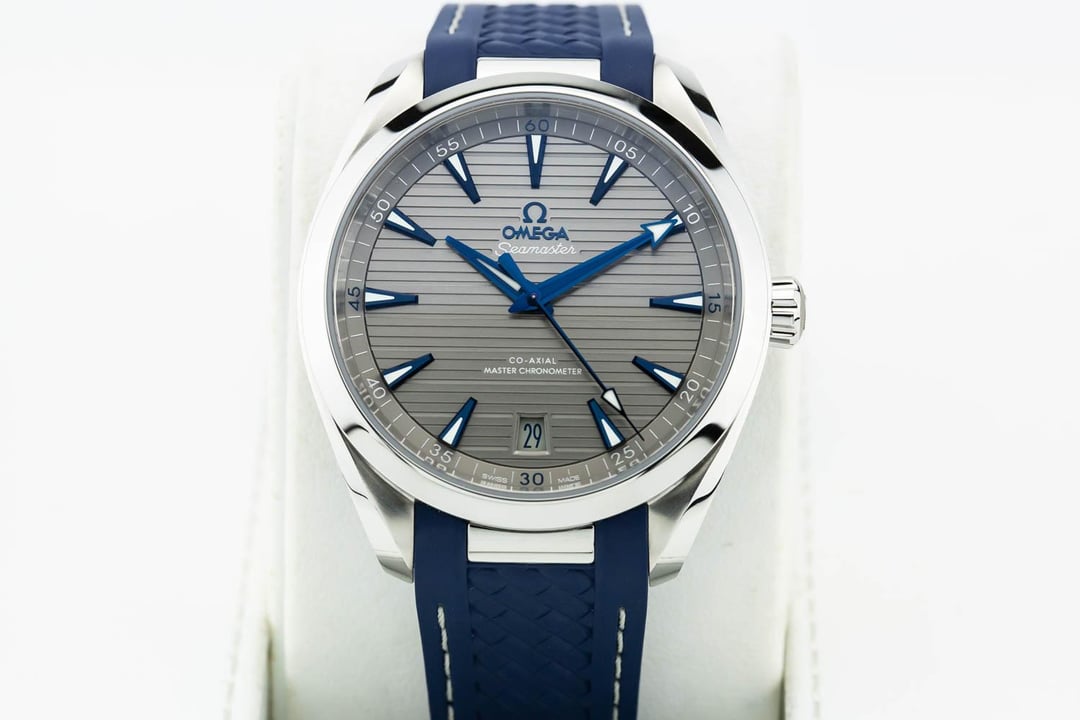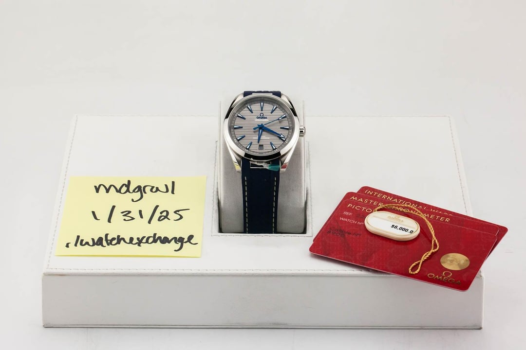 Up for sale is a brand new Omega Aqua Terra 8900 41mm Gray Dial on Blue Rubber Strap, reference # 220.12.41.21.06.001. It comes complete with all boxes, papers, booklets, hang tag and Omega Warranty Card dated January 2025. Brand New / Complete Set **Item Details:** Omega Aqua Terra 8900 41mm Stainless Steel Case Master Chronometer Movement **Timestamp:** [https://live.staticflickr.com/65535/54299190875\_292b35cd51\_b.jpg](https://live.staticflickr.com/65535/54299190875_292b35cd51_b.jpg) **Trades:** We are cash buyers and will consider all modern trades. **Payment:** Listed Price is for Bank Wire, Zelle or any no-fee payment method. Paypal is an additional 3.5%. **Price:** $4850 - Shipped 2 Day Air ! **Shipping:** Fedex Express within the US. International Shipping adds $150. **Returns:** Returns accepted within 48 hours of receipt only if the watch is misrepresented. **Contact:** Please email or text for fastest response. [[email protected]](mailto:[email protected]) or call / text 207-209-4000 Buying a watch on the internet can be scary. We know. You want an established business, accurate presentation of product, followed up by quick responses, and expedited shipping. We understand. That is why we deliver this along with honest, straightforward transactions backed by our well-built reputation. We are new to Reddit but have been selling on forums for many years, and have literally thousands of references. All photography is original. 6.625% state sales tax applies to New Jersey shipping addresses only.