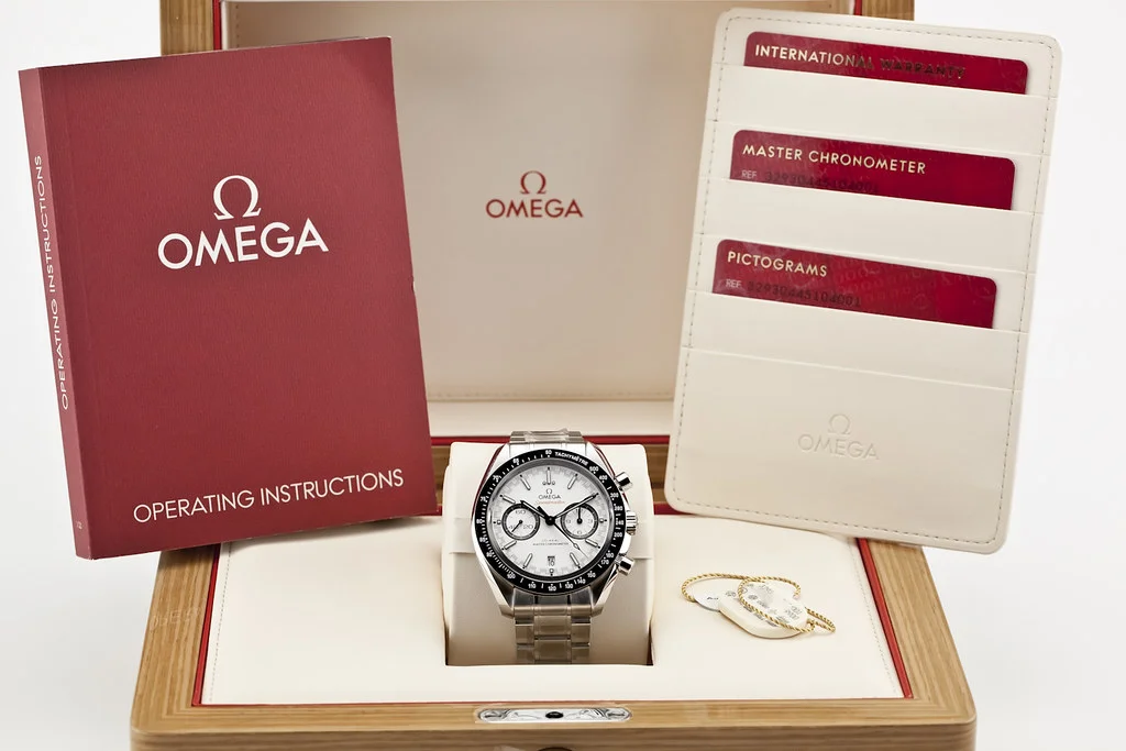 Up for sale is a brand new Omega Speedmaster Racing Master Co-Axial in White Dial, reference # 329.30.44.51.04.001. It comes complete with all boxes, papers, booklets, hang tag and 2025 dated Omega Warranty Card.
