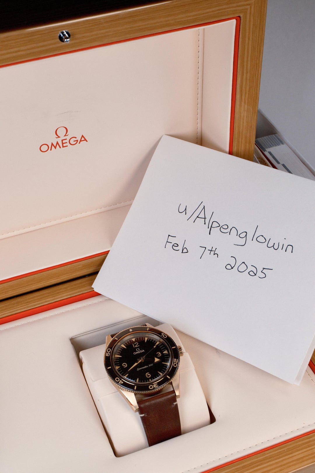Omega Seamaster 300 Bronze Gold This is the 41mm Heritage Seamaster 300 model with a beautiful bronze gold case and brown sandwich dial. It features the 8912 METAS certified movement with the jumping hour hand function. This watch is in excellent shape - there are very few hairline scratches on the case from desk diving. The sapphire crystal is flawless. The movement keeps excellent time and winds smoothly. The original 21mm leather strap has some slight signs of wear. Box and papers included. $6400 including shipping to CONUS. PayPal preferred. [Timestamp](https://i.imgur.com/aLX23AS.jpeg)