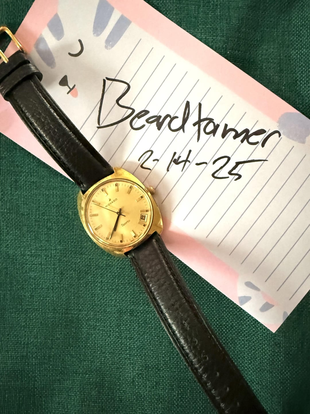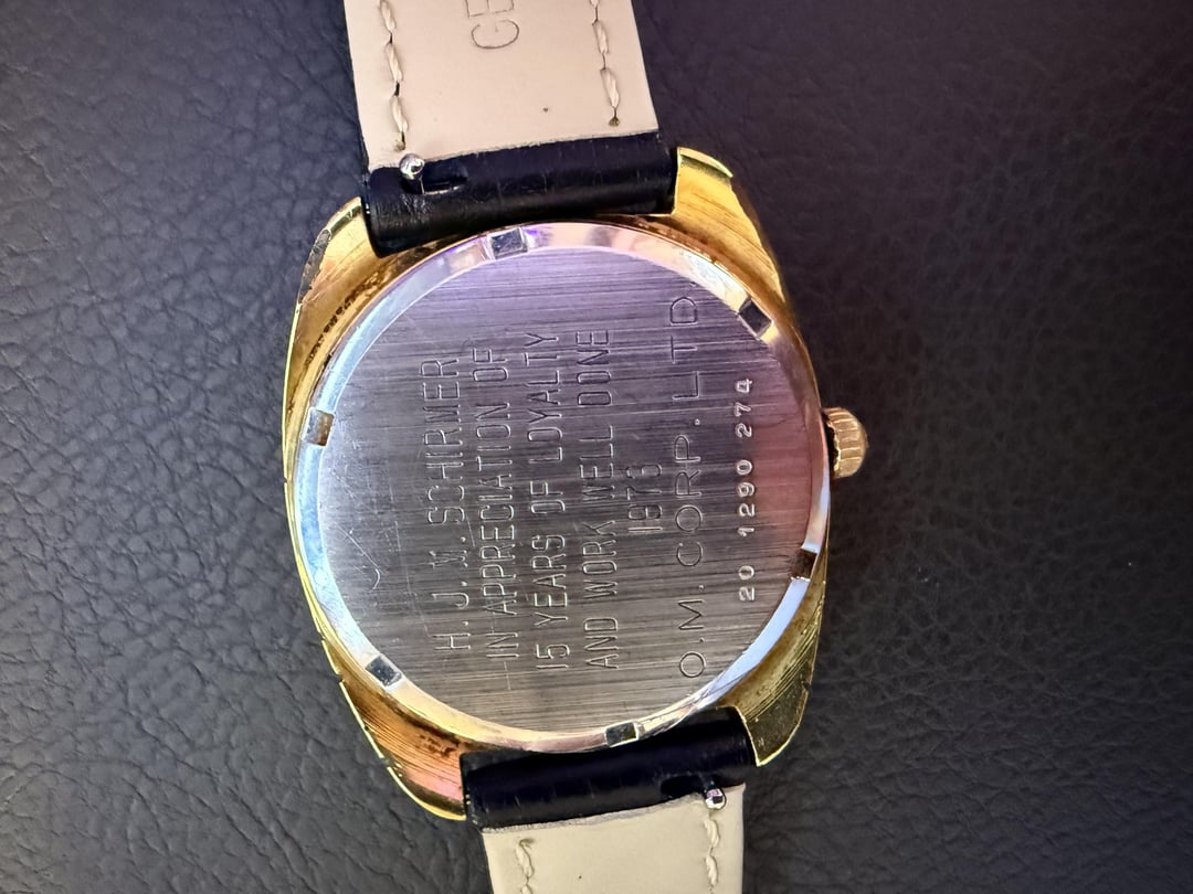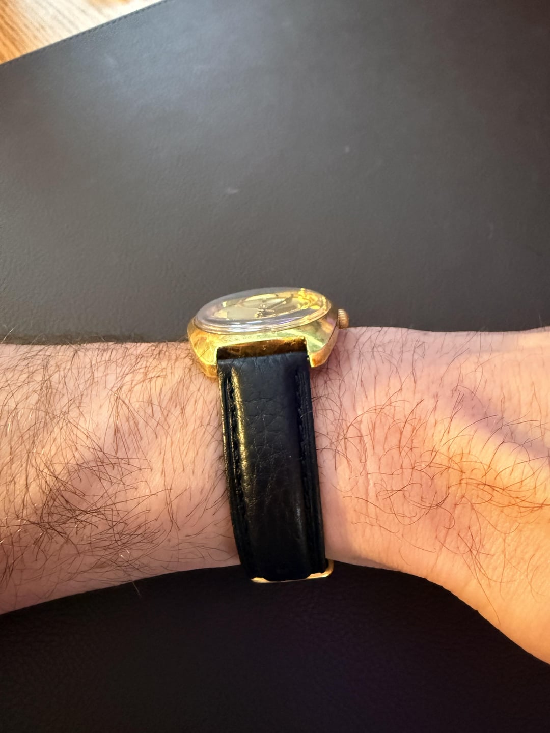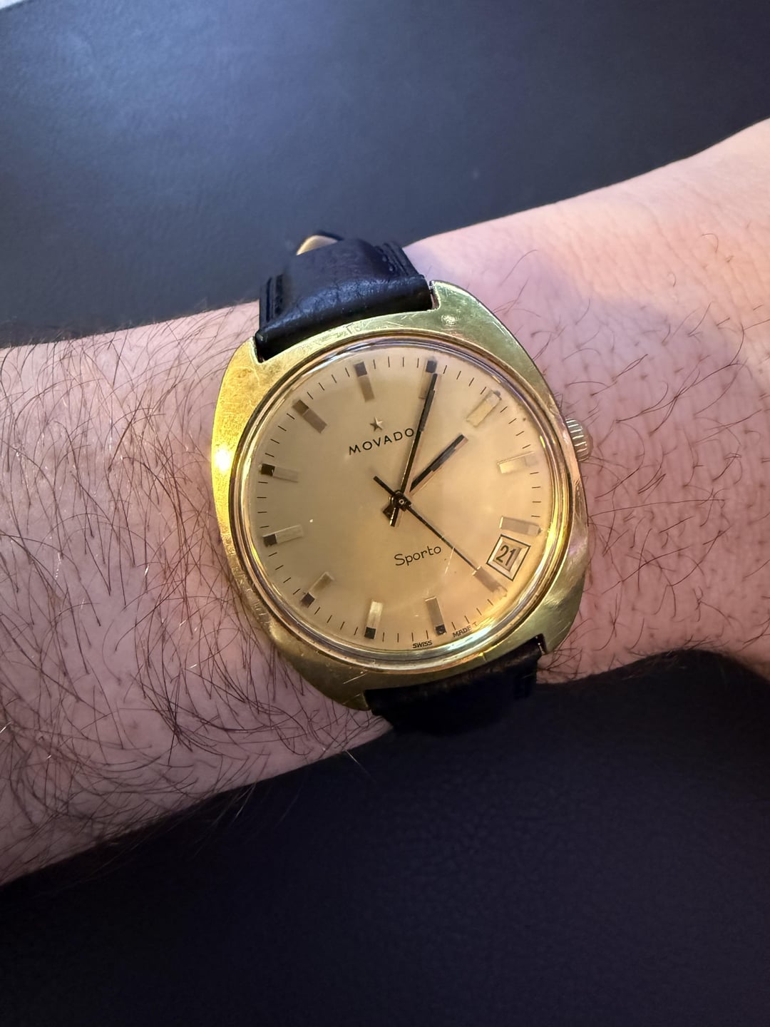 Hello! Up for sale is an interesting watch that has a lot of great history and a unique story. This is a Zenith Sporto. However, it’s a bit more complicated than that, because Zenith was actually rebranded as Movado for US imports in the 70’s. This is made more interesting due to the Zenith star logo, and the Movado name on the dial. It turns out, that in the 70’s, Zenith was looking to break into the US market, but had little to no brand recognition here. So, their best bet, they figured, was to use their recently purchased brand, Movado, to sell their Zenith watches to the American Market. So essentially, what you have here is a Zenith Sporto, from 1973, with the 2562c handwind movement, which is a very robust and outstanding vintage handwinder, inside of a gold plated Zenith case, but with the word “Movado” stamped on the dial, right underneath the Zenith logo. An interesting combination of watch history and marketing strategy. \------ So with that story out of the way, what we have is a great vintage piece, with a fantastic movement, that’s in pretty beautiful shape. The watch does have some pitting/scratching on the case, and on the underside of the lugs, there is even a bit of the plating missing. This watch has not been polished, and years of nice vintage “patina” gives it some great character. The acrylic crystal is new, and has no scratches as far as I can see. The only real nuisance on this one is that the crown looks a little funny, like the plating has worn off over the years of winding it daily. It functions great though. This watch is a 35mm case, but the classic C-Shaped case wears much bigger to me. My wrist is 7.2 inches for your reference, and I would say anyone with a wrist under 8 inches can easily pull this one off. The Caseback is engraved with a gift message, which reads: “H.J.M. SCHIRMER / IN APPRECIATION OF / 15 YEARS OF LOYALTY / AND WORK WELL DONE / 1973 / O.M. CORP LTD” \------- The watch comes on a new aftermarket black strap, with matching gold hardware. It will come with a watch travel pouch, but I have no original boxes or paperwork. It’s also running well for a watch from this long ago, averaging around plus 15, or so, seconds a day. The date flips over crisply at exactly 12am each day, and the movement looks and sounds fantastic. The servicing history of this is unknown, but it was told to me when I bought it, that it was serviced within the last 2 years, but I’m not going to tell you that I know that for certain. This is a harder watch to price, but I’m confident that it’s a great value at \*\*$250 shipped\*\* in the conUS OBO. I’ll take Paypal ff, zelle, or bitcoin if that’s your jam. I’m not really interested in trades at the moment, but if you have questions please let me know. Pictures and timestamp: [https://imgur.com/a/Oky14Lv](https://imgur.com/a/Oky14Lv)