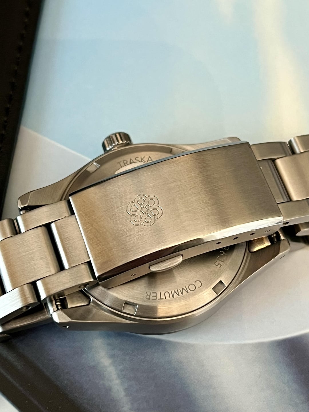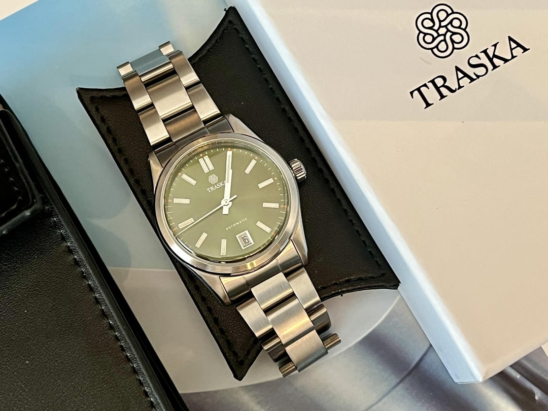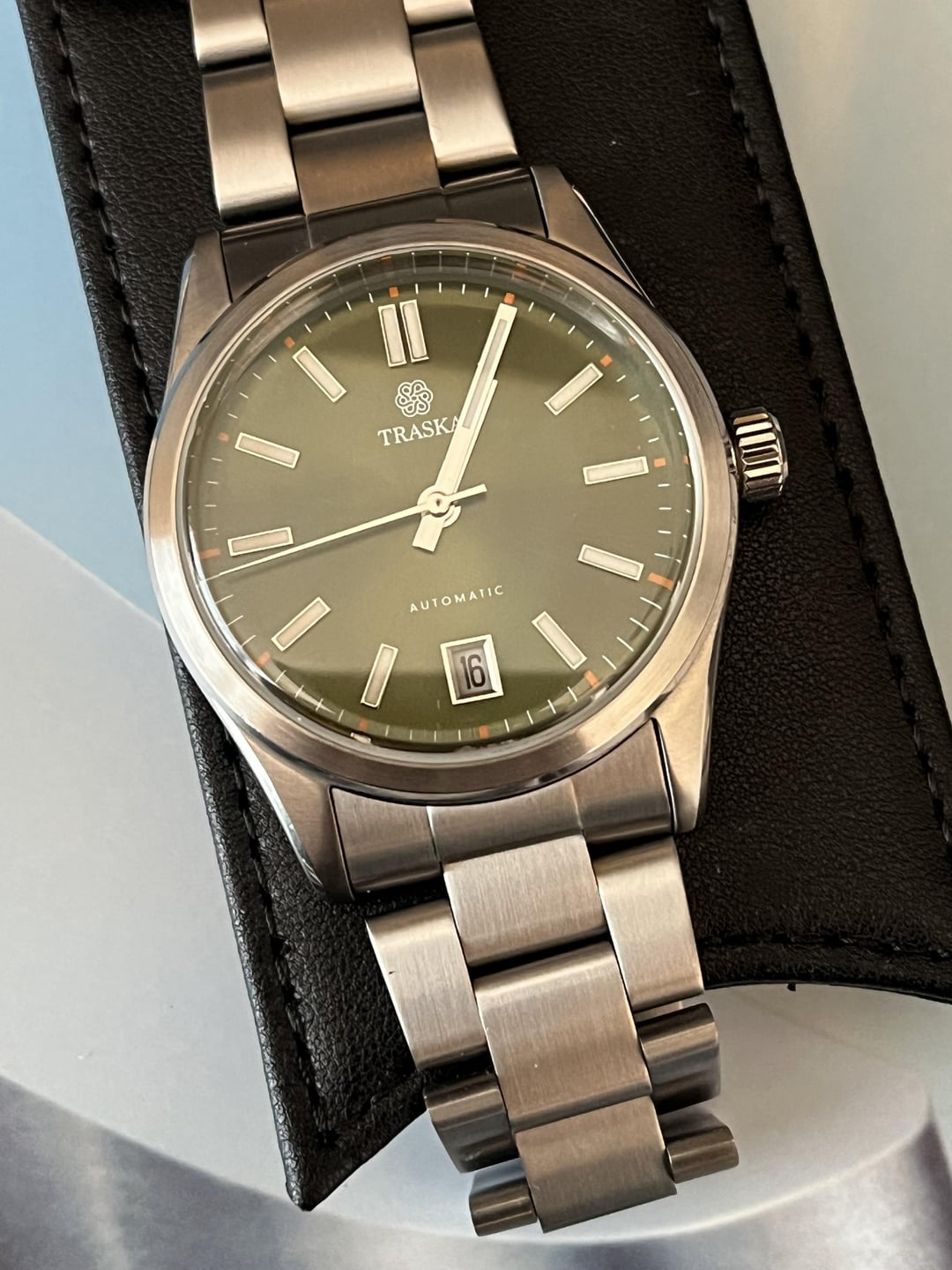 Traska Commuter 36mm Woodland Green Excellent Condition - leather pouch and inner and outer box. Fits my 7.5" wrist on bracelet. It is nice, just a catch-and-release, and I can't tell you much about Traska. I just had to try one—your turn. Pics and Timestamp in listing. $450 Shipped Conus Zelle or Venmo FF. No Trades. No Haggle.