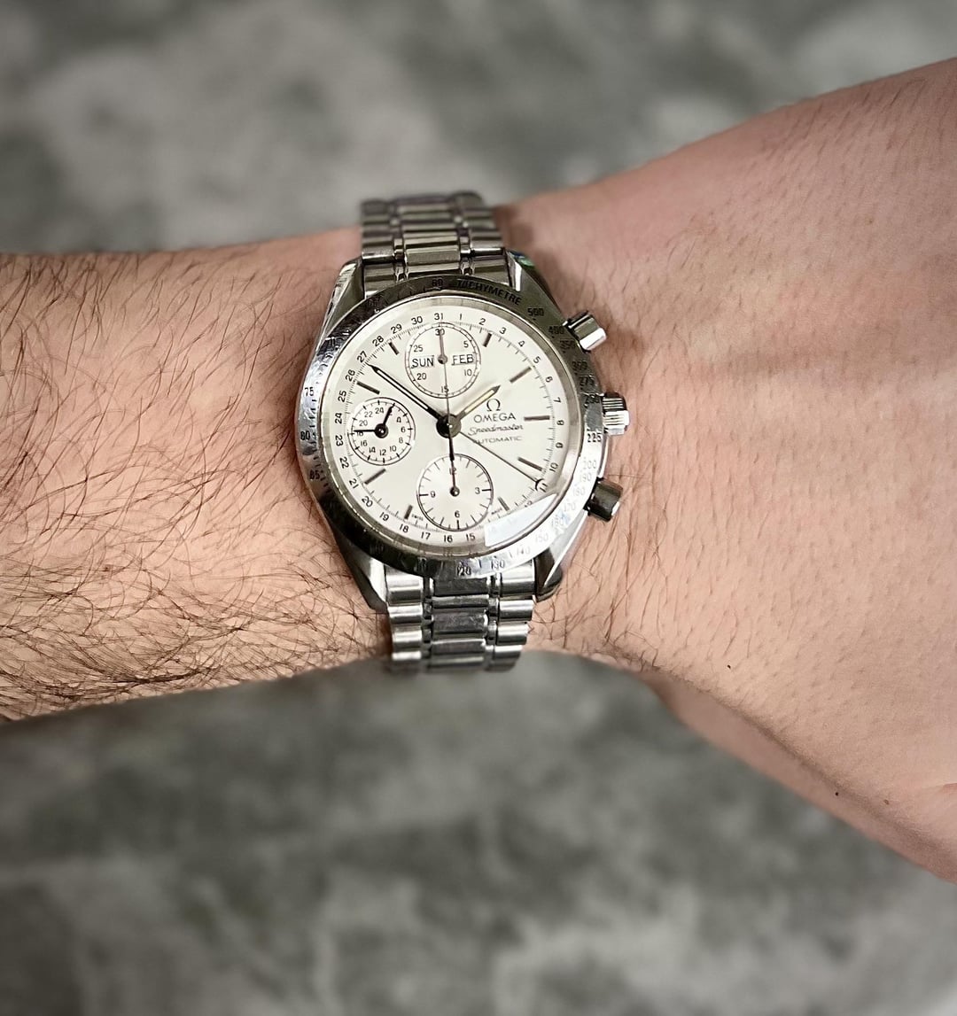 Up for sale today is a beautiful white 0mega speed master “Triple Date”. It comes as watch only. It’s in overall very good condition for its age with some normal wear on the case bezel and bracelet. Please refer to the pictures. No service history but keeps good time and the Chronograph works as it should. The nickname comes from the 3 date complication this watch has, showing the day, date and month. The day and the month are shown in the upper center and the date is shown by the half moon hand that goes around the dial. It’s one of my favorite reduced versions of the speed master. Timestamp: [Here](https://imgur.com/a/kzoivih) Reference: 3521.30 Size: 39mm Movement: 1150 Accessories: N/A **PRICE: $1650 + shipping** IG: [old_country_timepieces](https://www.instagram.com/old_country_timepieces?igsh=amxmZzNoZnQ3bTh5&utm_source=qr) FB: Old Country Timepieces Method of payment accepted: Zelle/Wire I’m located in Cleveland, OH. Local face to face deals are possible. I ship fully insured nationwide. International shipping is possible upon agreement on extra fees. Please check out my other watches for sale on my profile. Plenty of references. Don’t see what you’re looking for? Please message me as sourcing might be possible. Thank you!