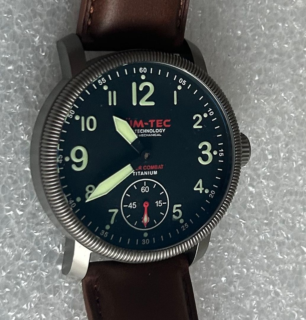 This watch is hand made in Ohio, and features a forged and heat treated titanium case that is 45mm w/o crown, 13mm is the thickness and has a 24mm lug width.