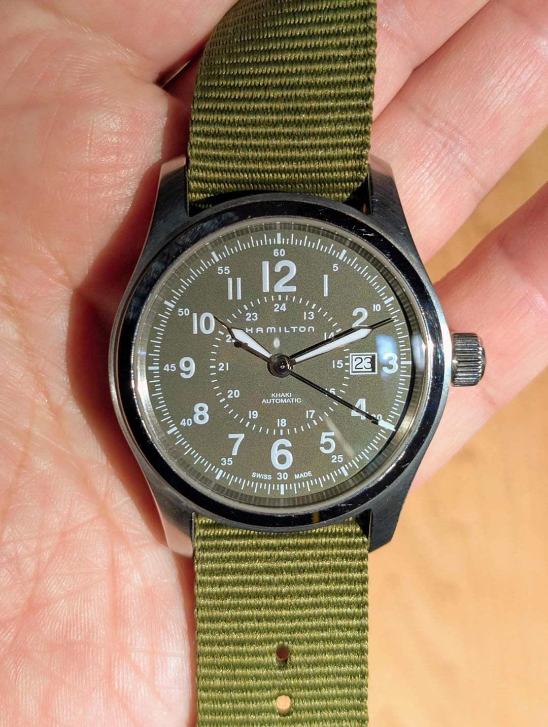 Hamilton Khaki Field in Green * H706050 * Automatic * 42mm stainless steel case w/ exhibition back * military / khaki green dial, which looks like green or brown depending on the light * green nato strap * **$360 shipped** in the ConUSA, PPFF or Venmo, or you cover fees