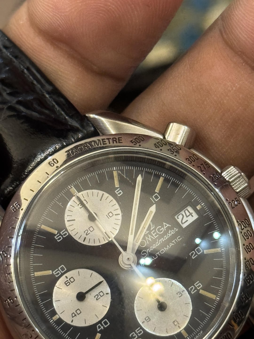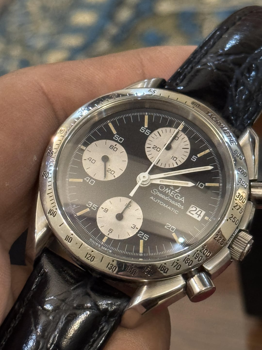 Omega Speedmaster Reverse Panda 3511.50 Featuring a 39mm reverse panda dial with pumpkin lume markers. The crystal has a scratch near 1 pictured, the automatic movement with an unknown service history runs and keeps time. Comes on an aftermarket leather strap. Comes as watch only Price: 1280$ through Zelle or wise or usdt shipped fedex conus Requests for custom timestamps and FaceTime are welcome