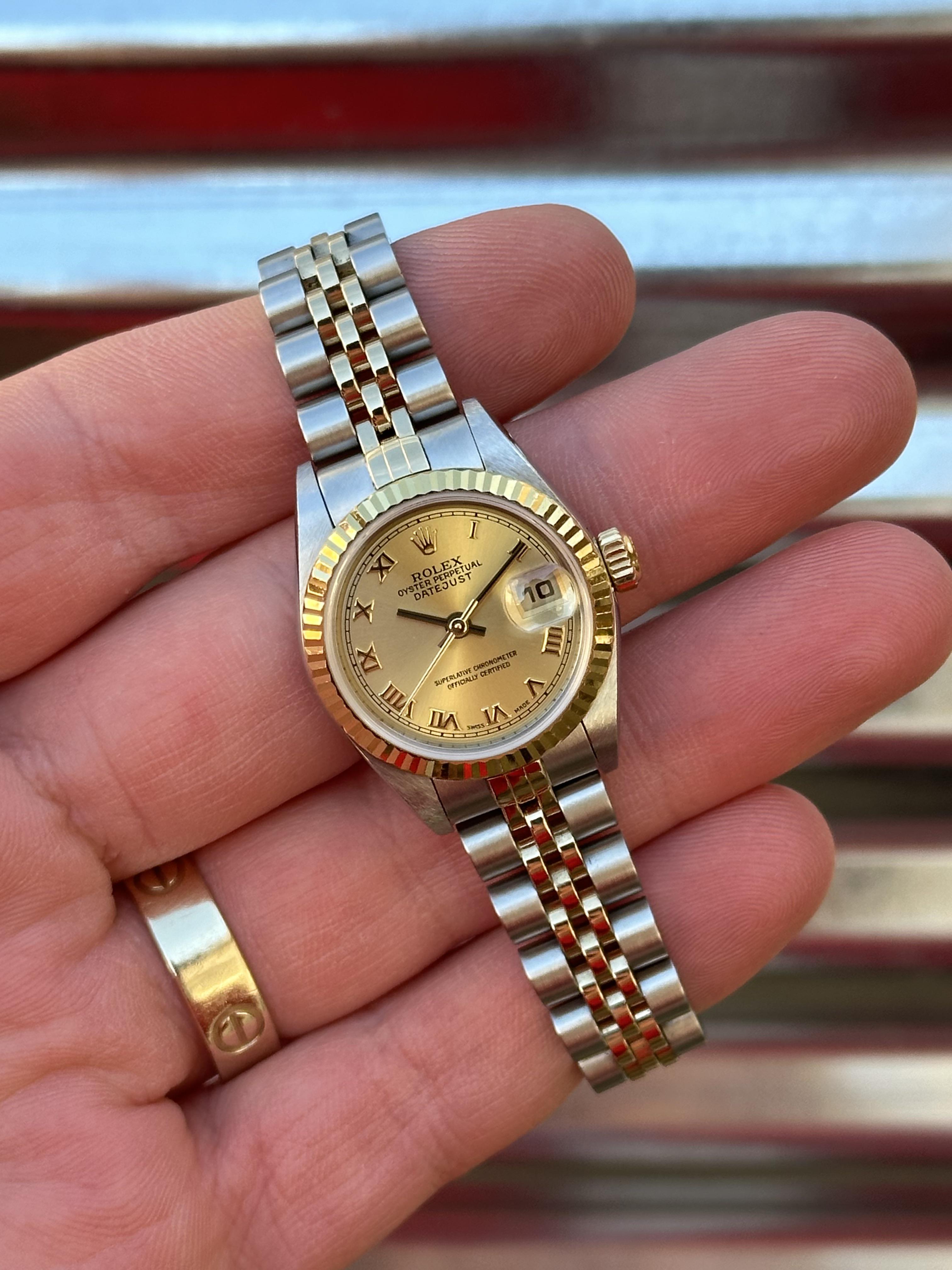 Available is a ladies two-tone 26mm Rolex Datejust Reference 79173 with a Champagne Roman Numeral Dial-on a jubilee bracelet and an 18k gold fluted bezel. Comes complete with Box & Papers. Ref. 79173 Case size: 26mm Serial: P*** dating this watch to 2000 Papers stamped sold September 2001. COMES with BOX & PAPERS, booklets, hands tags (please see second photo for everything that’s included) 💰4️⃣7️⃣5️⃣0️⃣+✈️ Overall this watch is in excellent pre-owned condition. The champagne roman numeral dial and hands are clean. Case geometry is intact with thick lugs, clean high polish surface on the sides of the case. The 18k gold fluted bezel is well defined and free of dings. Tight bracelet with no stretch. Sharp looking dial, not overly complicated, giving this watch a clean and elegant look! 20 links total on the bracelet Fits about a 6.75- 7 inch wrist. 💰4️⃣7️⃣5️⃣0️⃣+✈️ We accept Zelle/Wire as payment. Overnight fully insured shipping once payment clears, NO EXCEPTIONS. I have plenty of references across different platforms so buy with confidence. Follow our instagram page @215Watches Thank you for your time! [photo album](https://imgur.com/a/hkjVznp) [time stamp](https://imgur.com/a/zatSLeX)