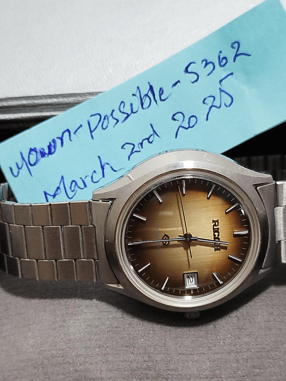 Vintage Ricoh Riquartz beautiful brown sunburst dial datejust in a very good and working condition. Watch has battery has been replaced recently by a professional watch maker and checked all functions are in working condition with accurate time keeping. \- Accepting PayPal F&F or G&S (5% Fee Applicable) - Bank - Crypto \- Shipping Via UPS Insured ( Paid by Buyer ) Please comment before sending a PM according to the community's rules . Feel Free to ask any question or if custom photo's or timestamp needed, i'll be happy to provide as much details as i know . Have a Great Day!