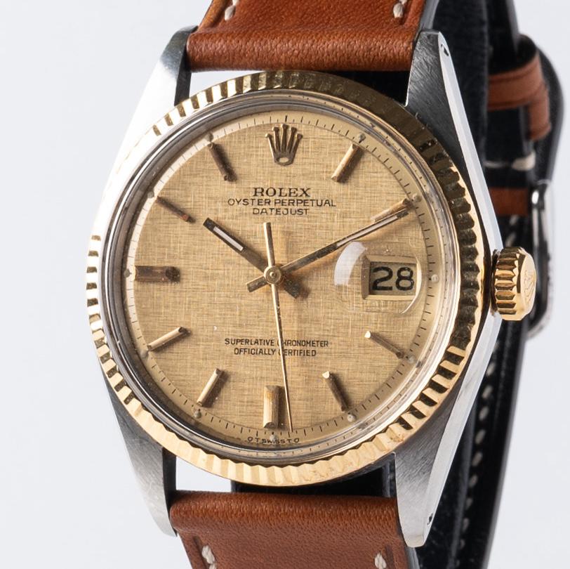 1973 Rolex Datejust 1601 Champagne Linen Dial $3,550 This reference 1601 in two tone in champagne linen has the unique step or pie-pan dial that was unique to 4-digit datejusts and daydates. Some pitting on the serial side of the case, which is fully legible under a loupe. Hands are service replacements and still glow. The watch is in good vintage shape for its age, and comes on a brown leather strap. Serial - Year: 3.28 serial ~1973 Bracelet - Strap: generic brown leather strap and buckle Box - Papers - Accessories: Watch only Service History: Unknown. Running at -5s/d, 262 ampltiude Pictures https://imgur.com/a/1601-mosaic-7AUYbN4 Timestamp https://imgur.com/eOEsFJP Watches will be shipped via FedEx upon receipt of bank wire only. Sorry, no P2P payment platforms due to scams. Zelle with references. Prices are for an outright purchase, no trades preferred. **Inquiries:** [Instagram](http://www.instagram.com/angelcitytime), PM or chat Member of r/watchexchange for years. Excellent references on other platforms and forums which I can provide upon request. Please buy with confidence. All sales are final. Thanks for looking!