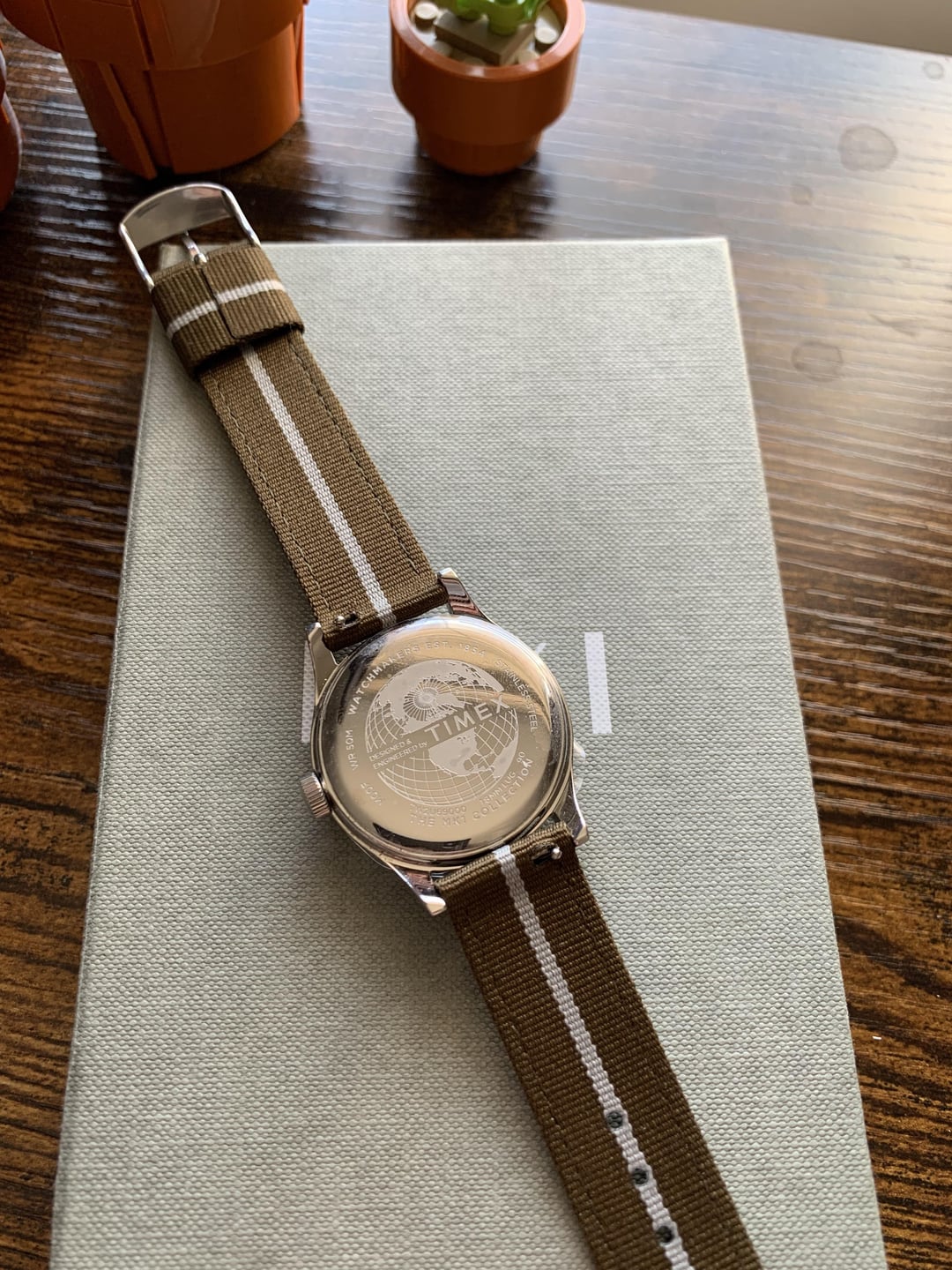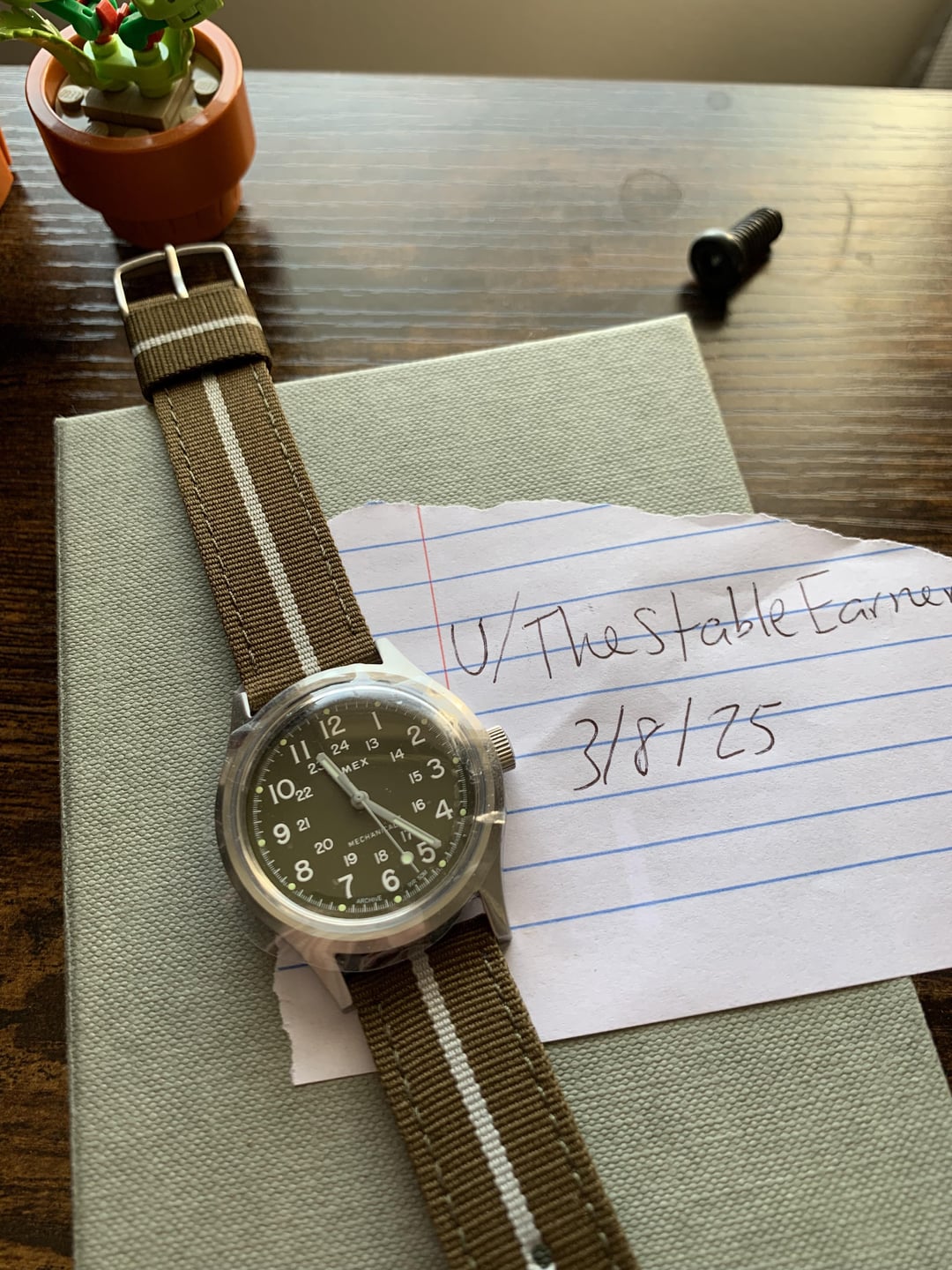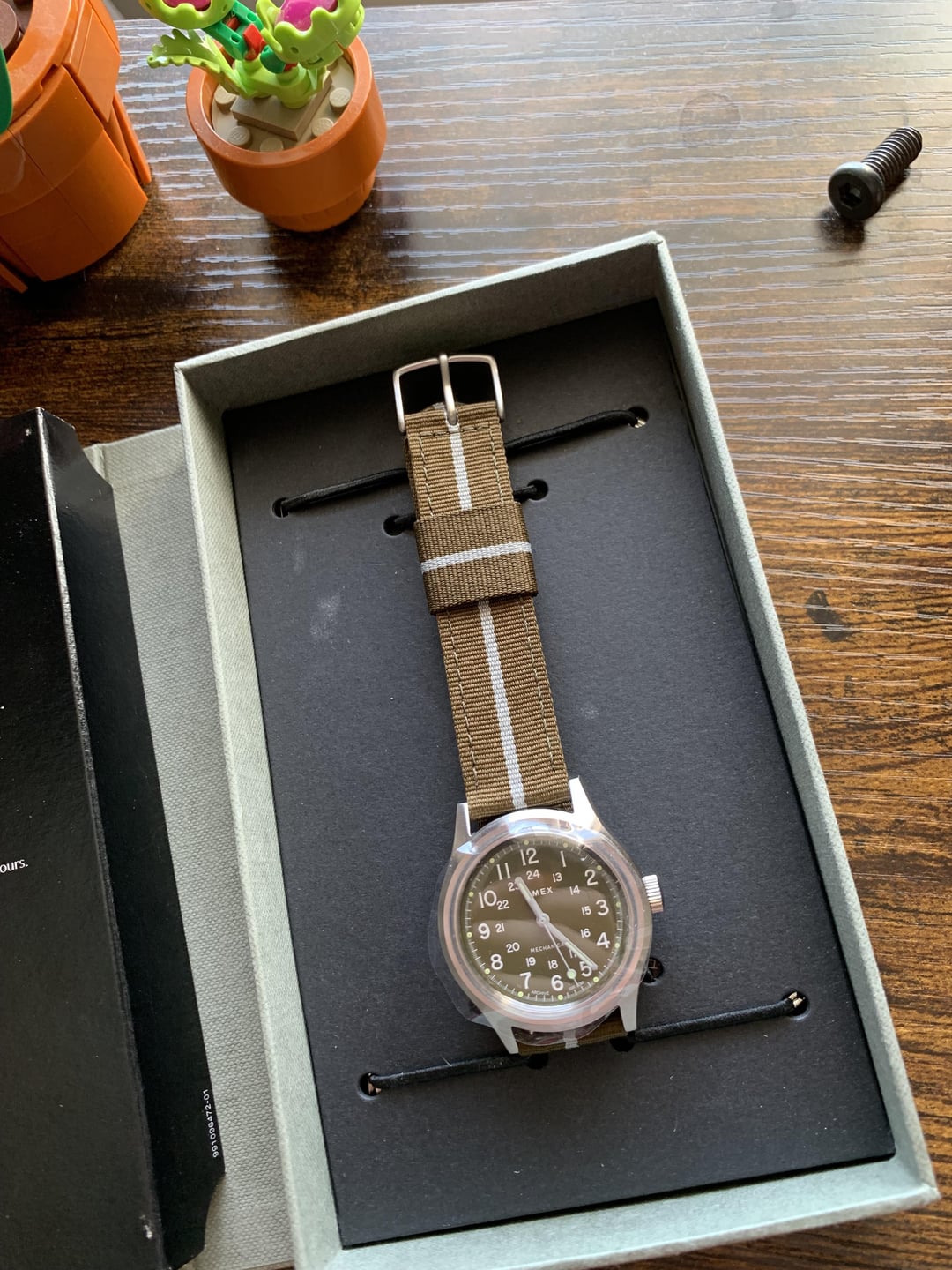 Hello everyone! I’m posting my vintage inspired Timex archive series MK1 mechanical! This is a hand winding watch with a beautiful olive green dial. It honors a military field style and comes in a cool diary like box. These watches are starting to become harder to find. I’m still using the same timestamp for ease but if someone needs an updated on or anything else just lmk! What’s included and condition: The watch is in brand new condition and still has the plastic stickers on the front and back case. The box and original strap are included and also in great condition. Dimensions: This watch is suitable for almost anyone as it has around a 36 mm case! And 10mm thickness Price and shipping: I am pricing this piece at 158 OBO including shipping within the United States. PayPal and Zelle. Don’t be afraid to make me an offer! Thanks for looking!